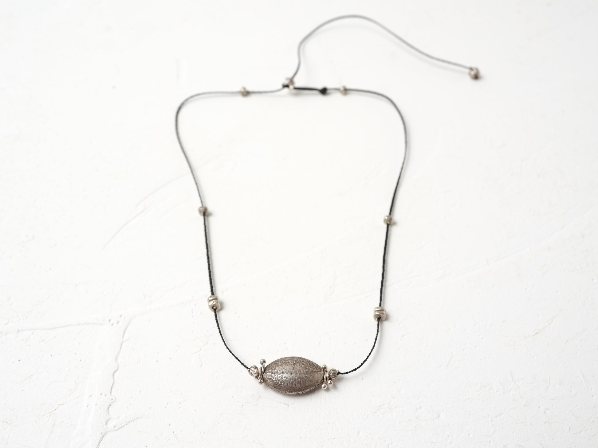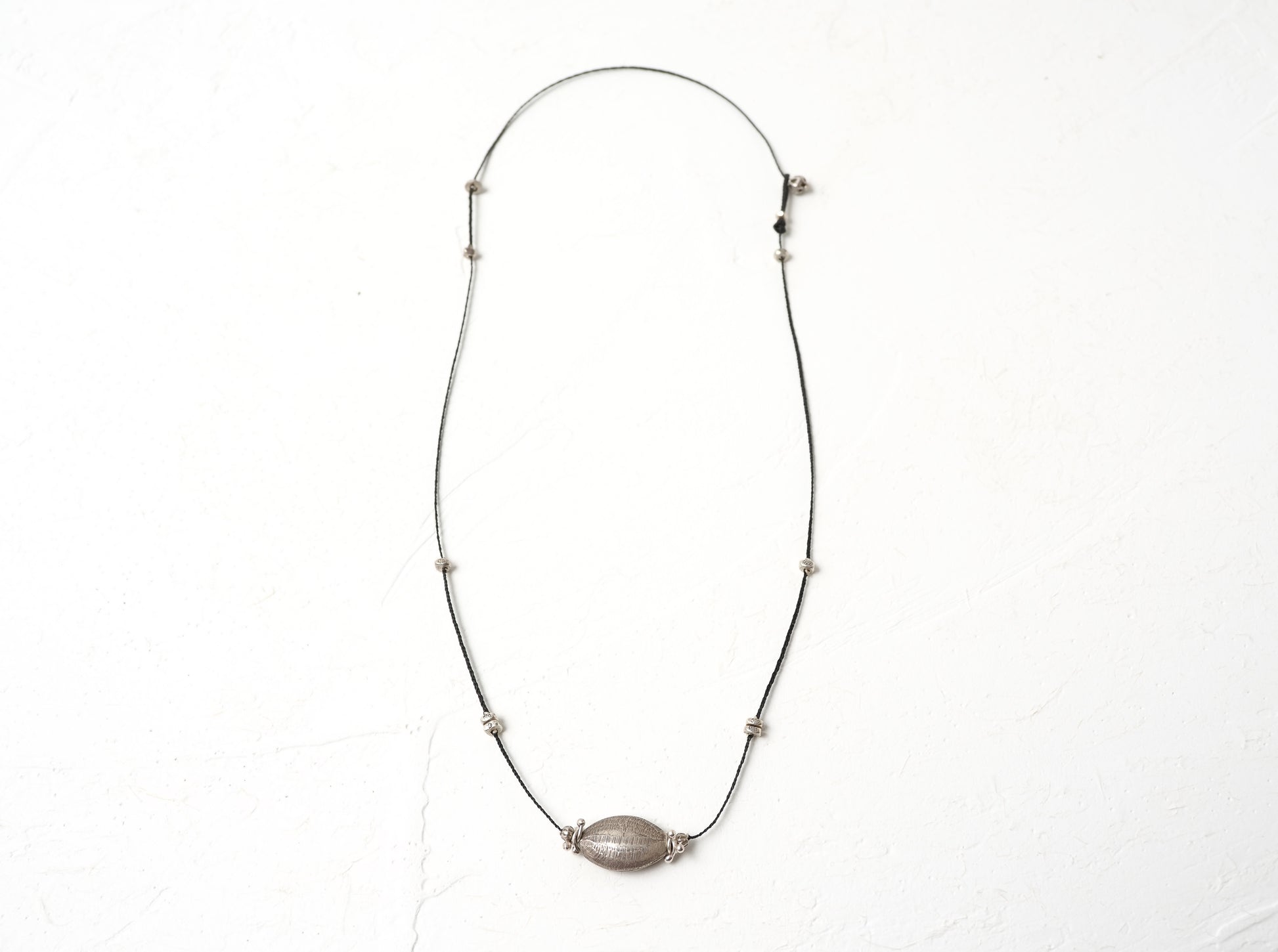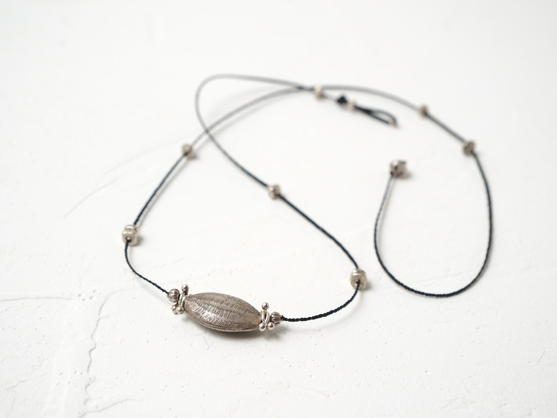 アーモンドの様な形のシルバービーズをセンターに細かなシルバービーズを散りばめ、スッキリと洗練された印象の編み紐ネックレスに仕立てました。