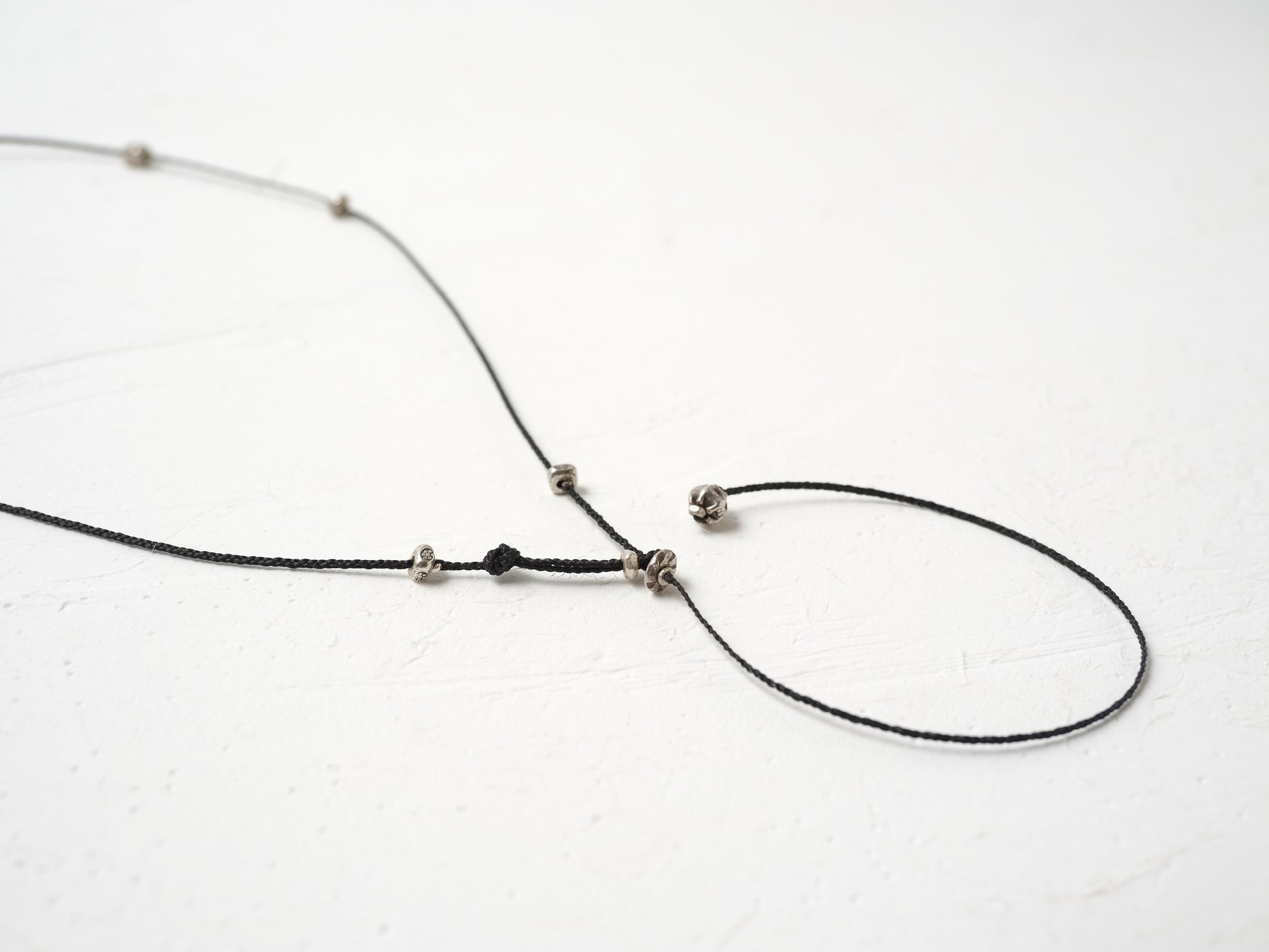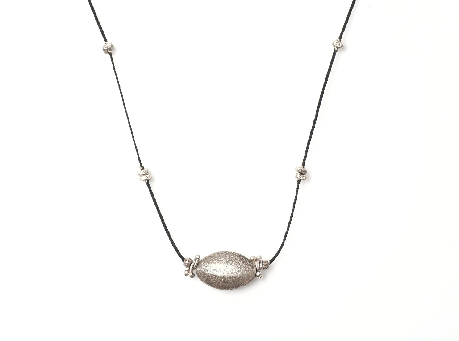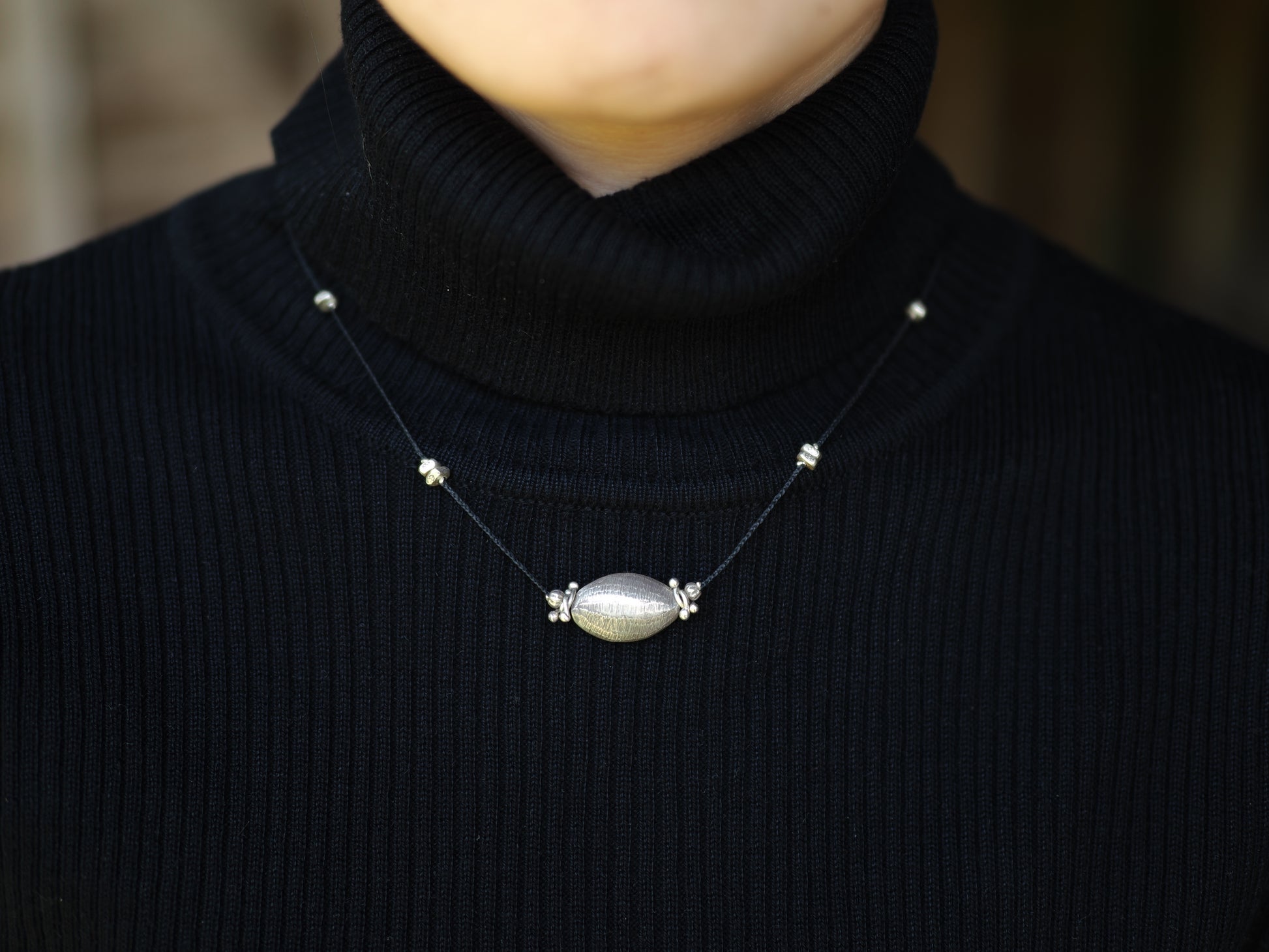 アーモンドの様な形のシルバービーズをセンターに細かなシルバービーズを散りばめ、スッキリと洗練された印象の編み紐ネックレスに仕立てました。