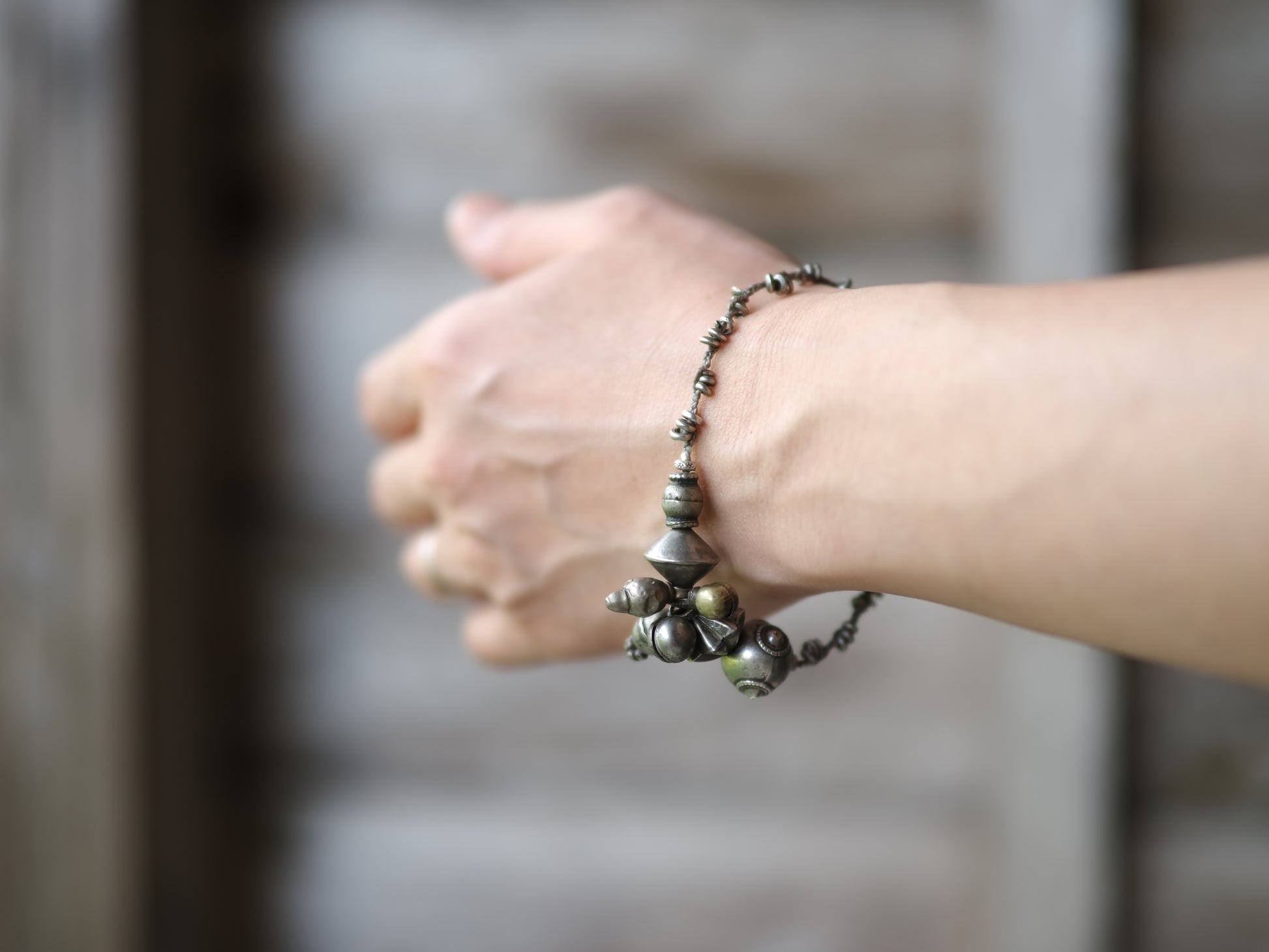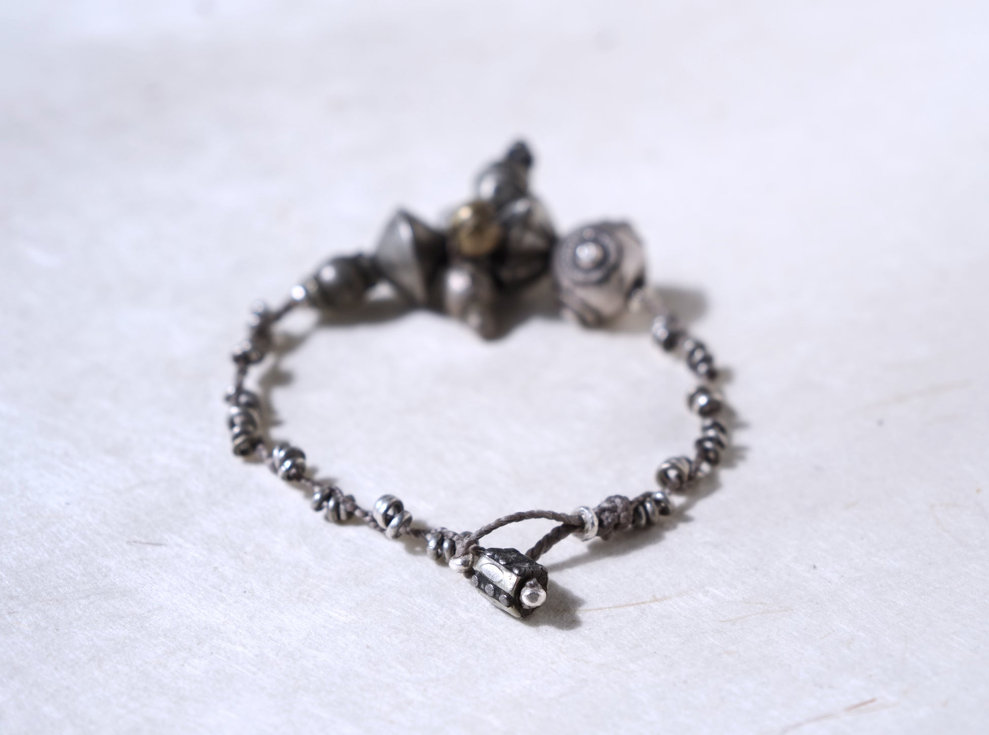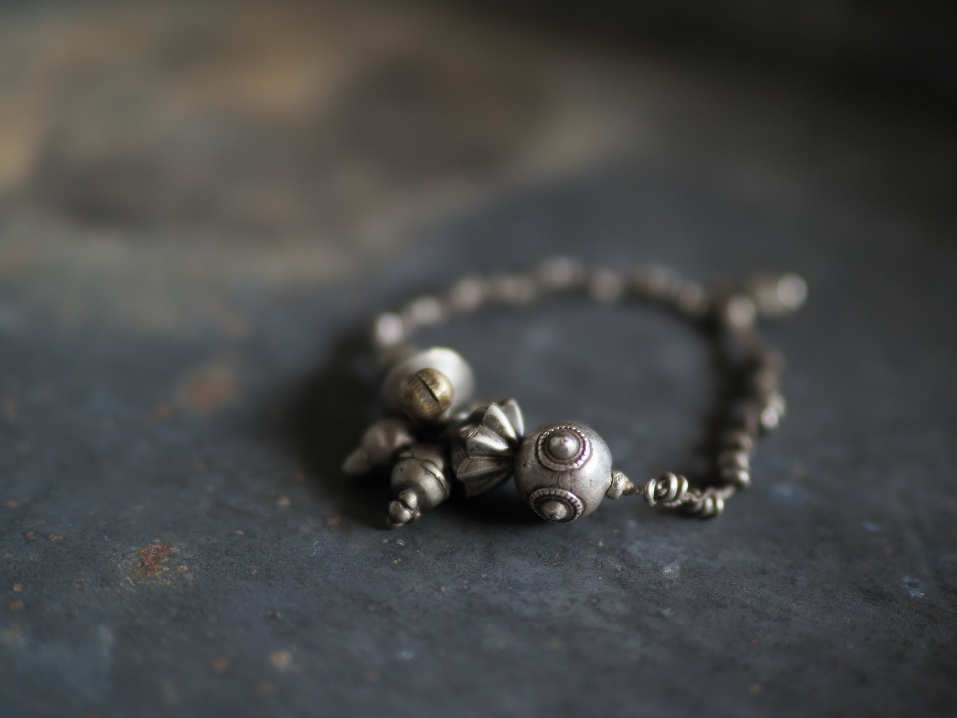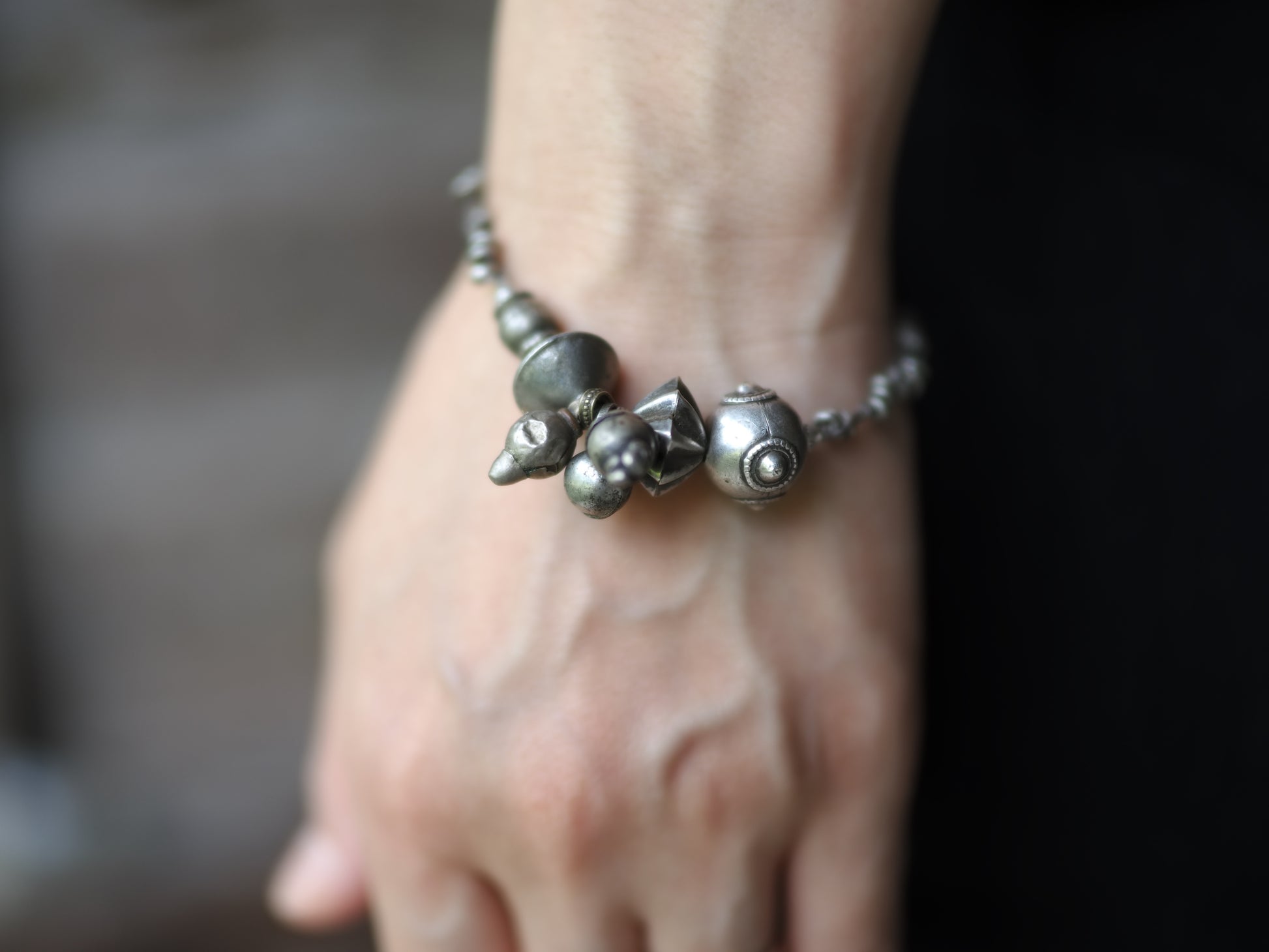 一粒一粒が個性的で深みのあるオールドシルバービーズを組み合わせ、装飾感のあるブレスレットに仕立てました。