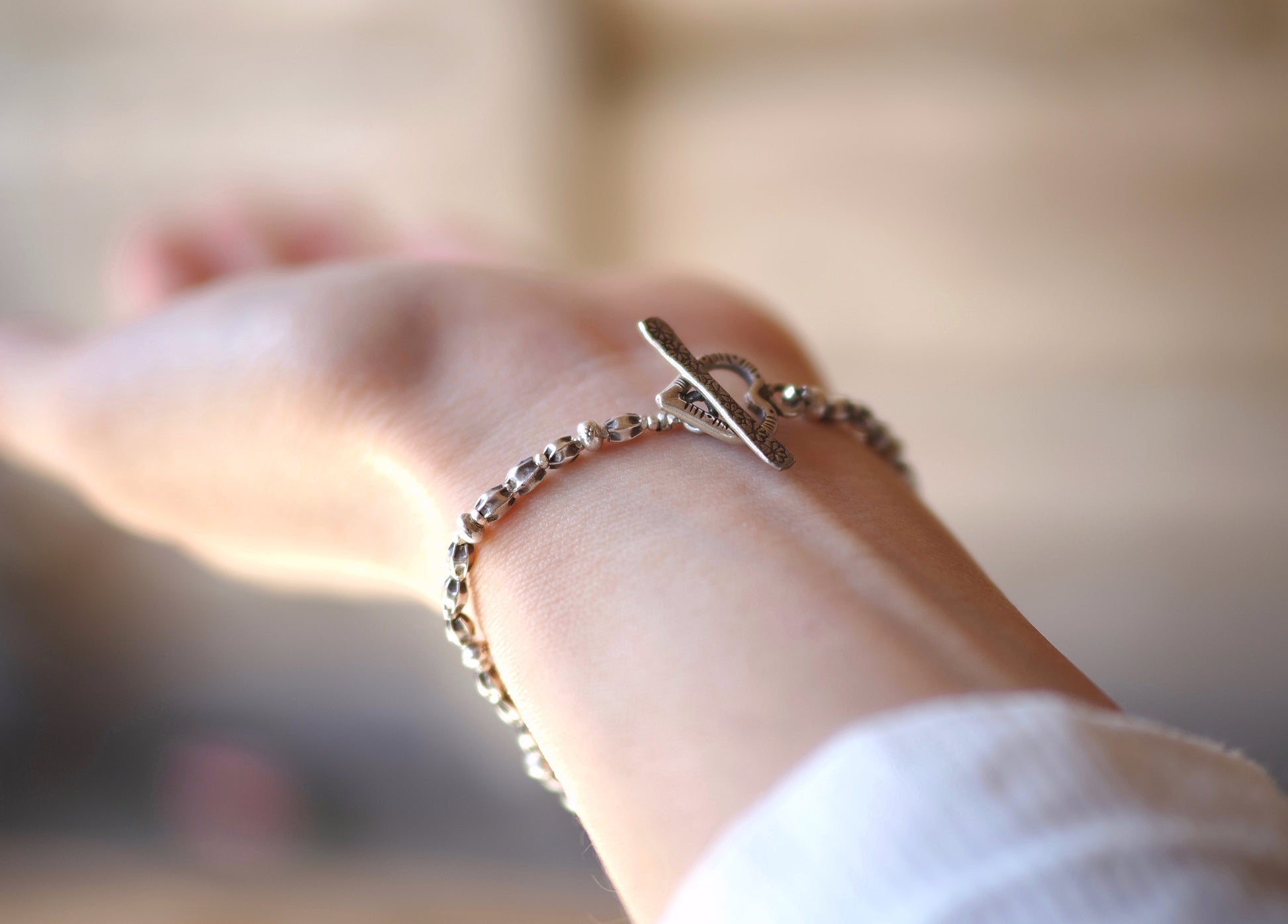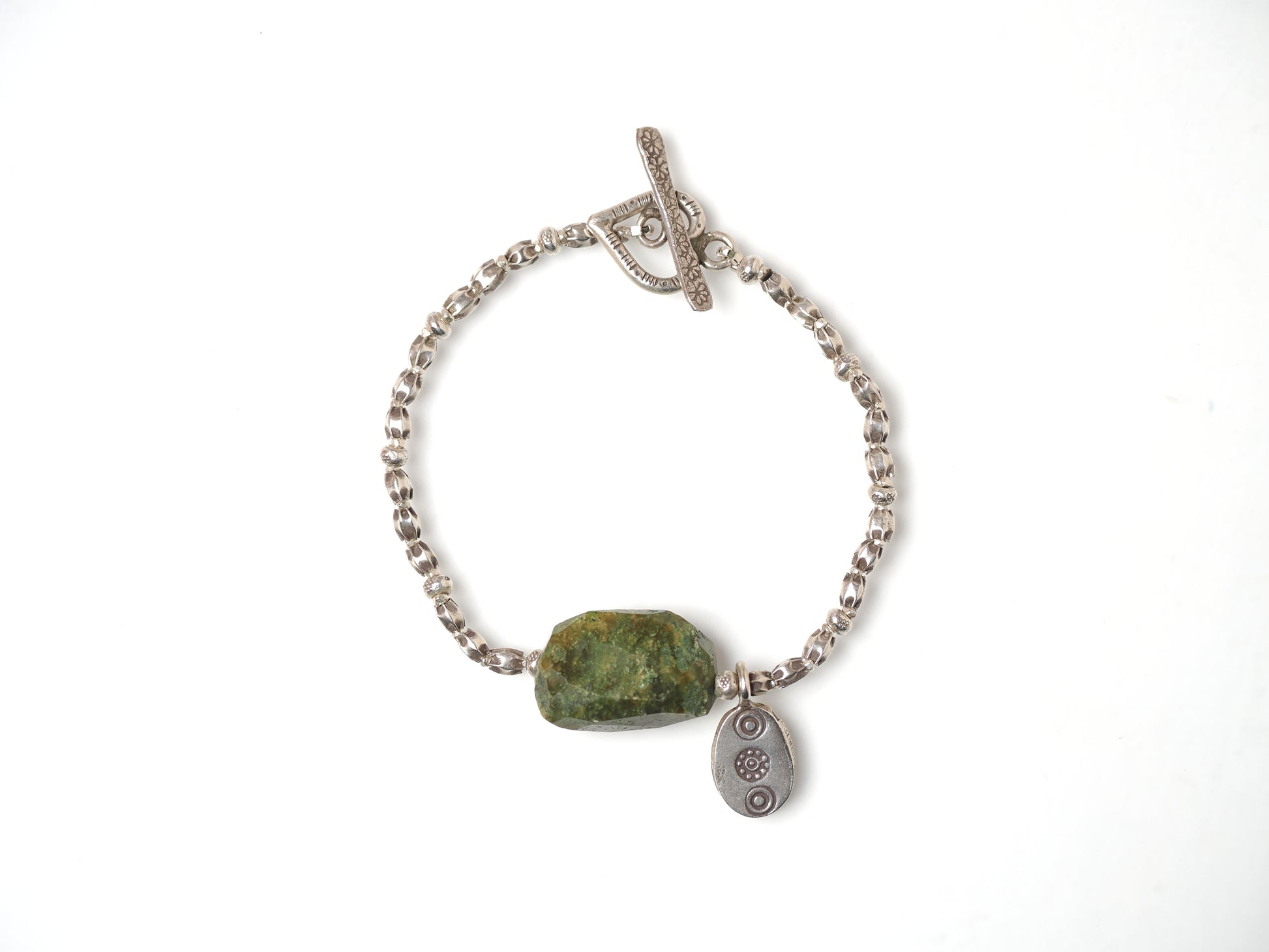 落ち着いた深いグリーンに心を癒されるブレスレットです。