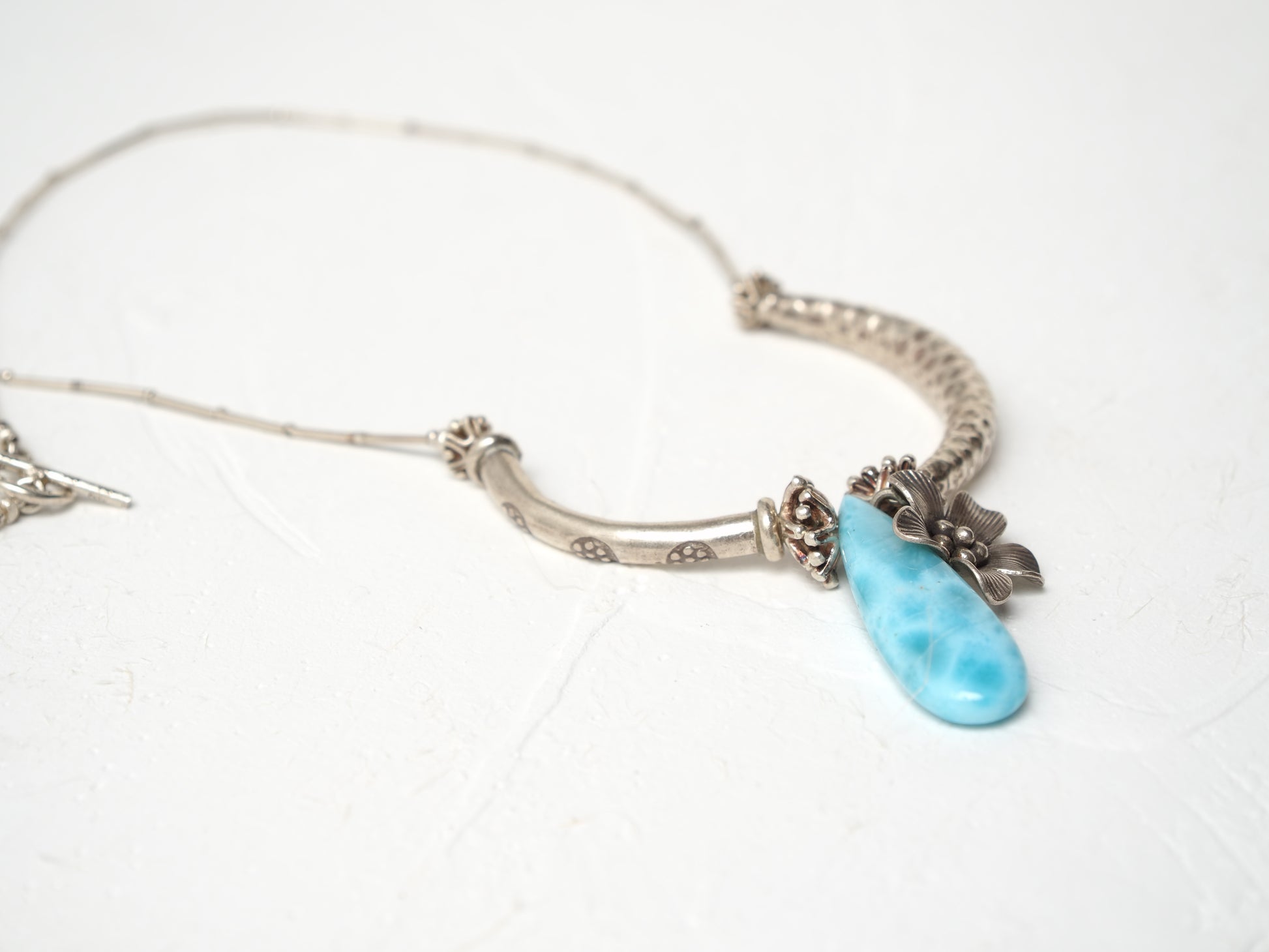 雫型の美しいラリマーに個性的で存在感のあるシルバーパーツを組み合わせ、一際目を引く大物ネックレスに仕立てました。
