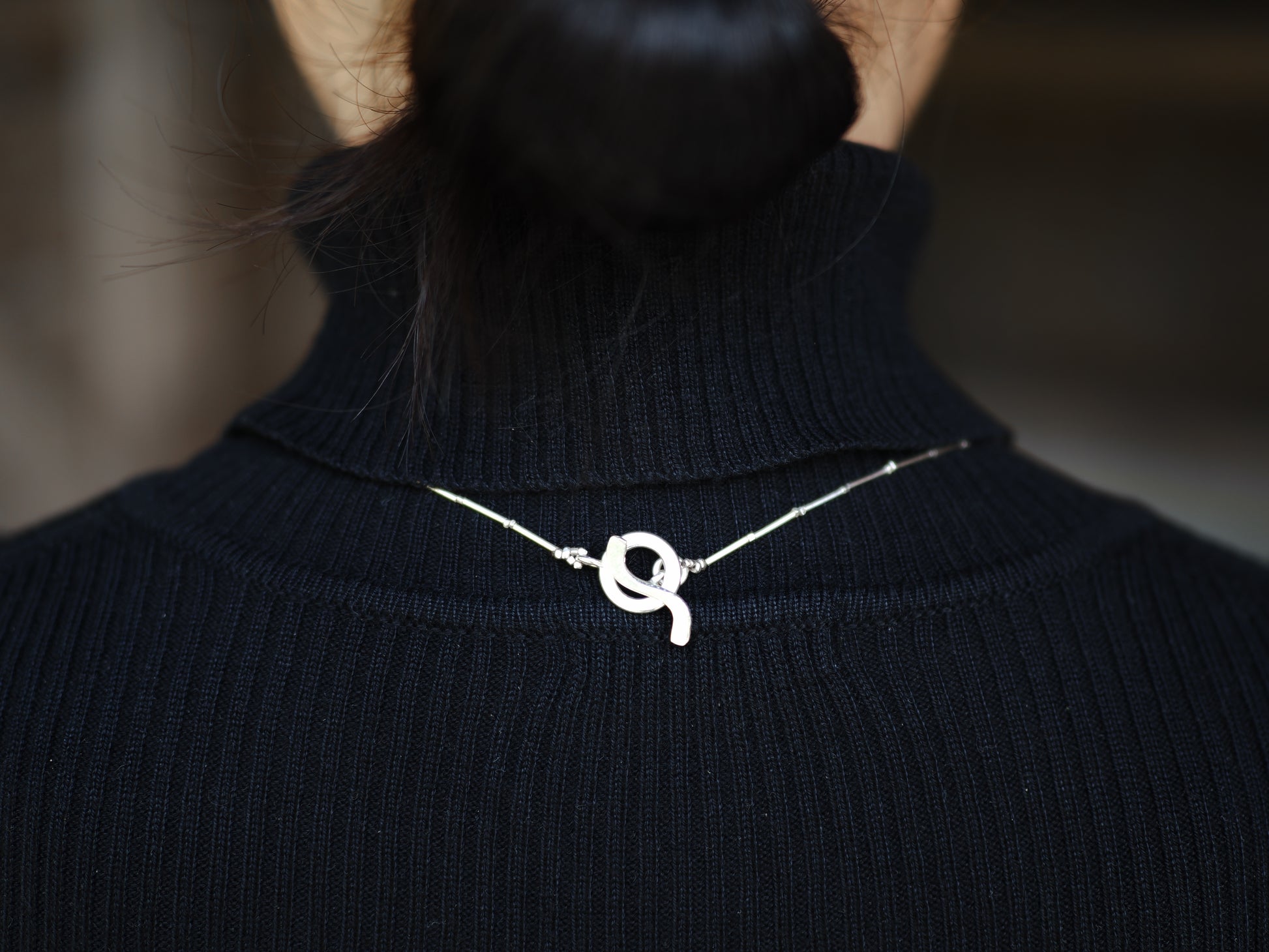 瑞々しい照りと吸い込まれるような乳白グリーンの翡翠と組み合わせ、スタイリッシュなシルバーラインで上品さの際立つネックレスに仕立てました。