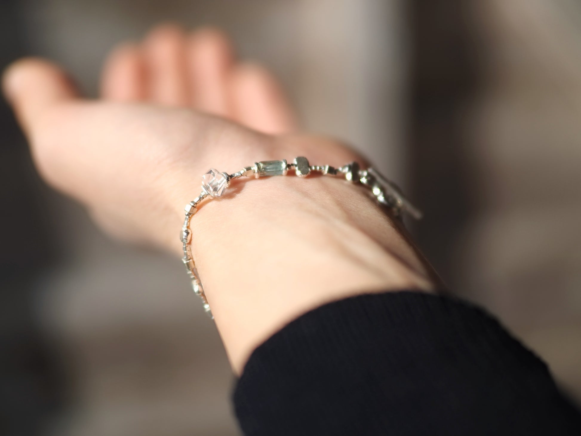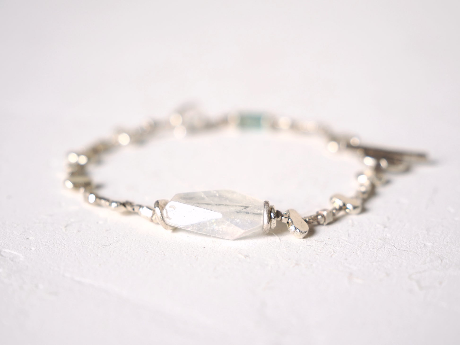 小判形のシルバービーズをアクセントに繊細なシルバーラインで繋ぎ、上質な天然石の贅沢なシルバーブレスレットに仕立てました。