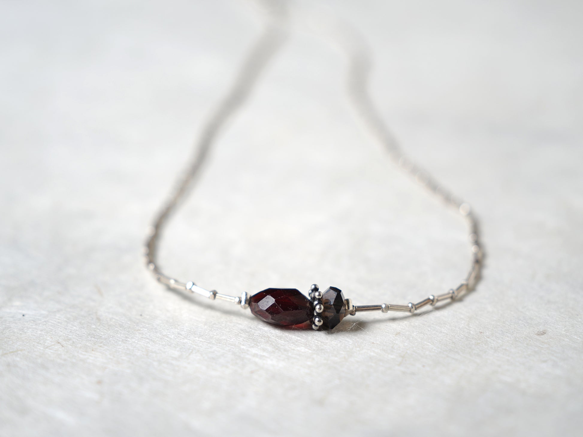 濃い赤色のガーネットとシャープなカットのスモーキークォーツを合わせ、 首元に沿うチョーカーネックレスに仕立てました。