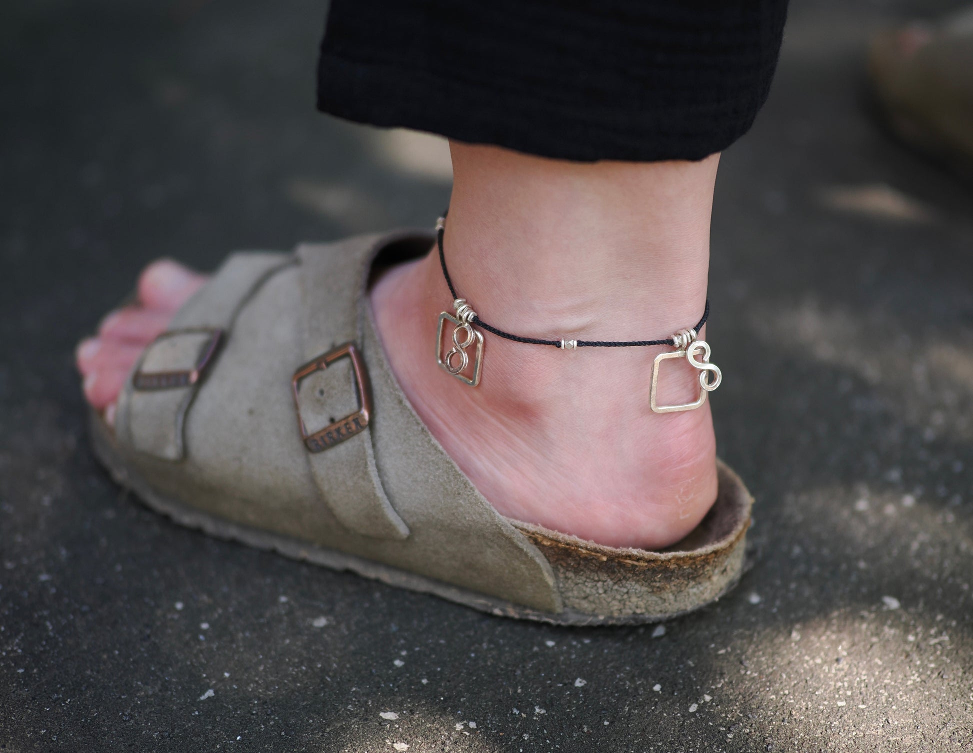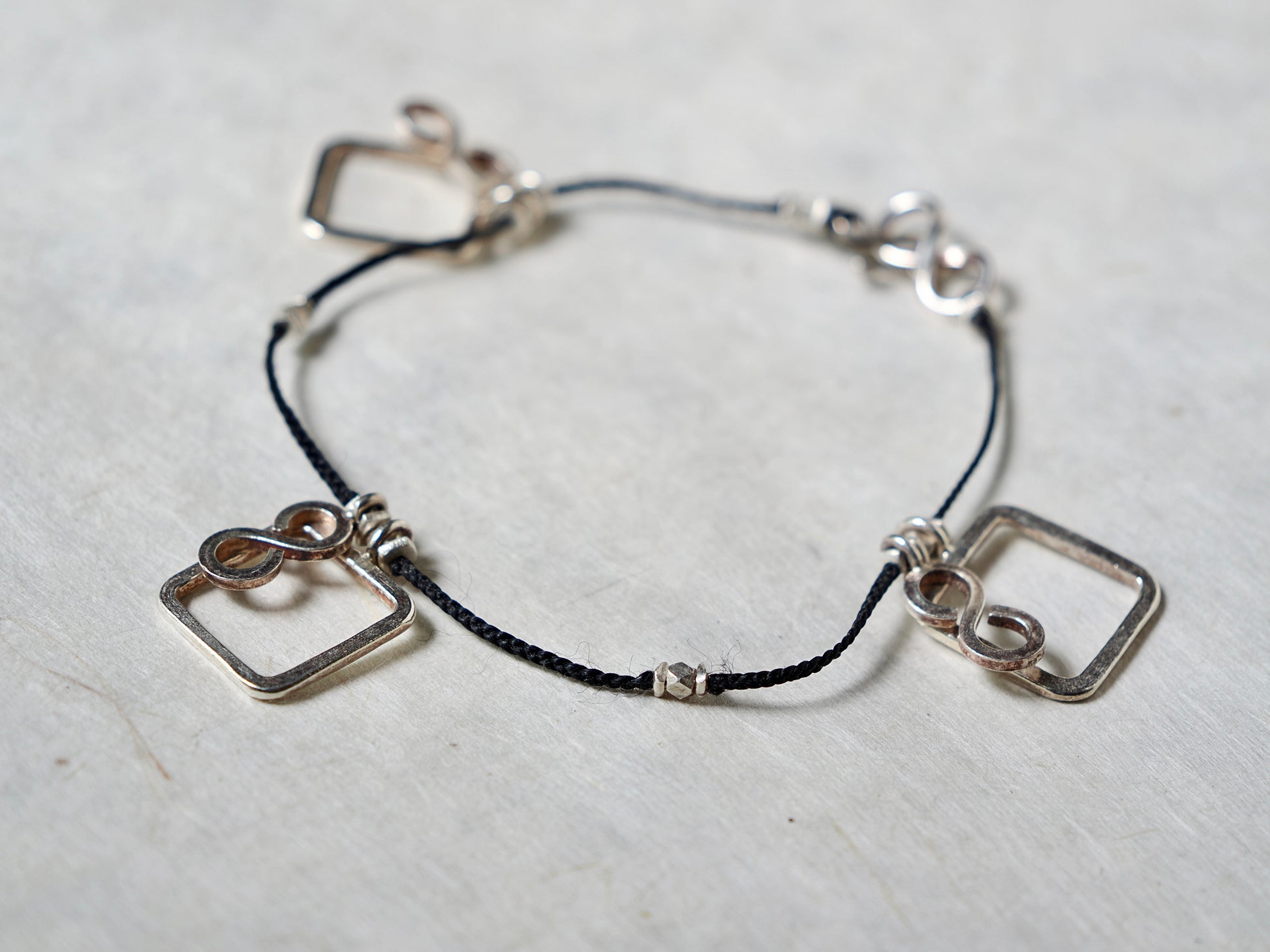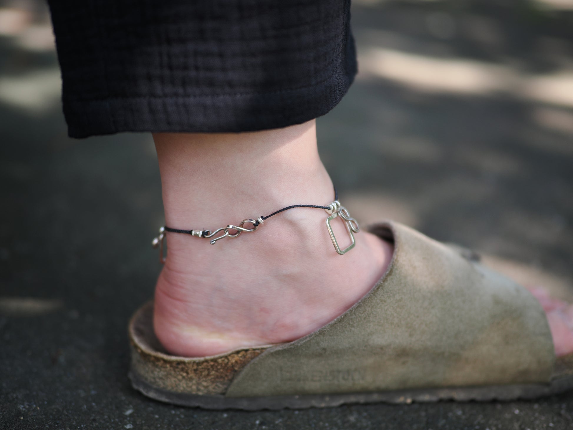 スクエアと8の字の大ぶりチャームを散りばめ、大胆かつ装飾感のあるアンクレットに仕立てました。