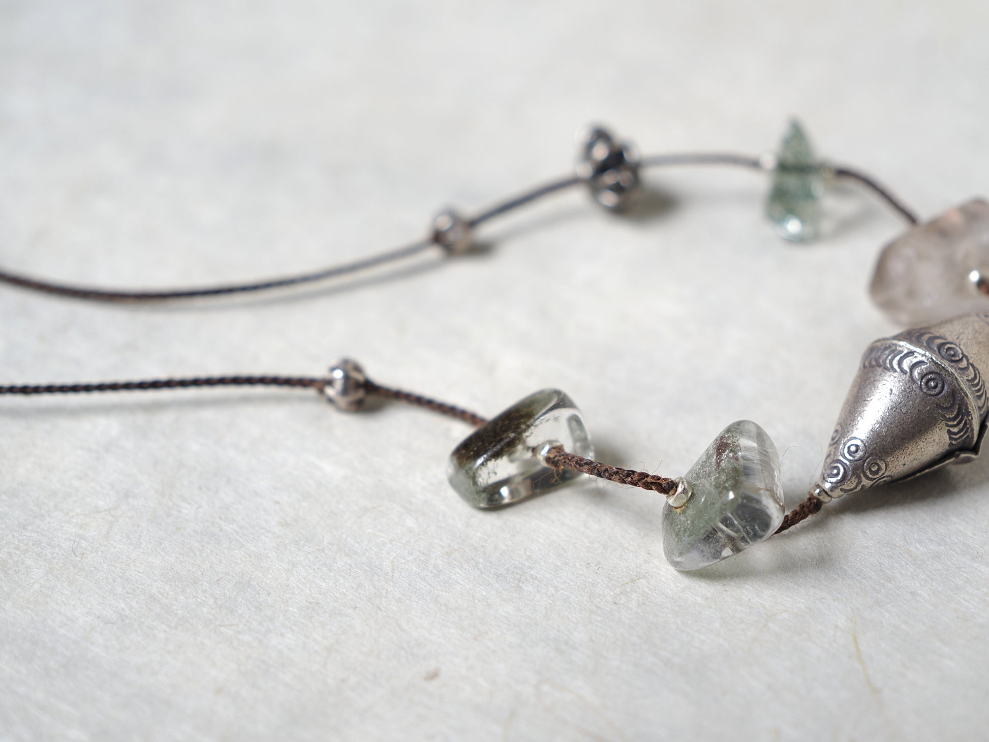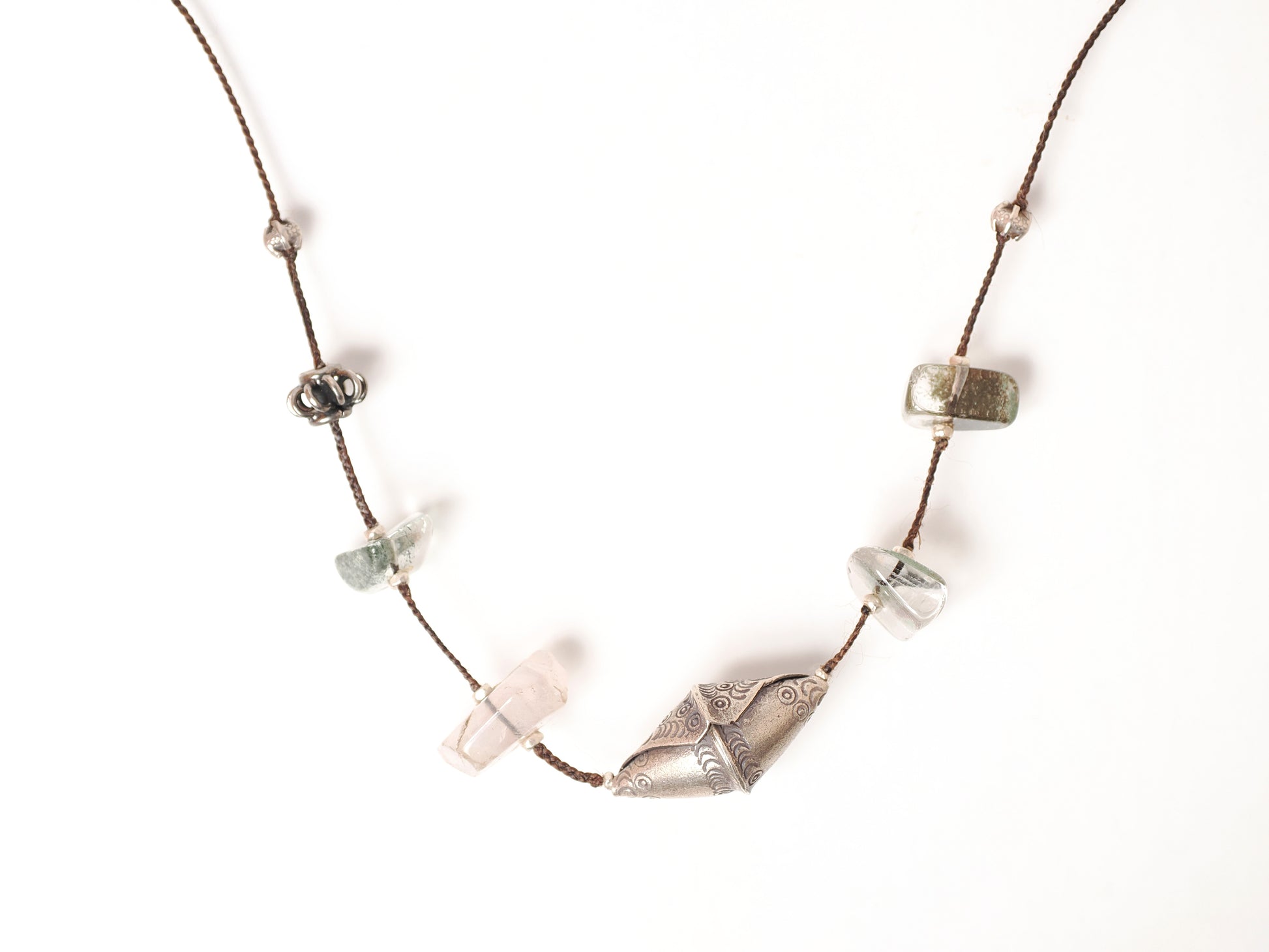 巻貝の様な形に民族模様を施したカレンシルバー・ビーズと力強い大粒モスクォーツを黒色の編み紐で繋ぎました。