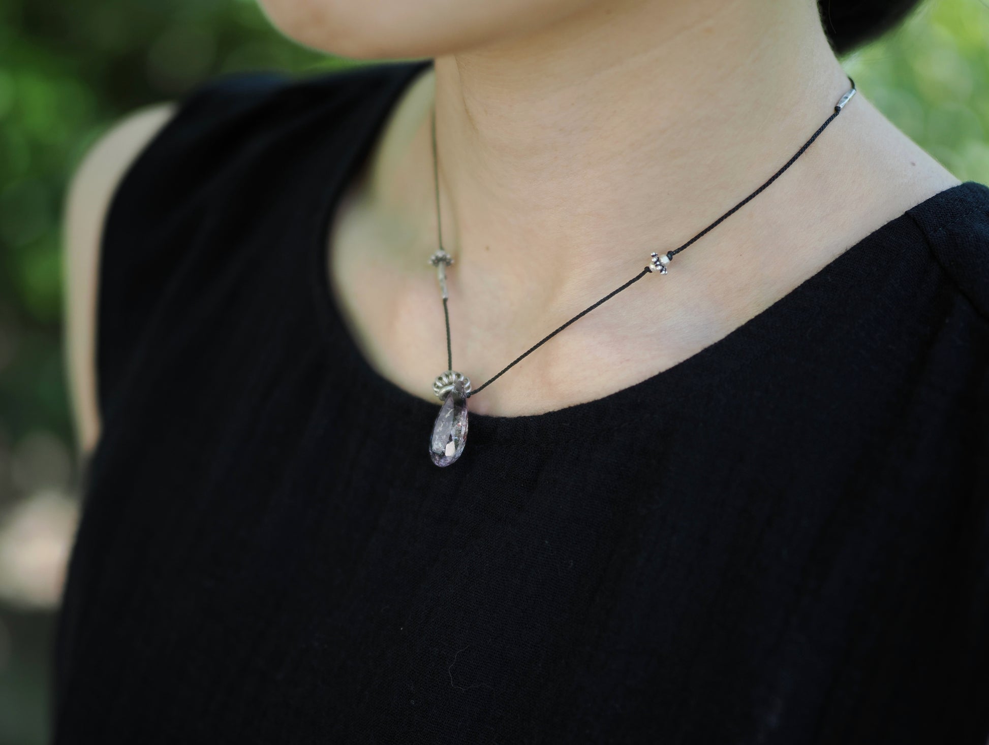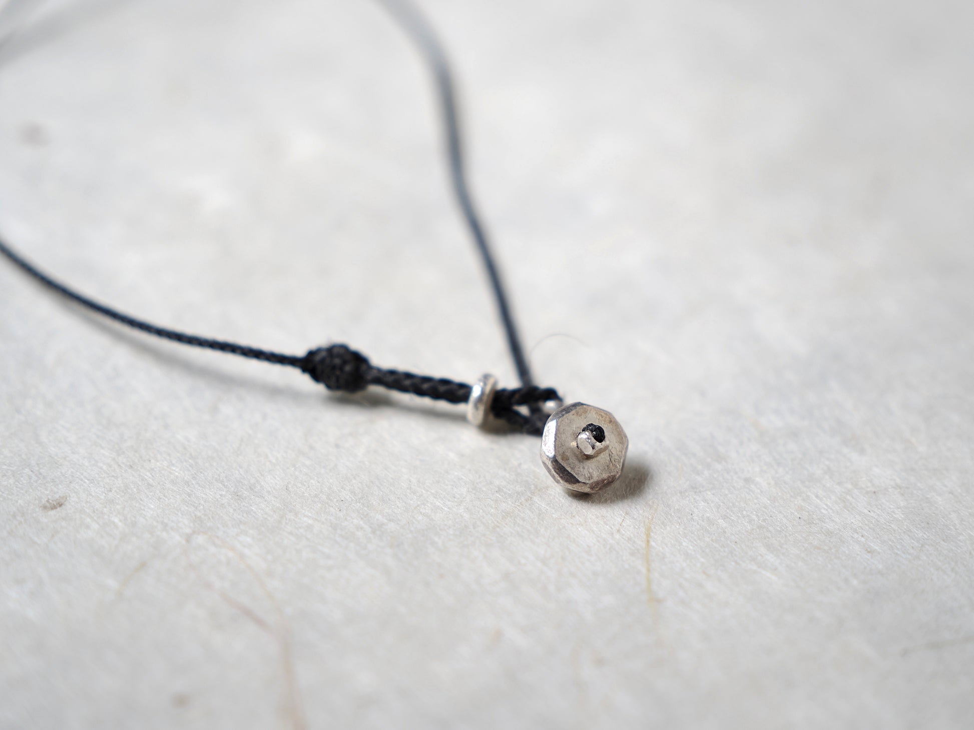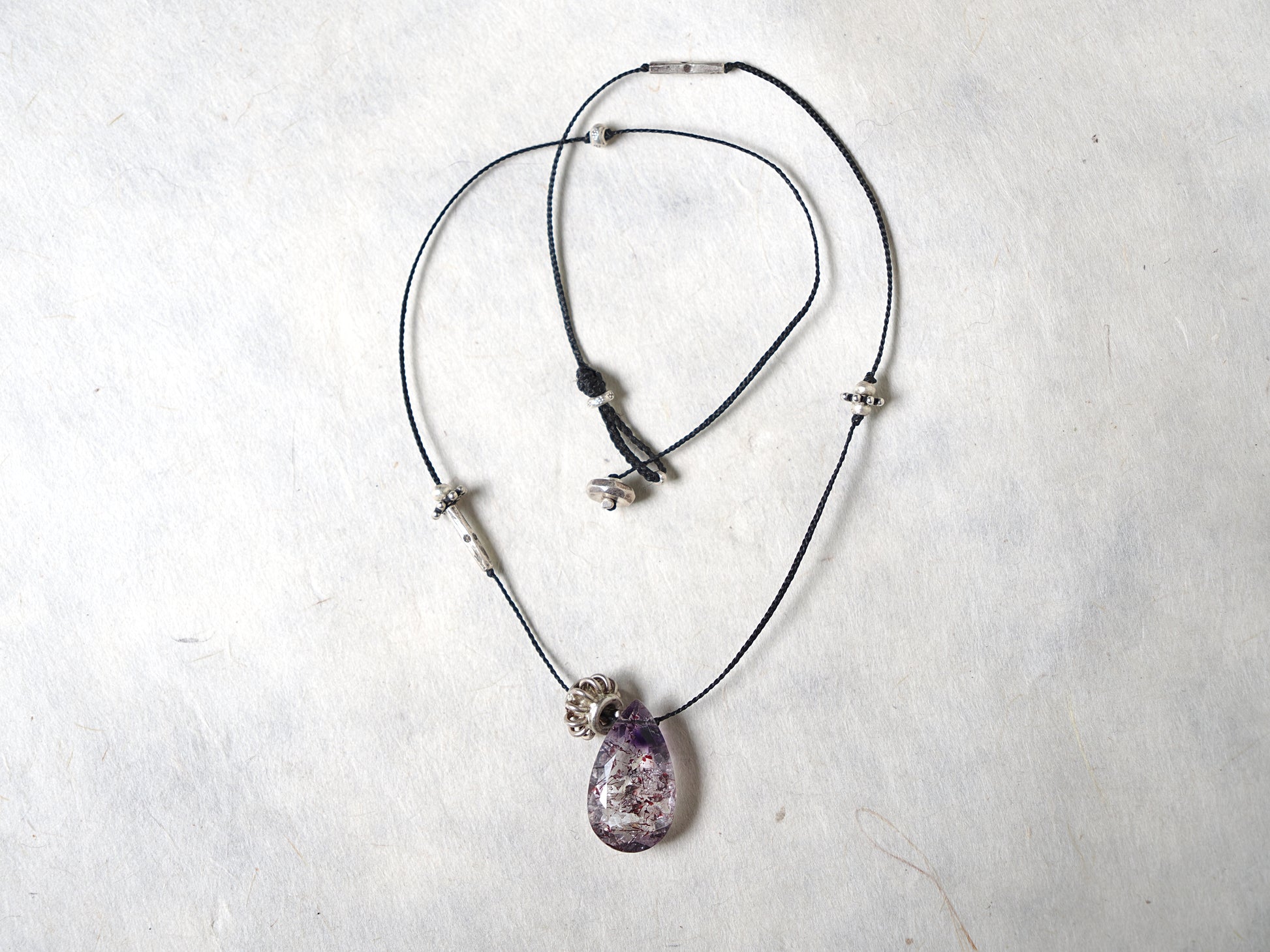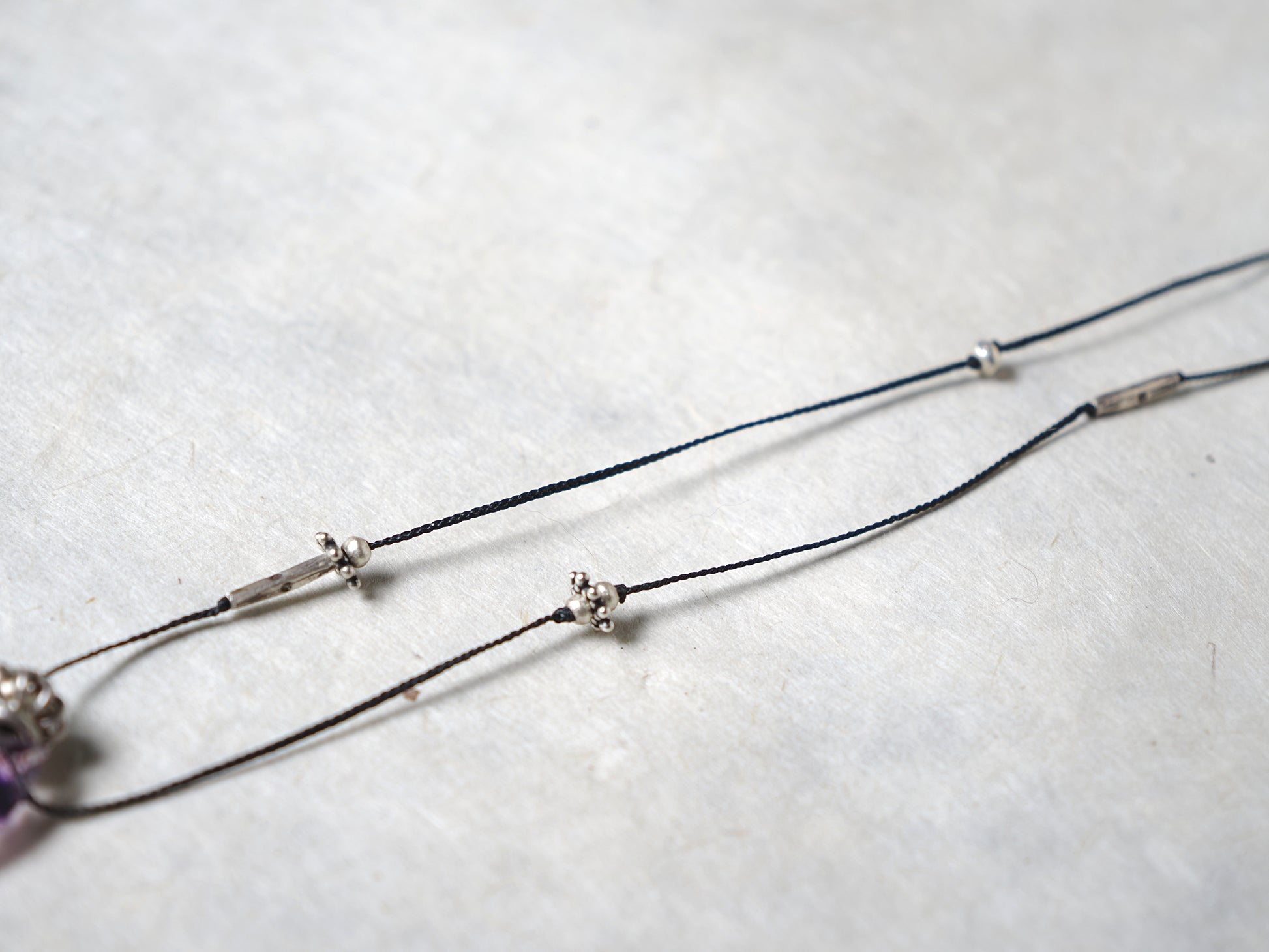 個性的なカレンシルバー・ビーズと共にアシンメトリーに組み合わせ、オリジナリティのある編み紐ペンダントに仕立てました。