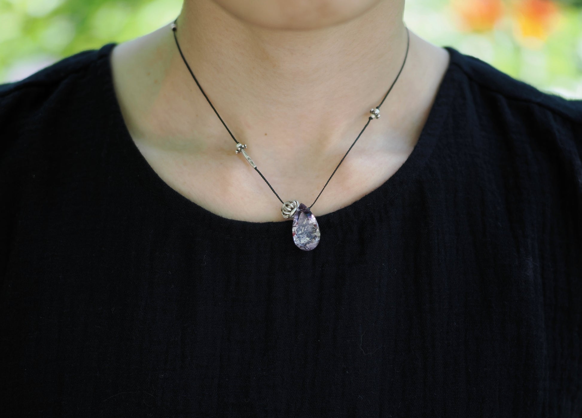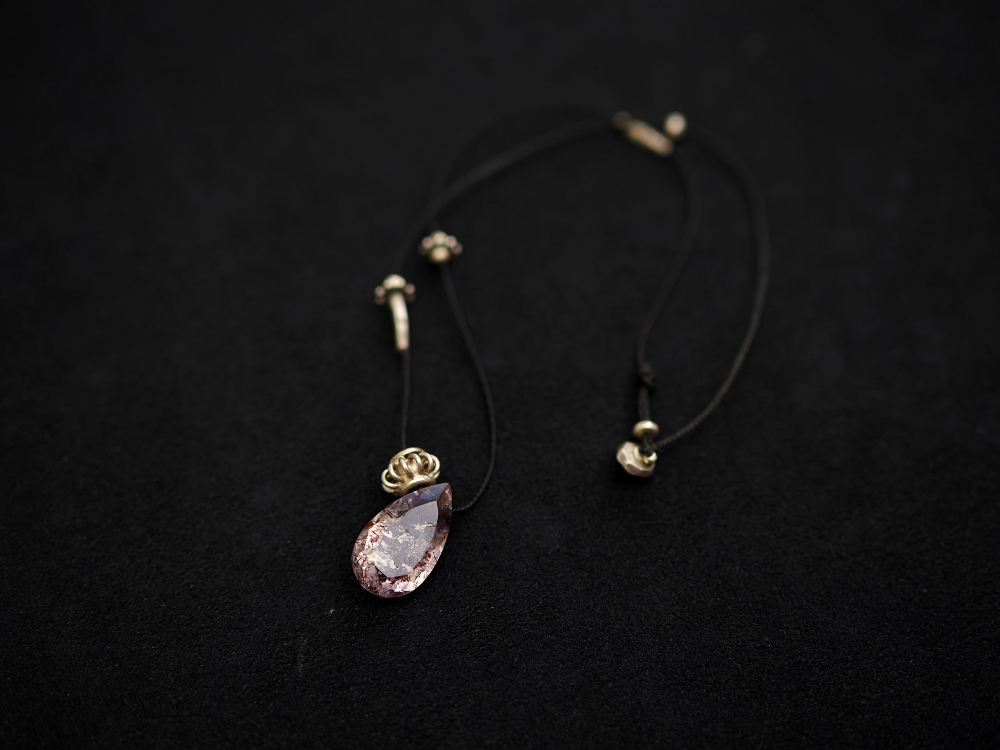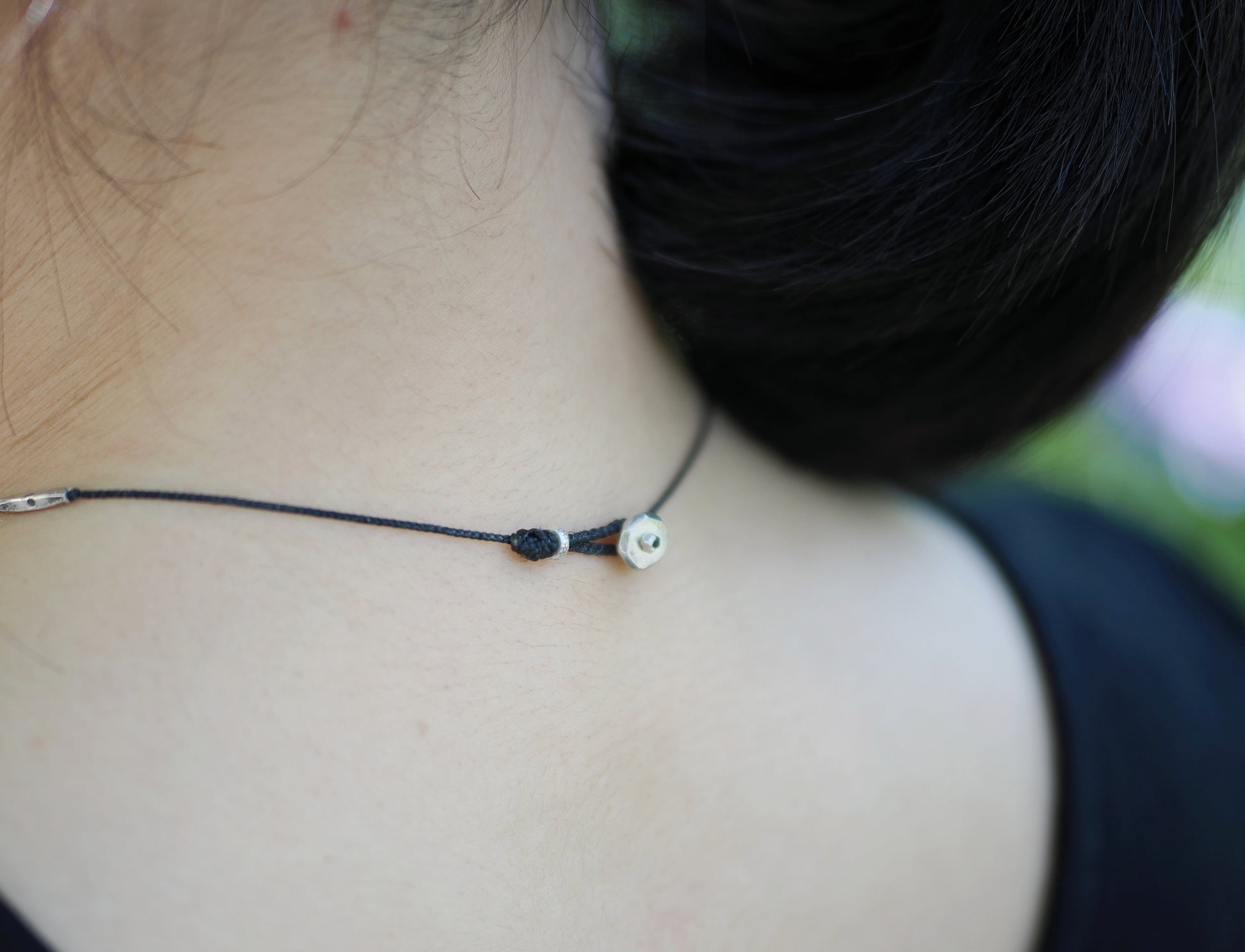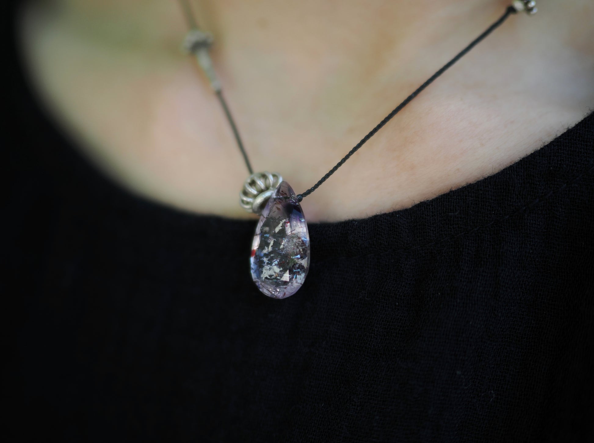 個性的なカレンシルバー・ビーズと共にアシンメトリーに組み合わせ、オリジナリティのある編み紐ペンダントに仕立てました。