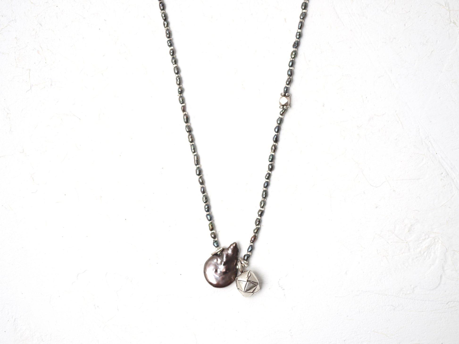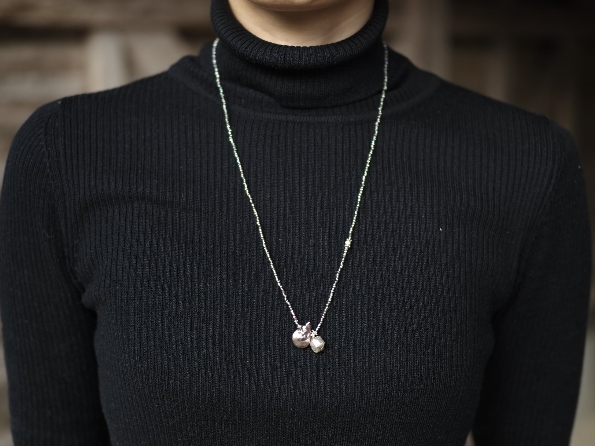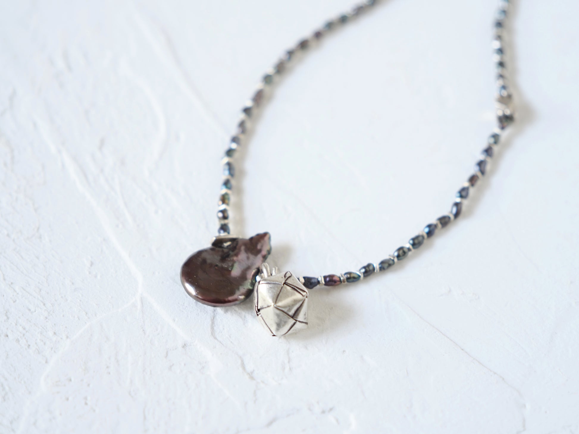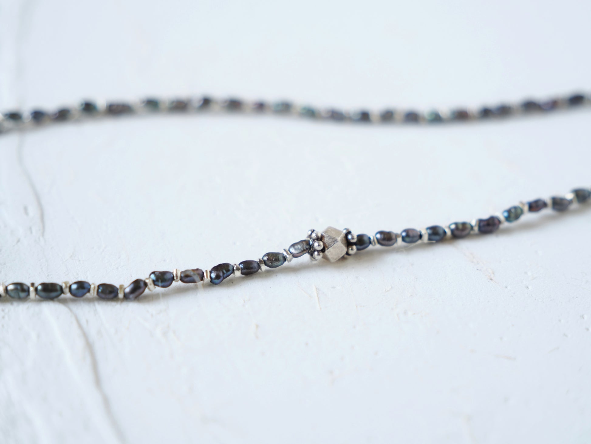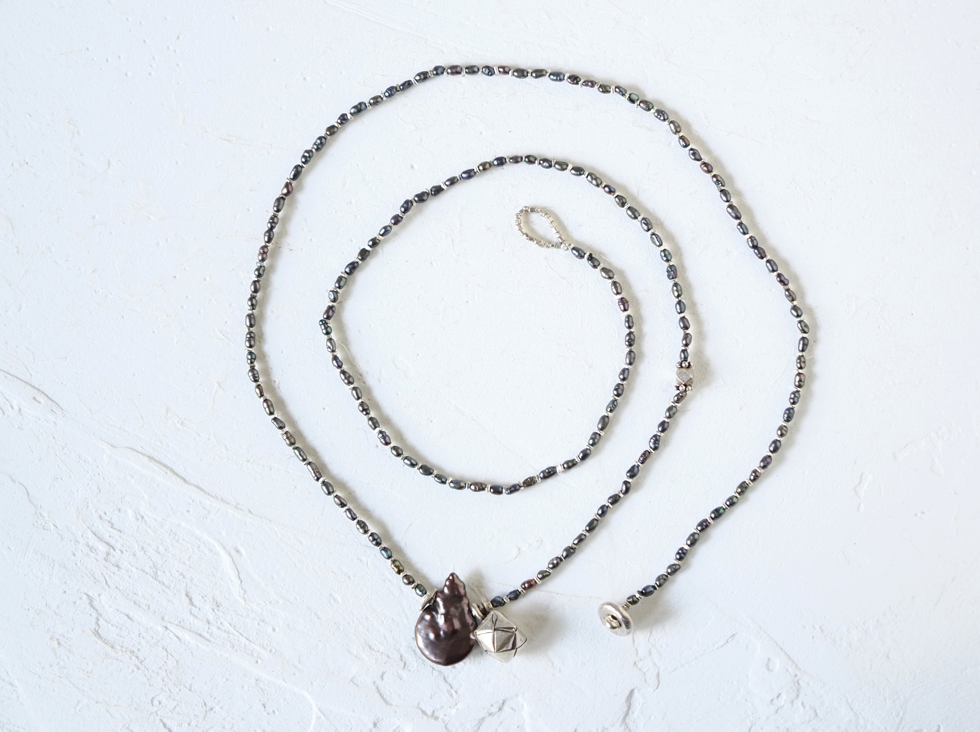 細かなライスパールとシルバーチップを交互に合わせ、シックな印象のロングネックレスに仕立てました。