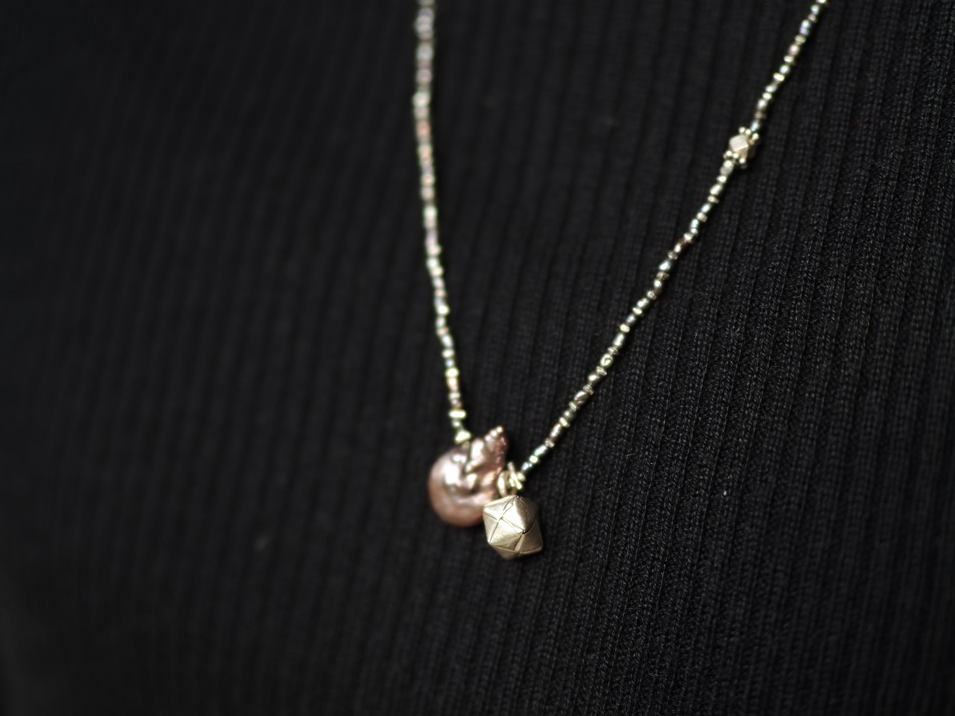 楕円型のコインパールとキューブ型の包みチャームをトップに、、