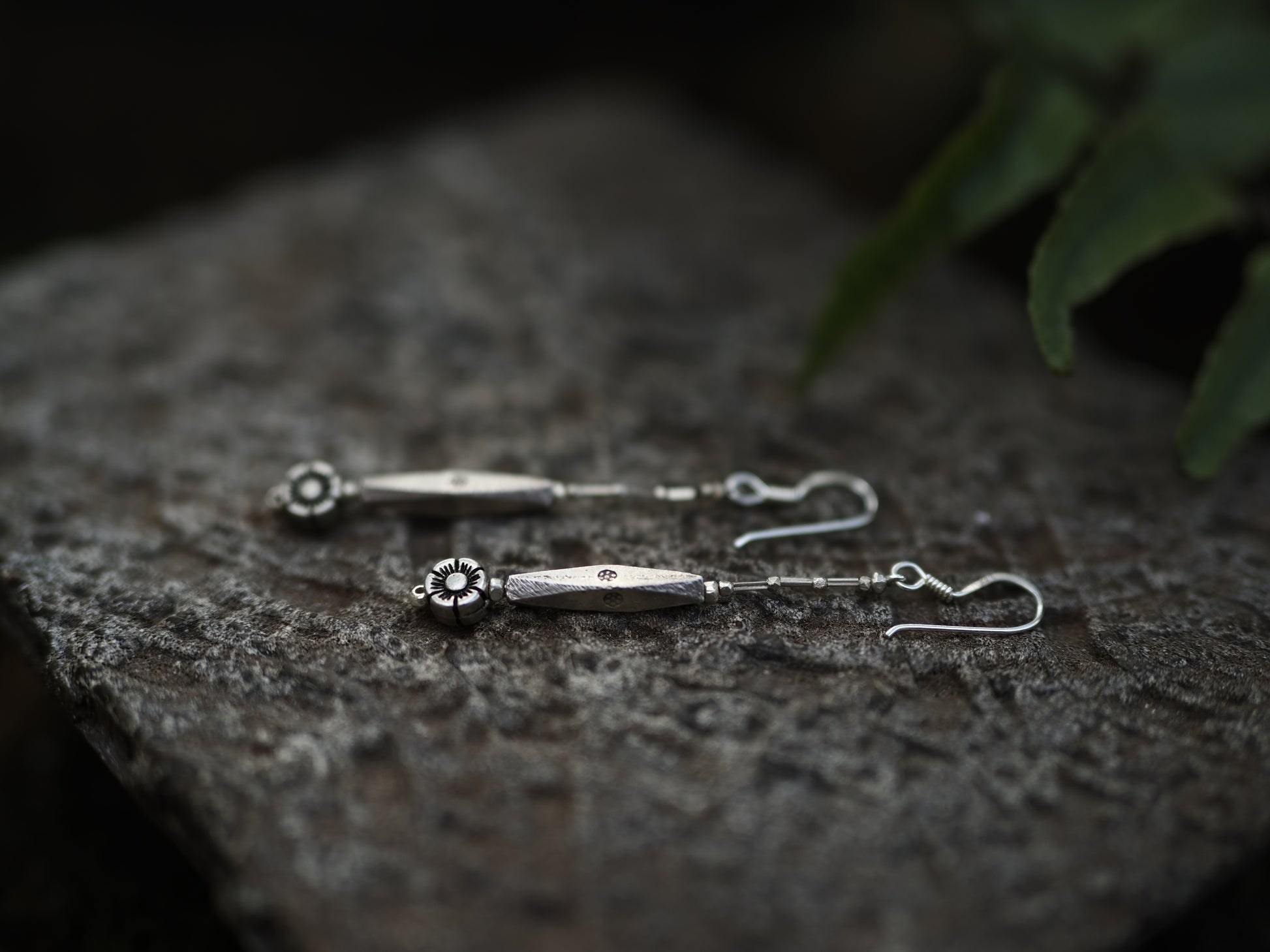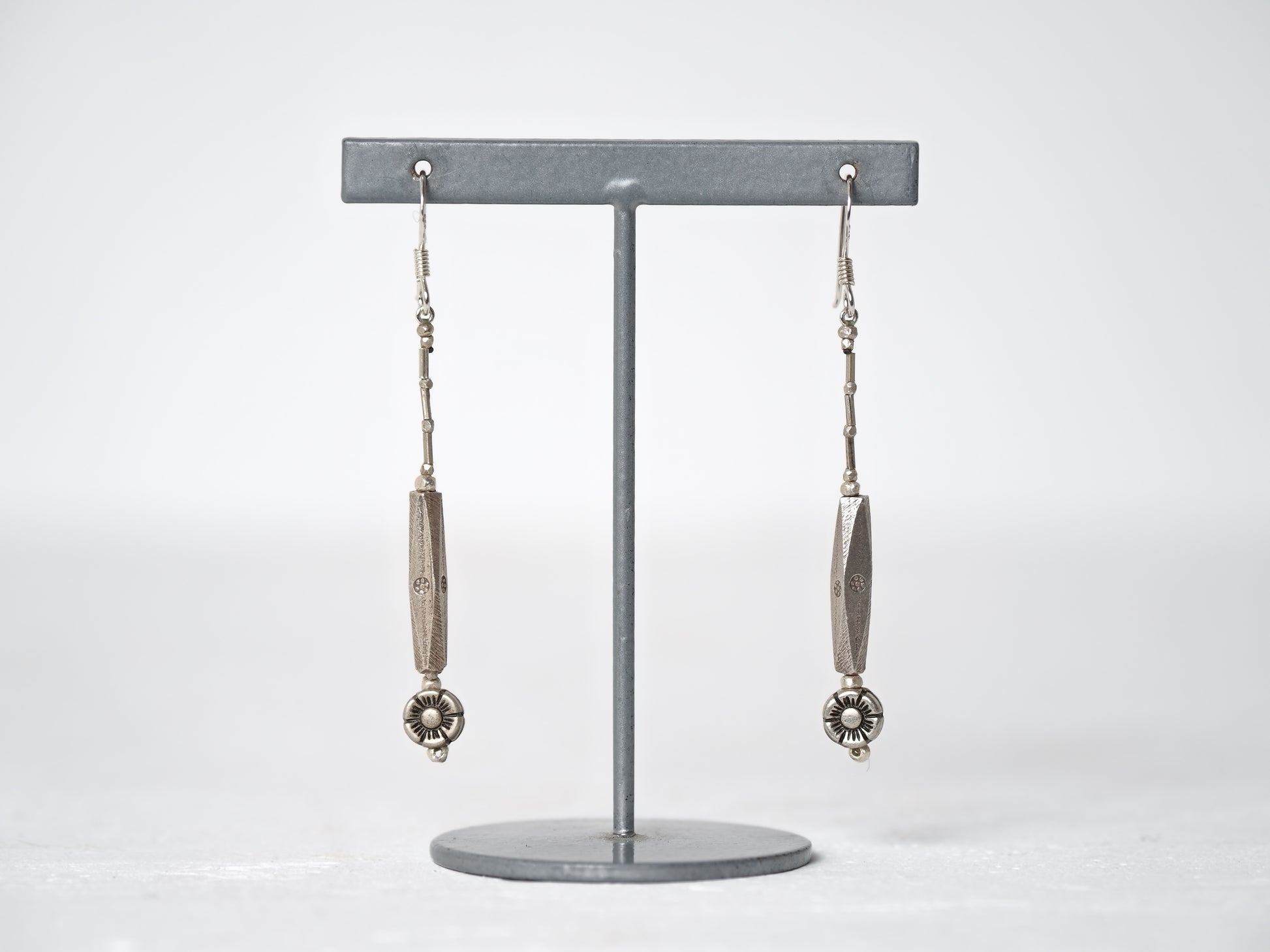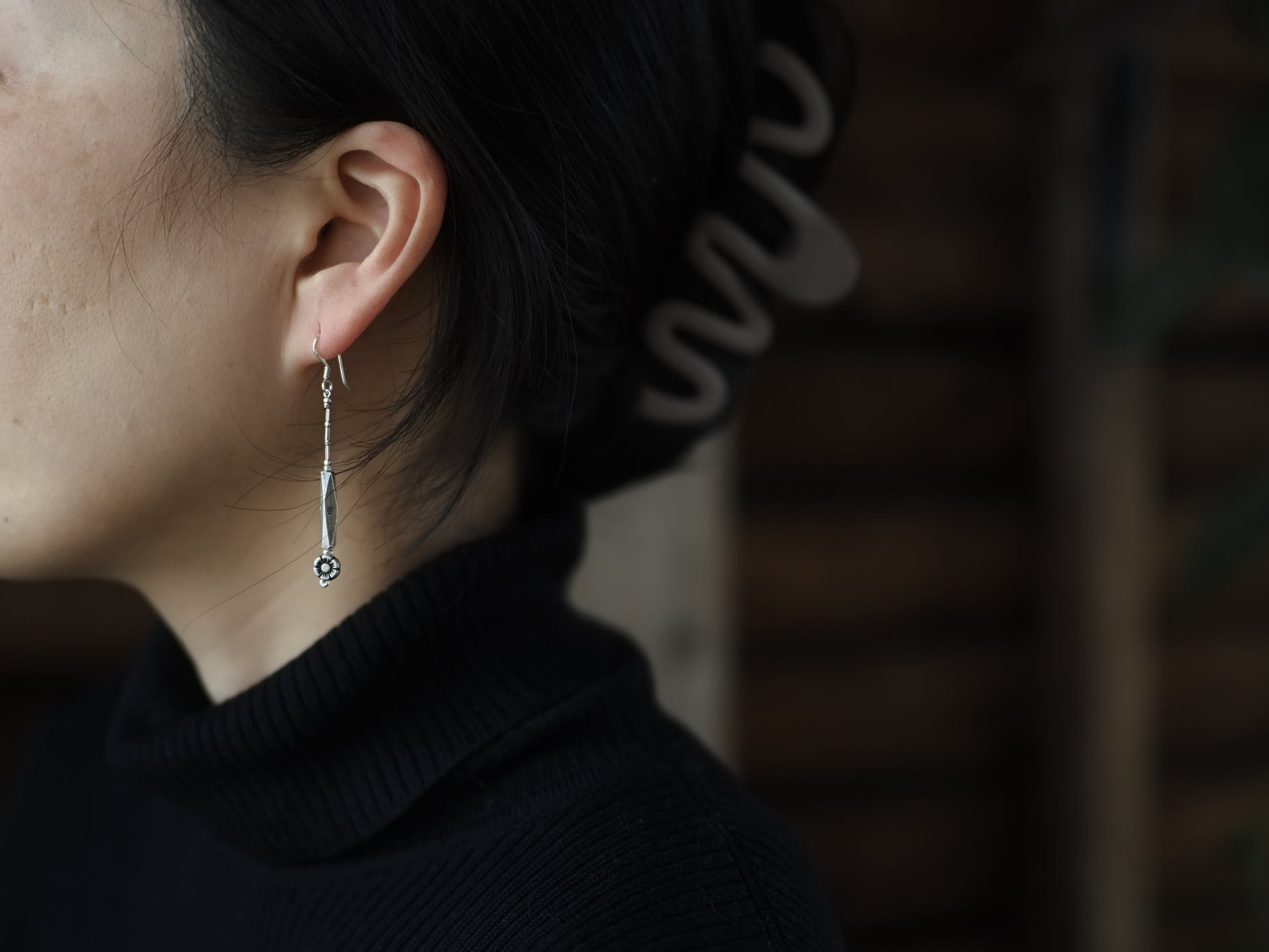 数種類のカレンシルバー・ビーズと共に、スッキリと縦長シルエットのシルバーピアスに仕立てました。