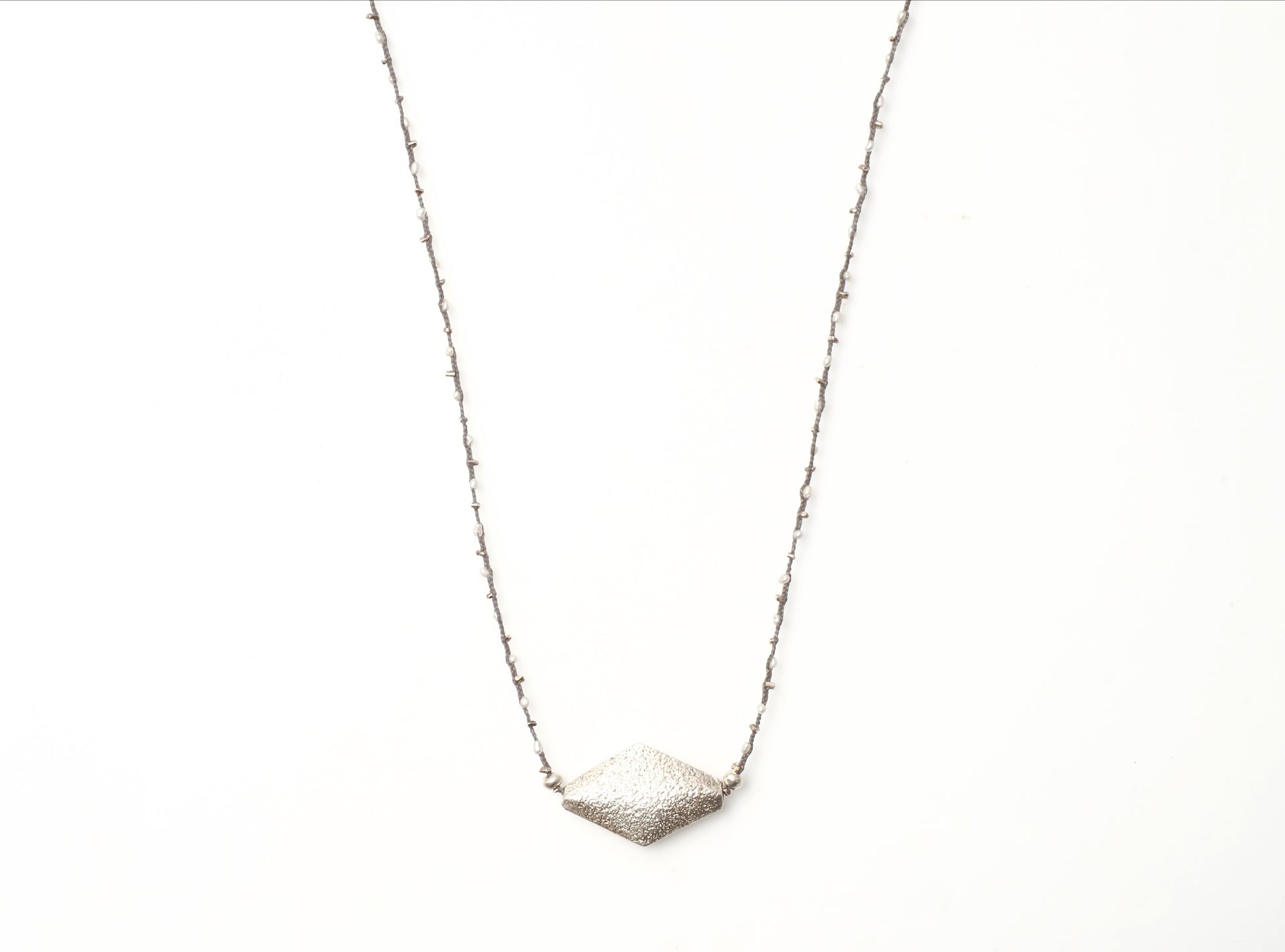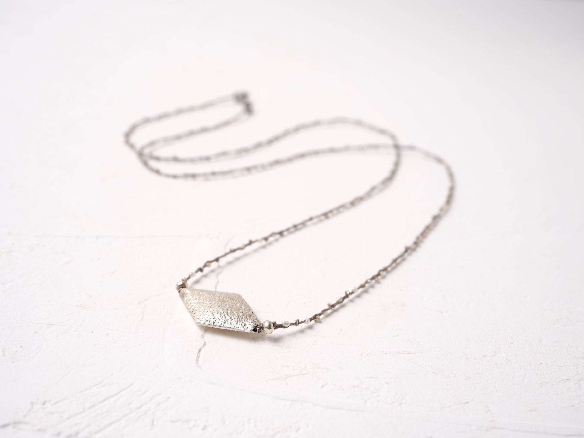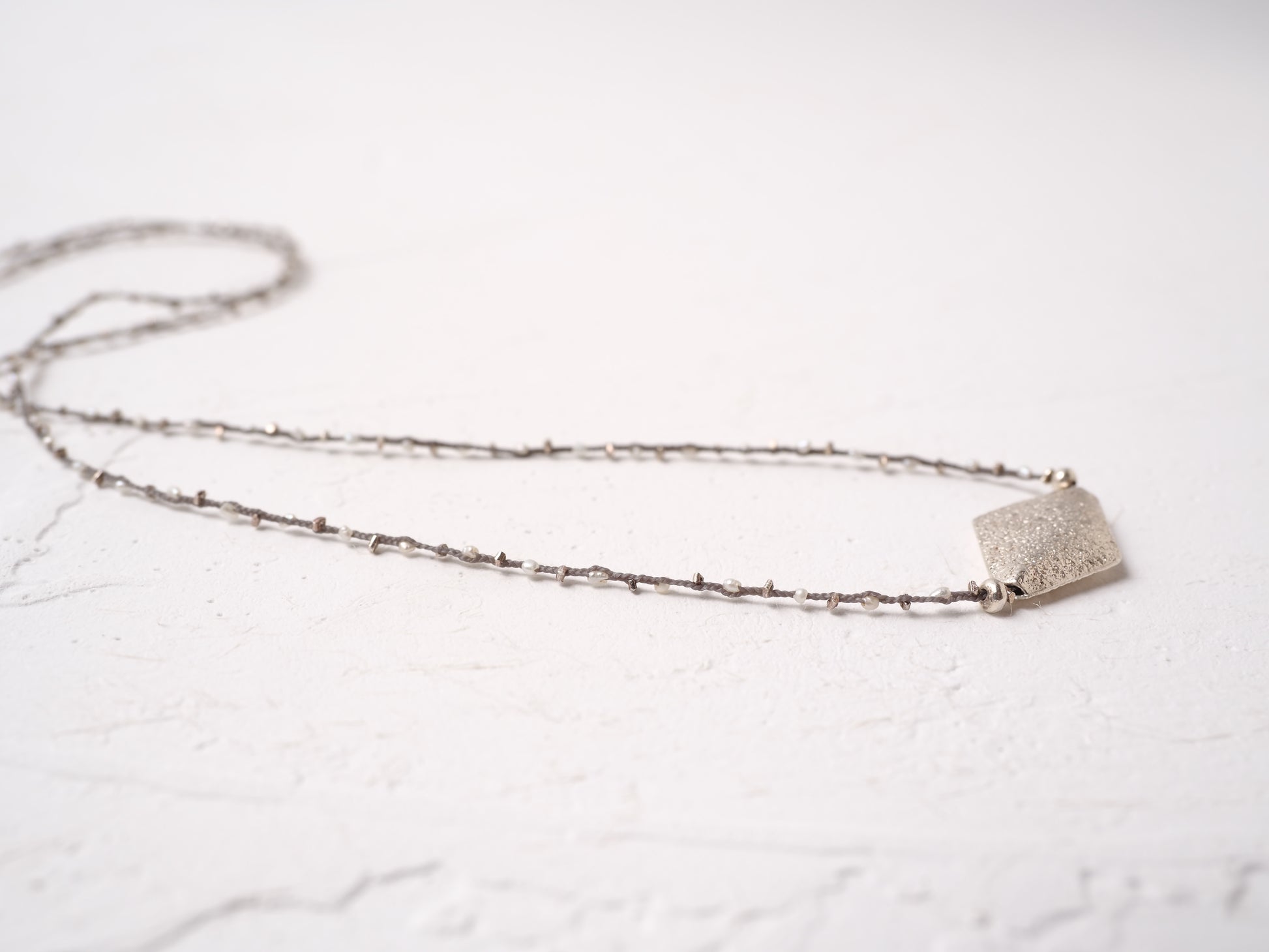 極小の淡水パールとシルバービーズを編み込みにし、長さ78cmの繊細なロングネックレスに仕立てました。