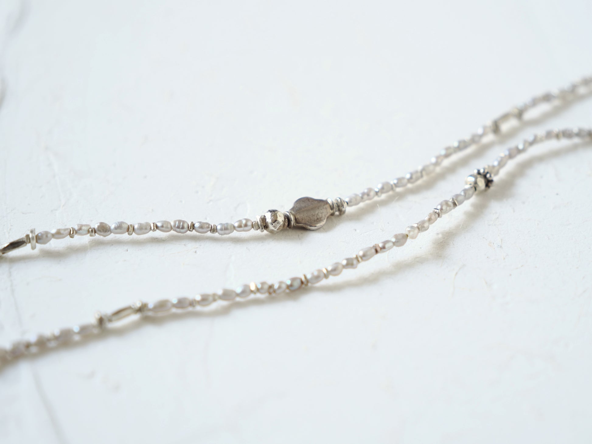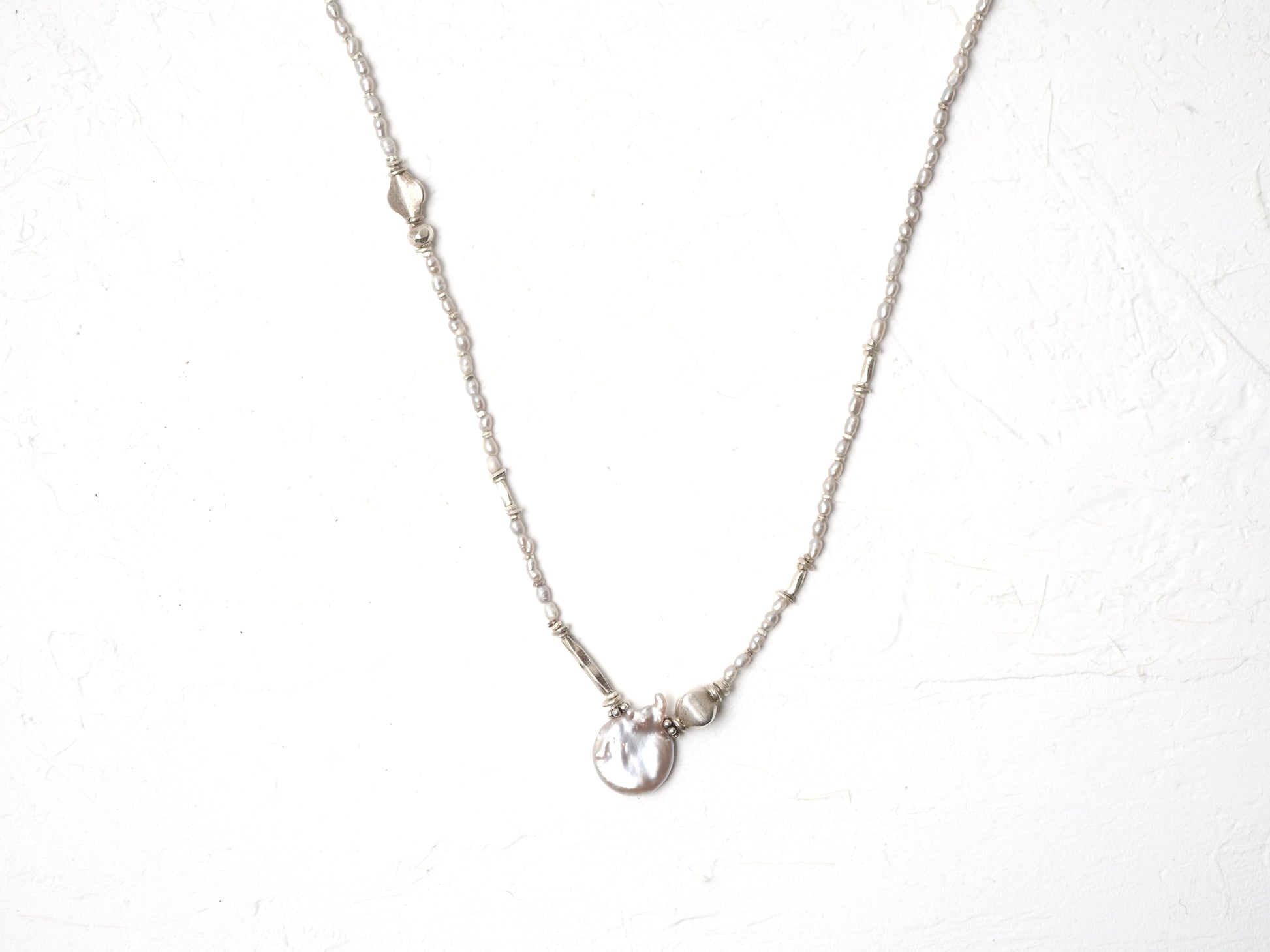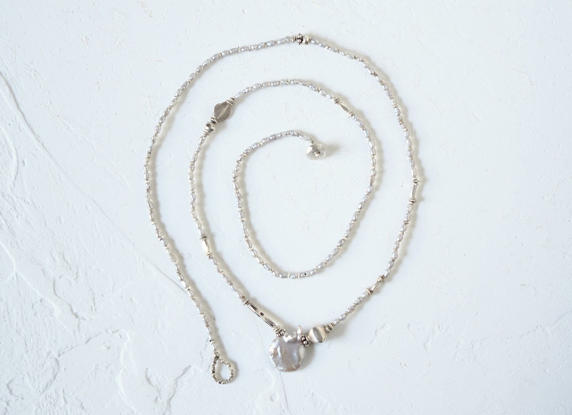 ライスパール・シルバービーズを繋ぎ、個性の光るペンダントに仕立てました。
