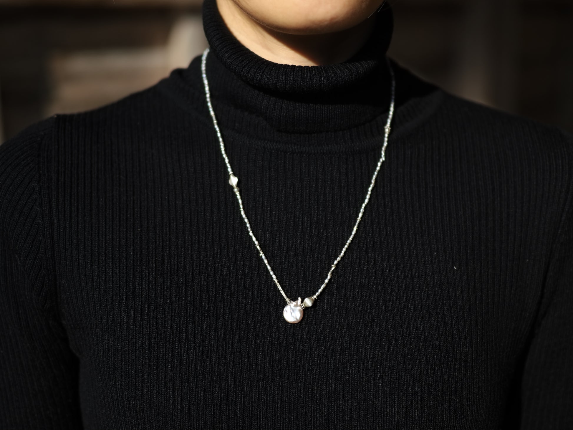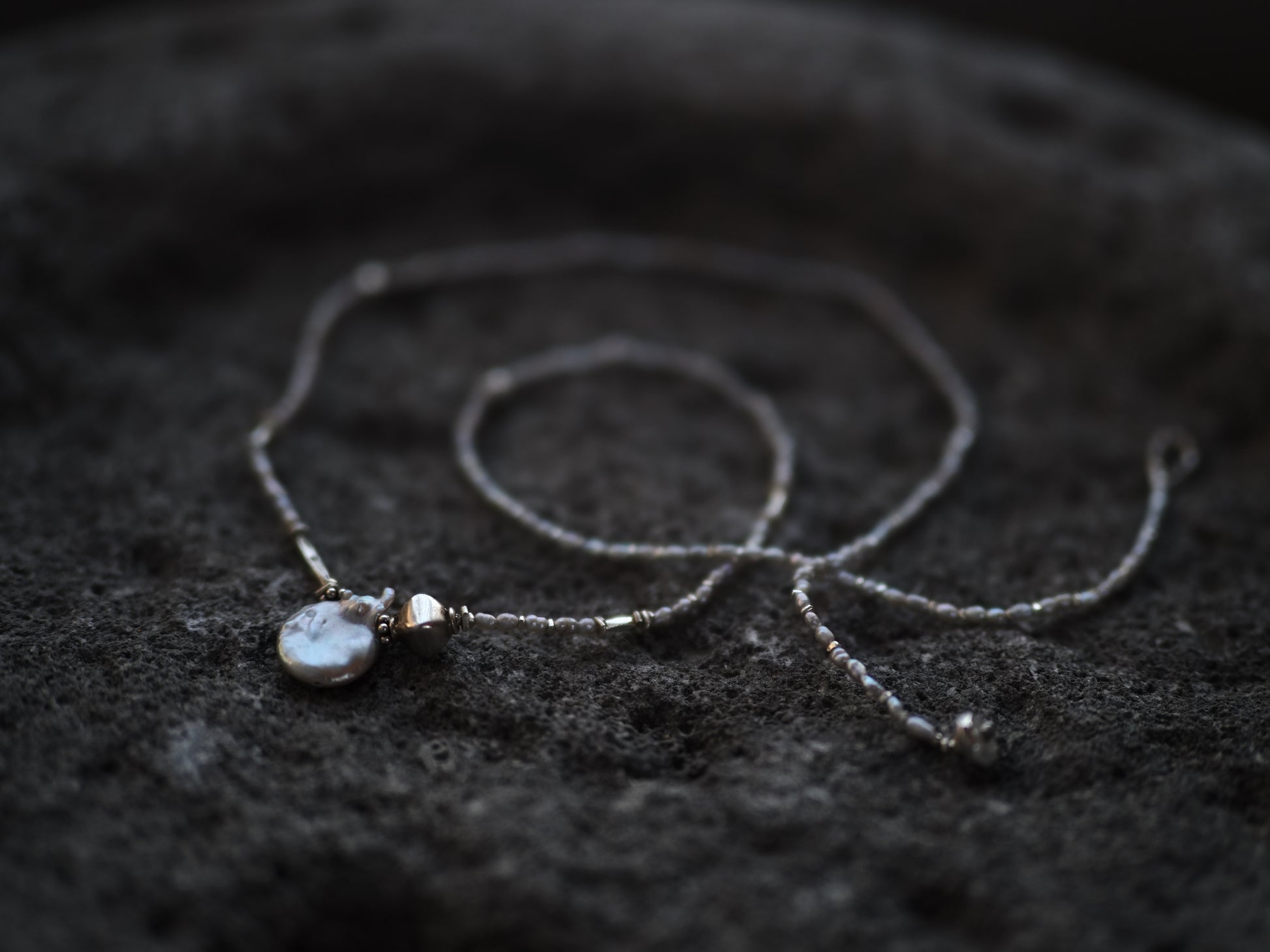 楕円型のコインパールにインドのオールドシルバービーズ、カレンシルバーのチューブを添え、、
