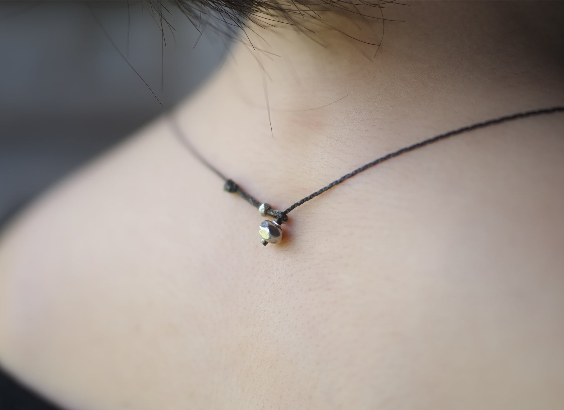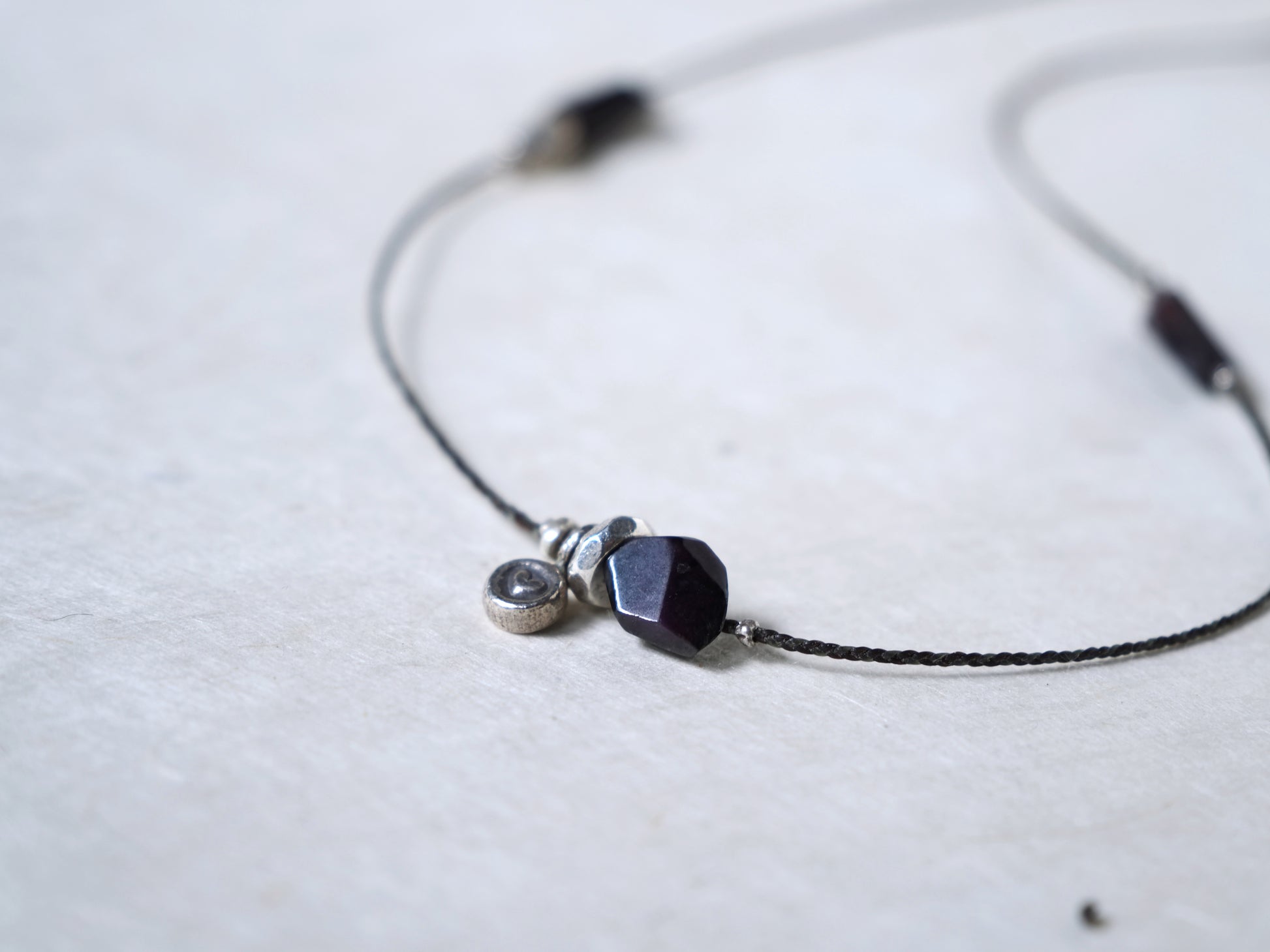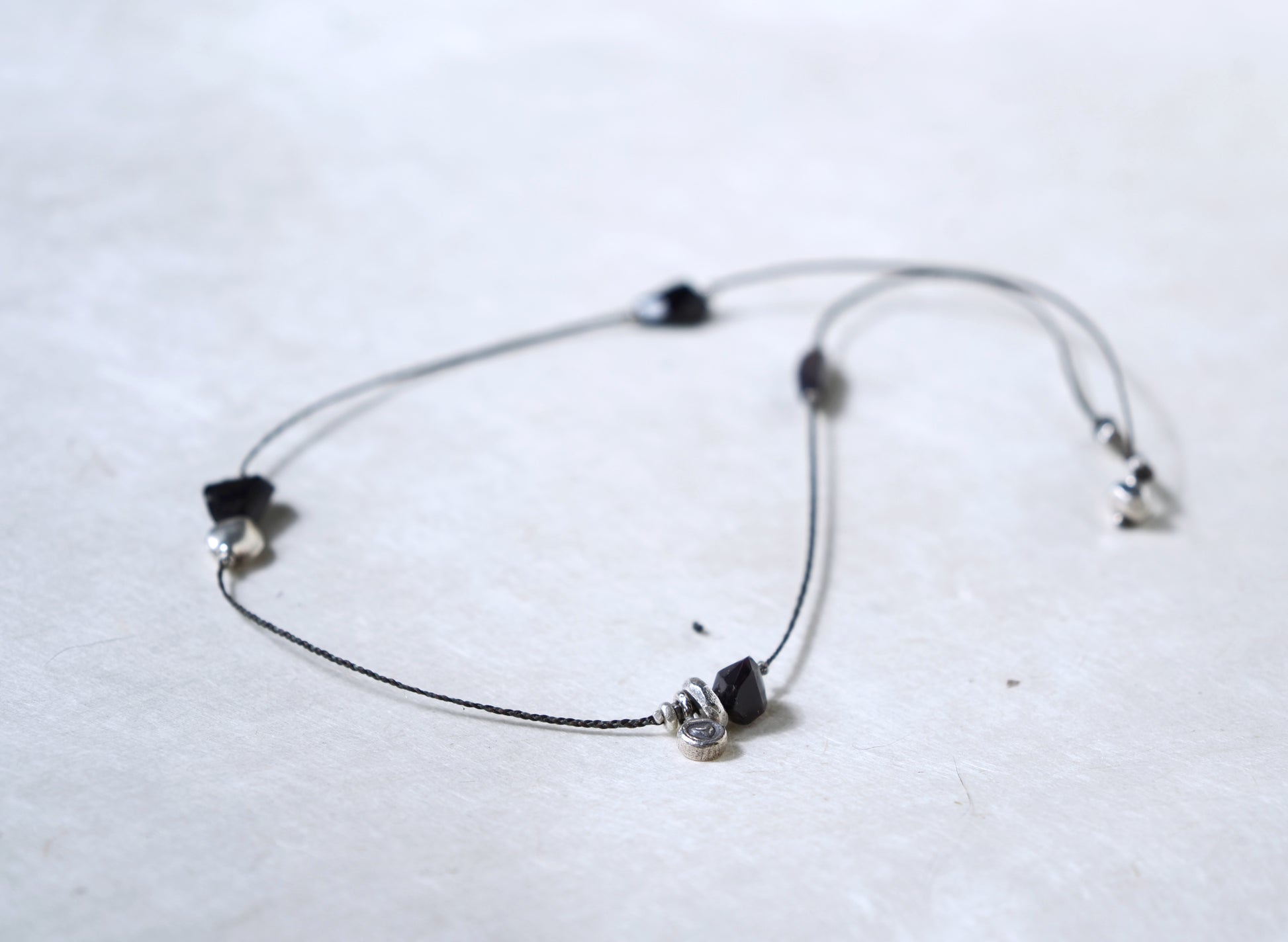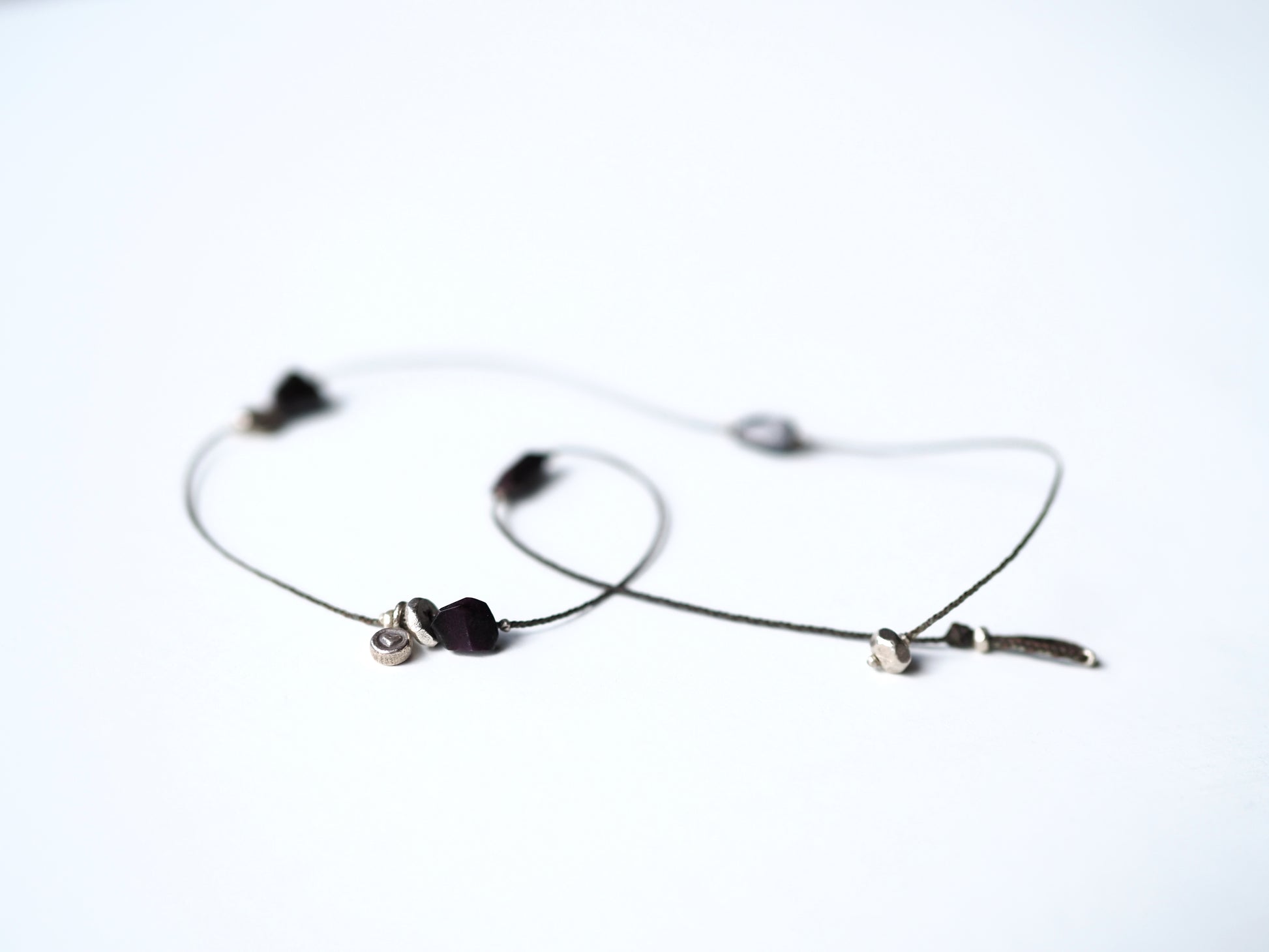カレンシルバーのチャームやビーズと共にアシンメトリーに散りばめ、首周りをゆったりと装飾する細紐ネックレスに仕立てました。