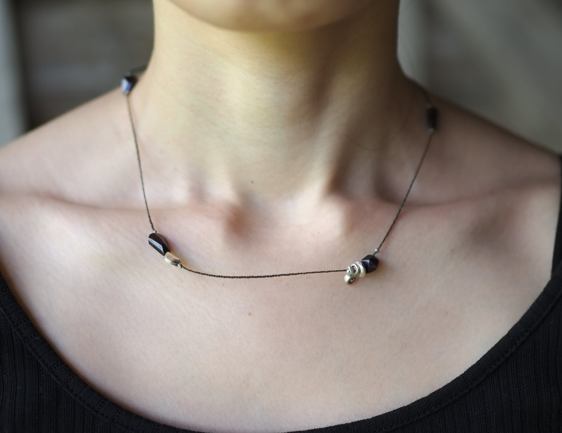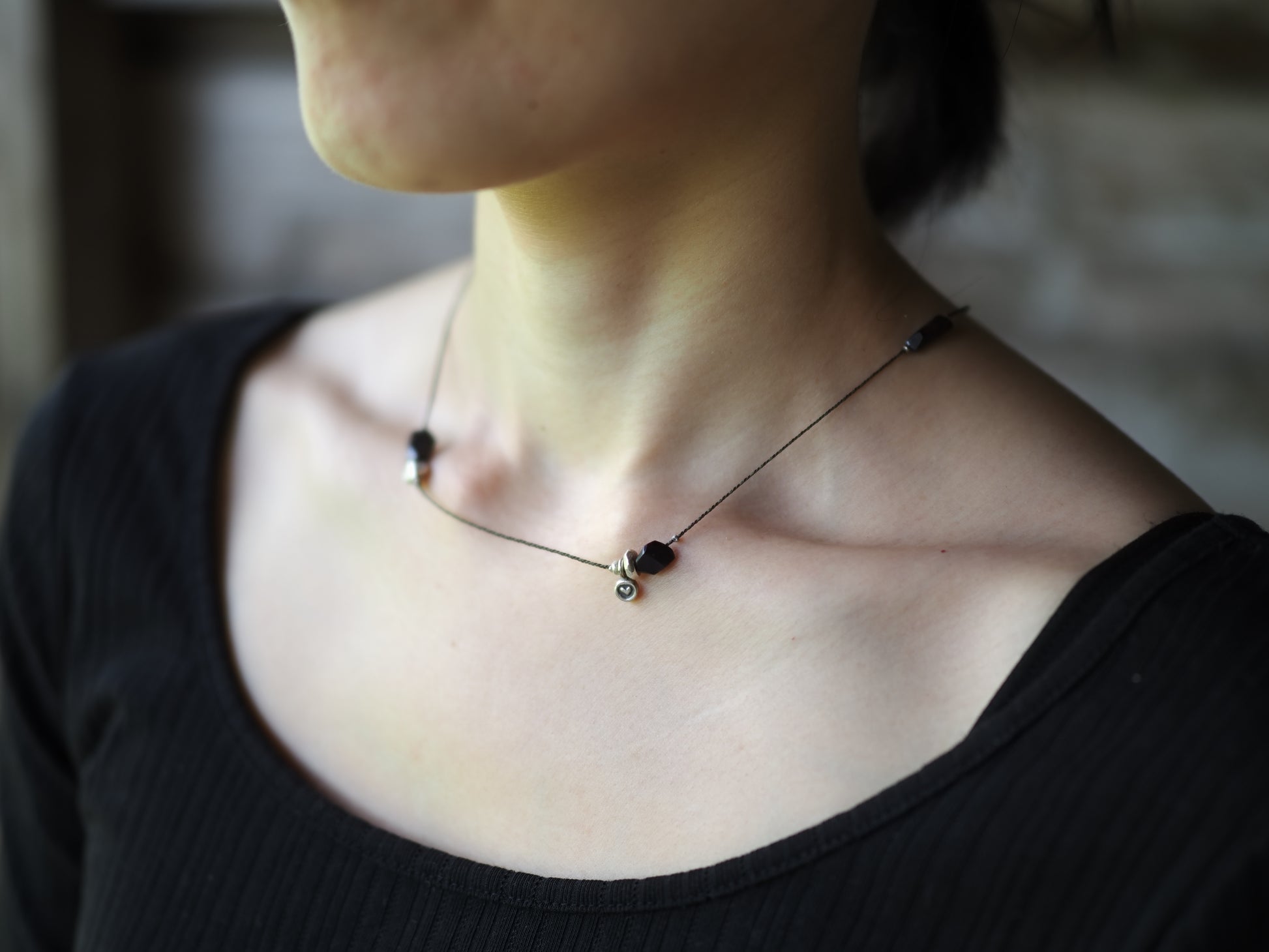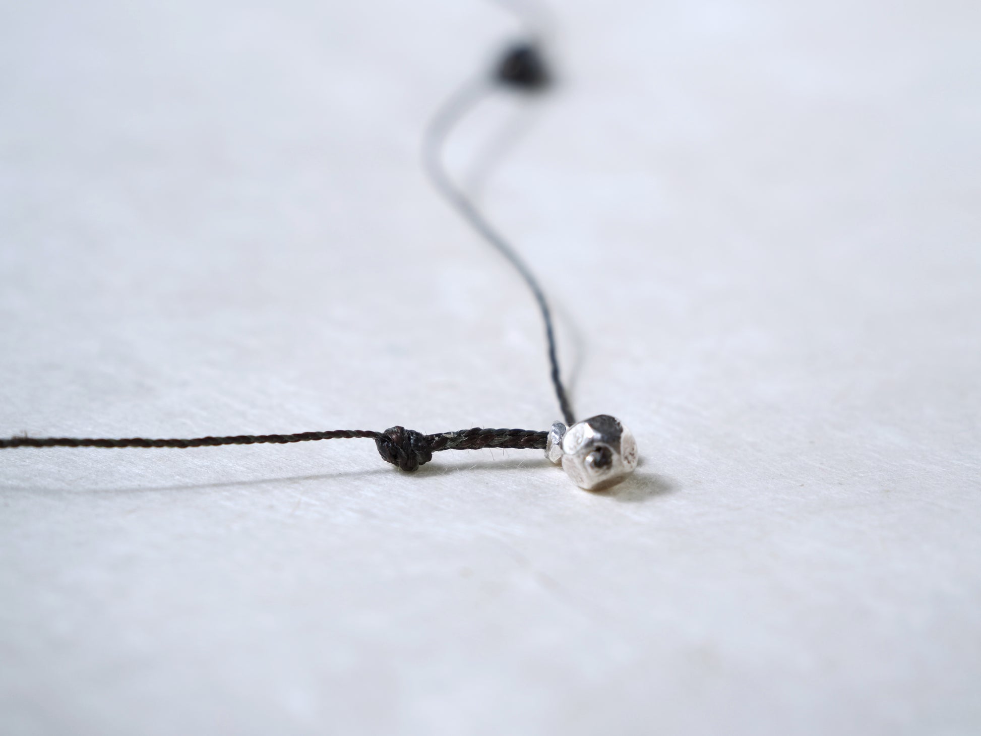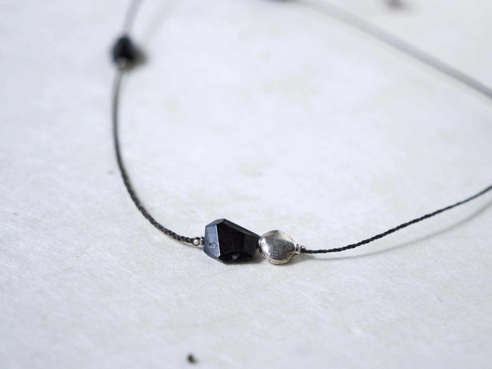 カレンシルバーのチャームやビーズと共にアシンメトリーに散りばめ、首周りをゆったりと装飾する細紐ネックレスに仕立てました。