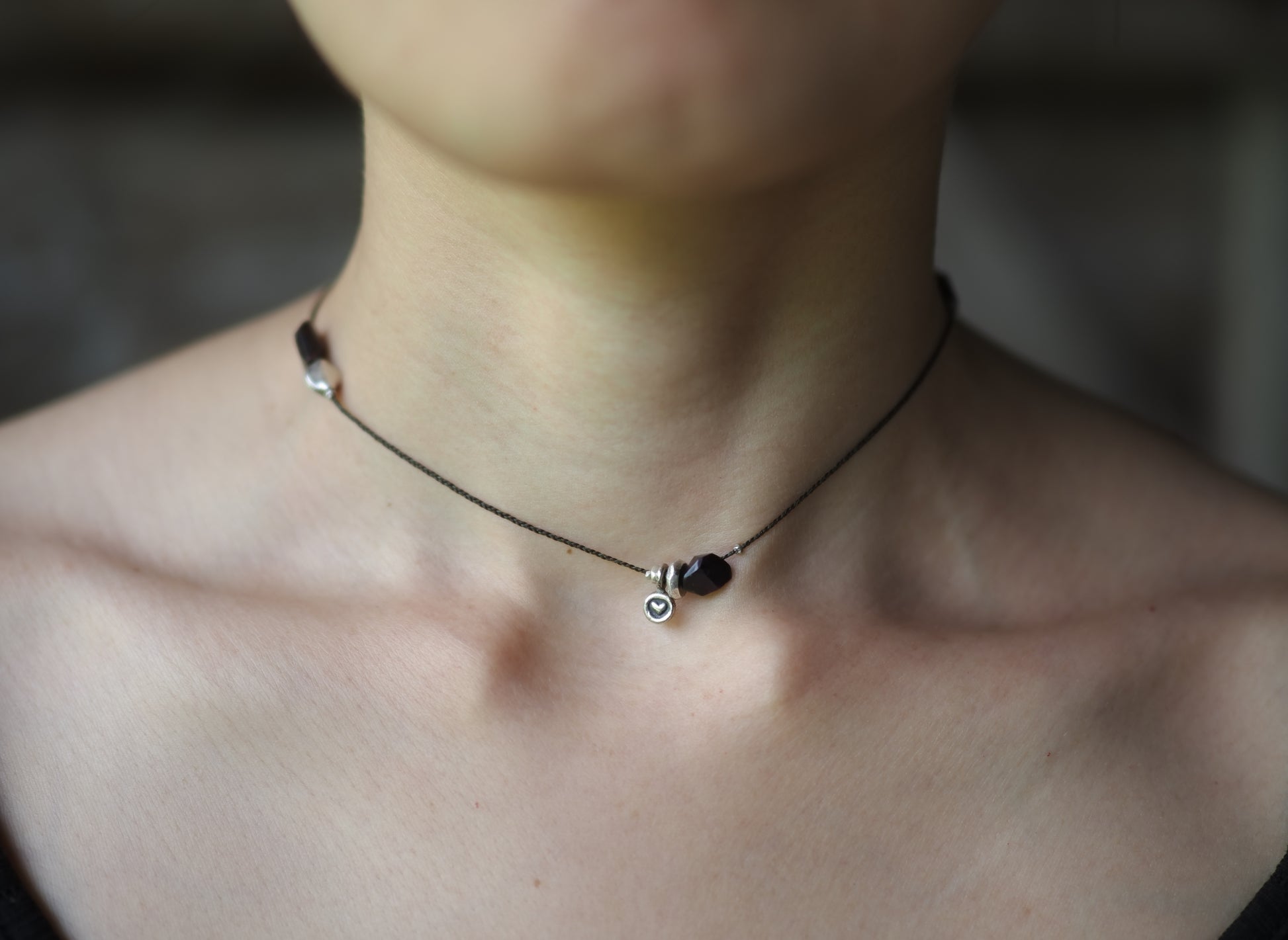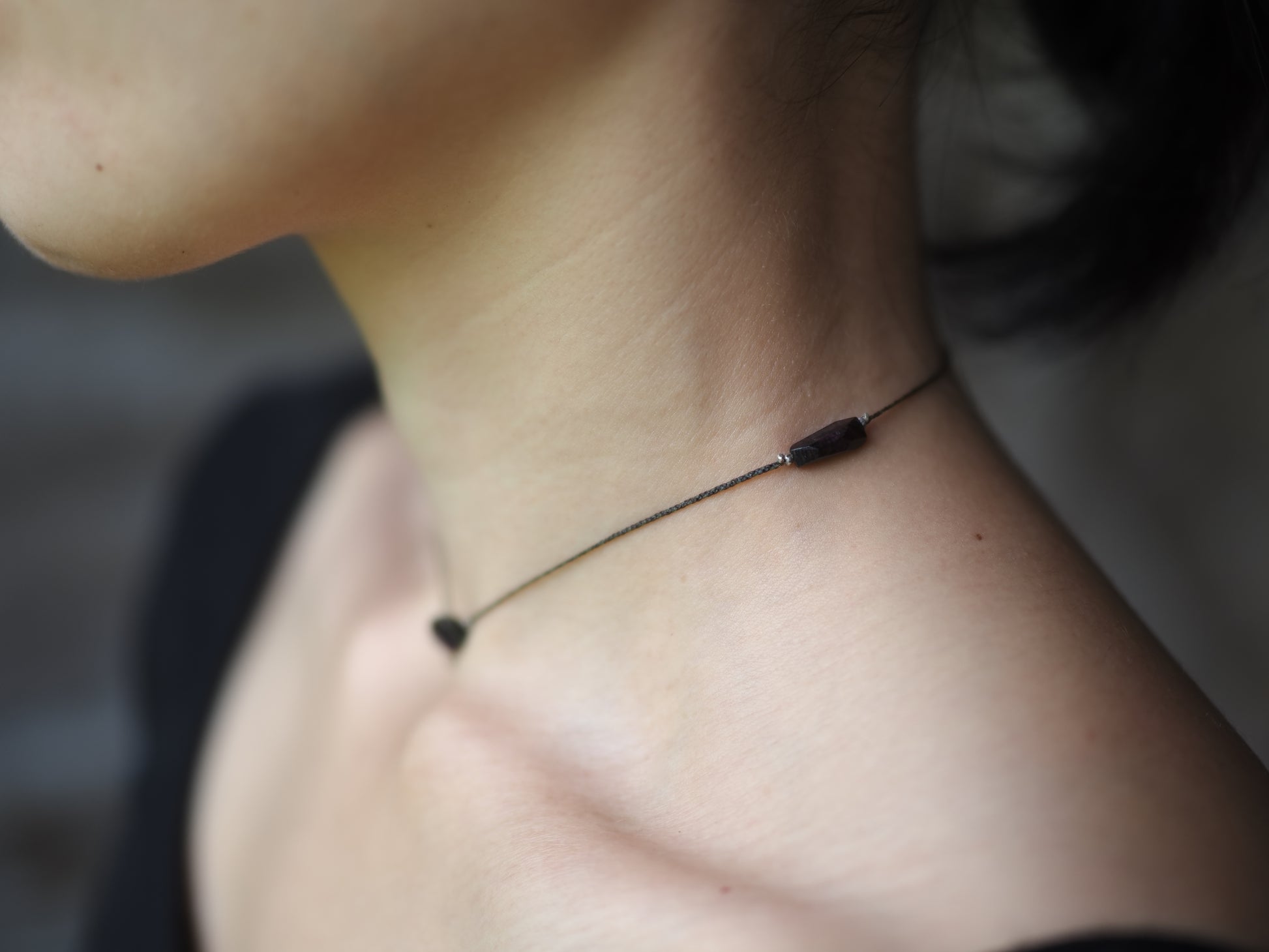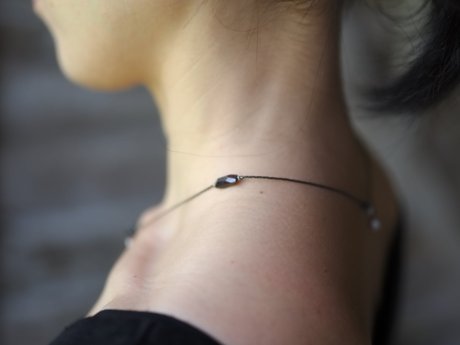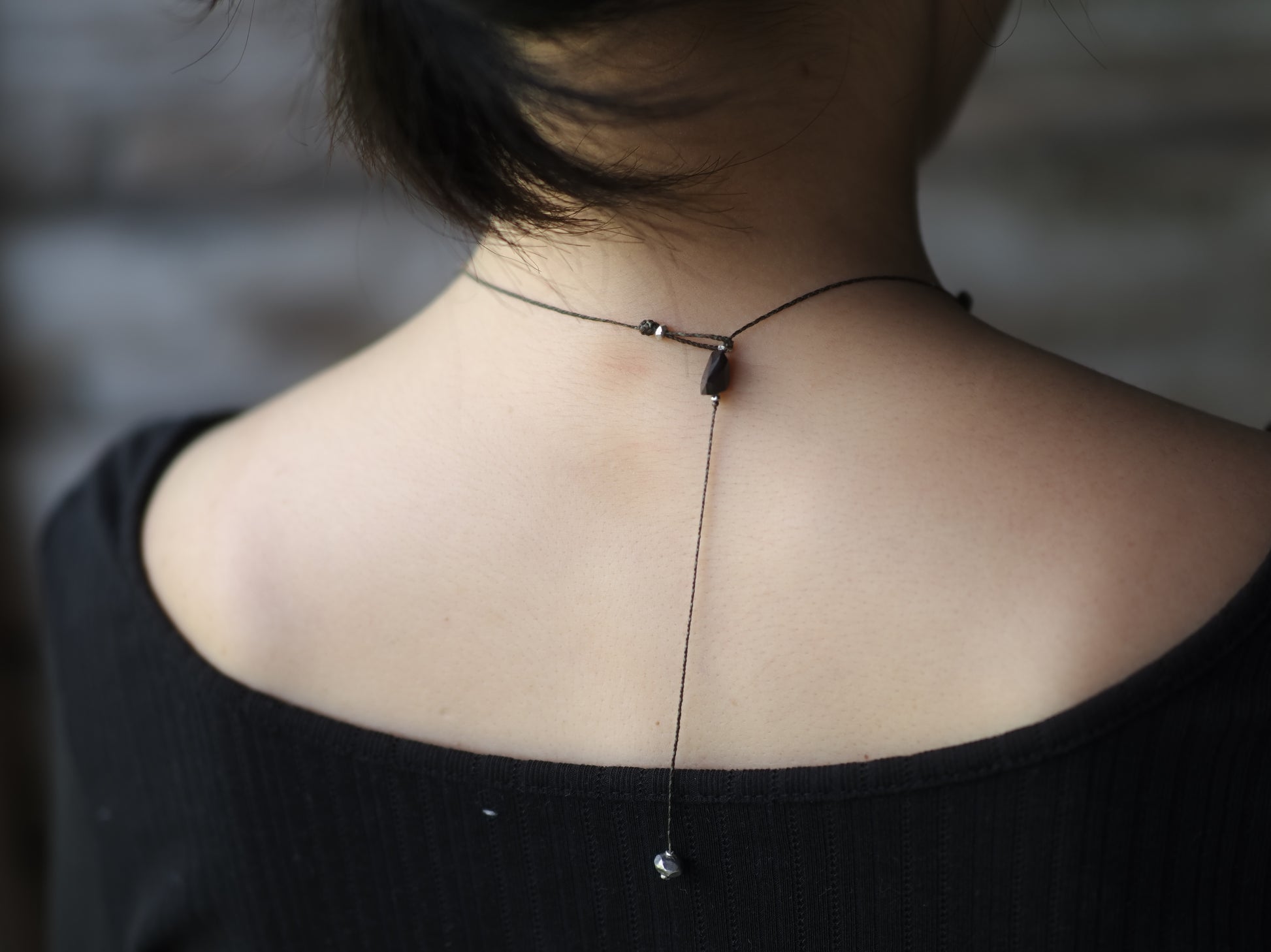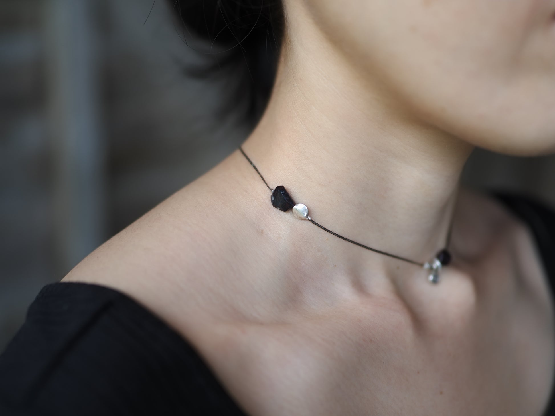 フープを1つ奥のビーズに引っ掛けて、首周りぴったりのチョーカーとしてもお使いいただけます。
