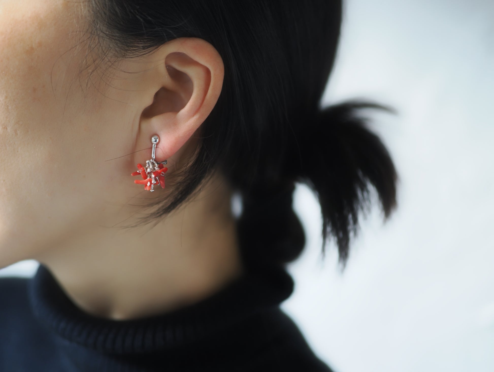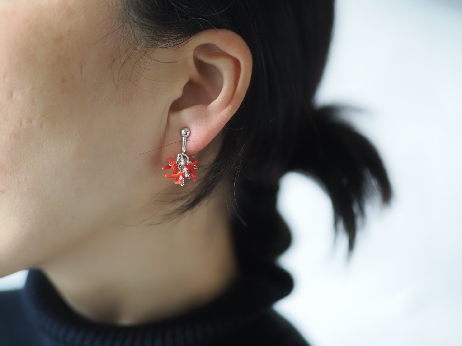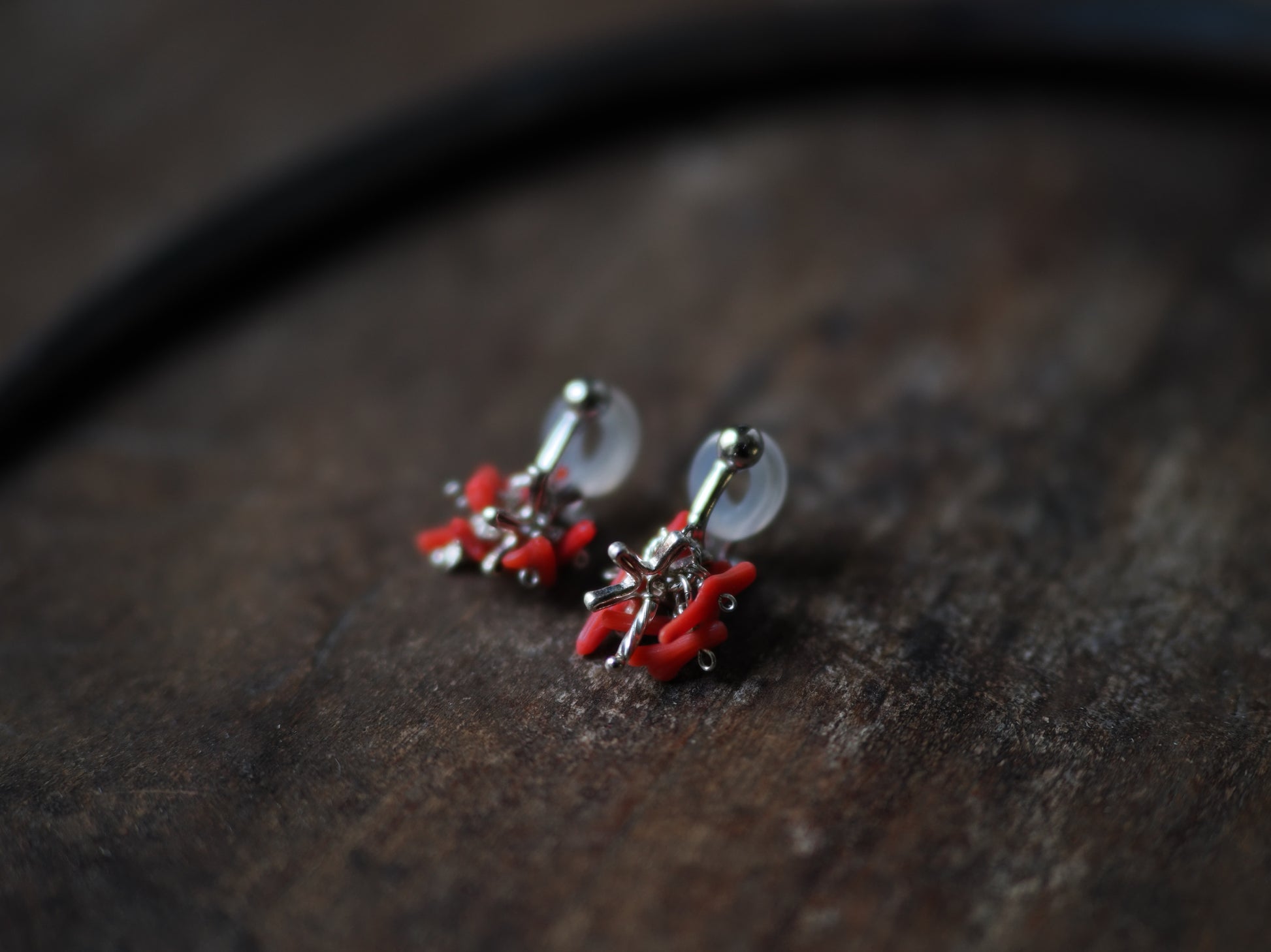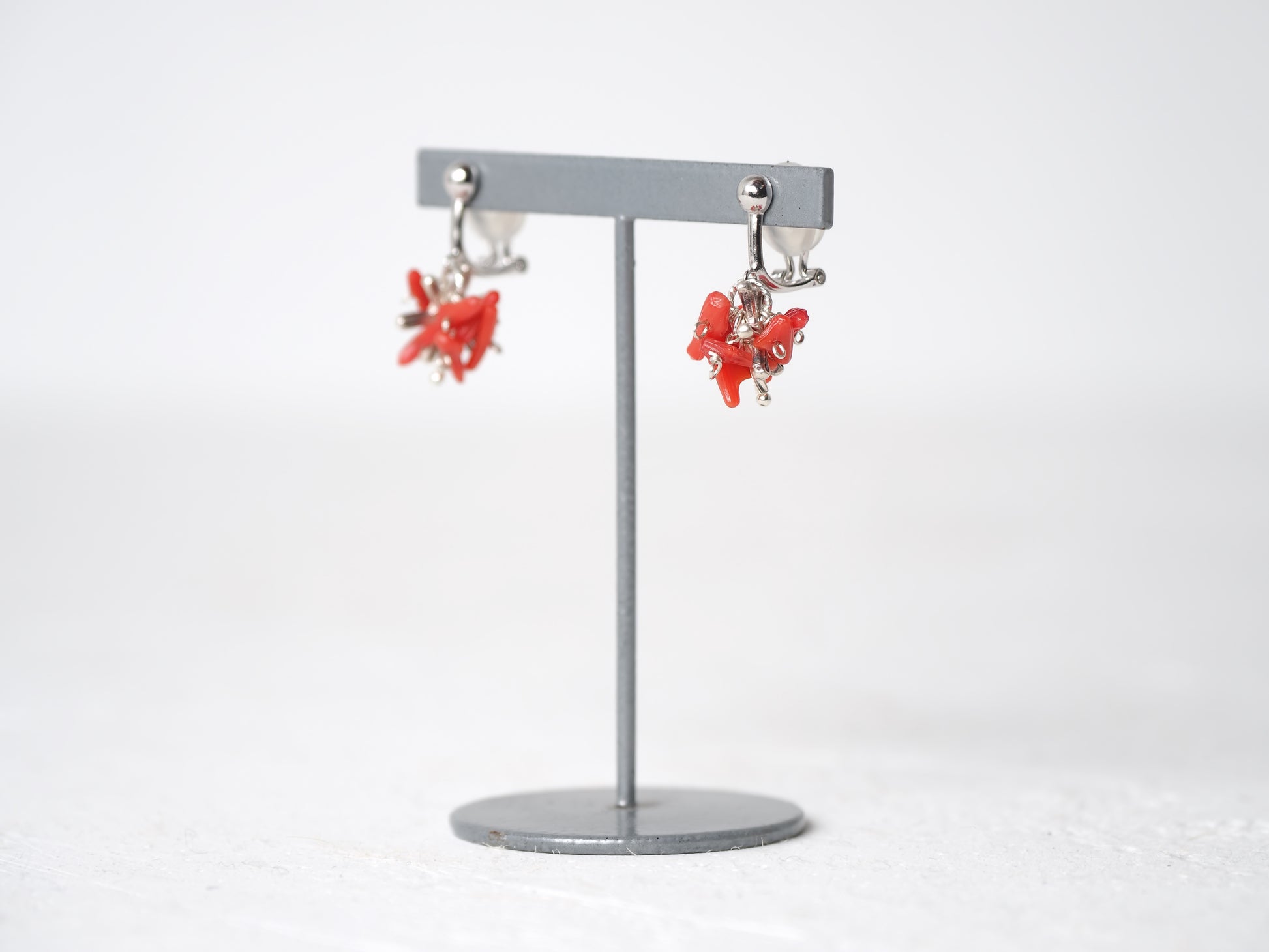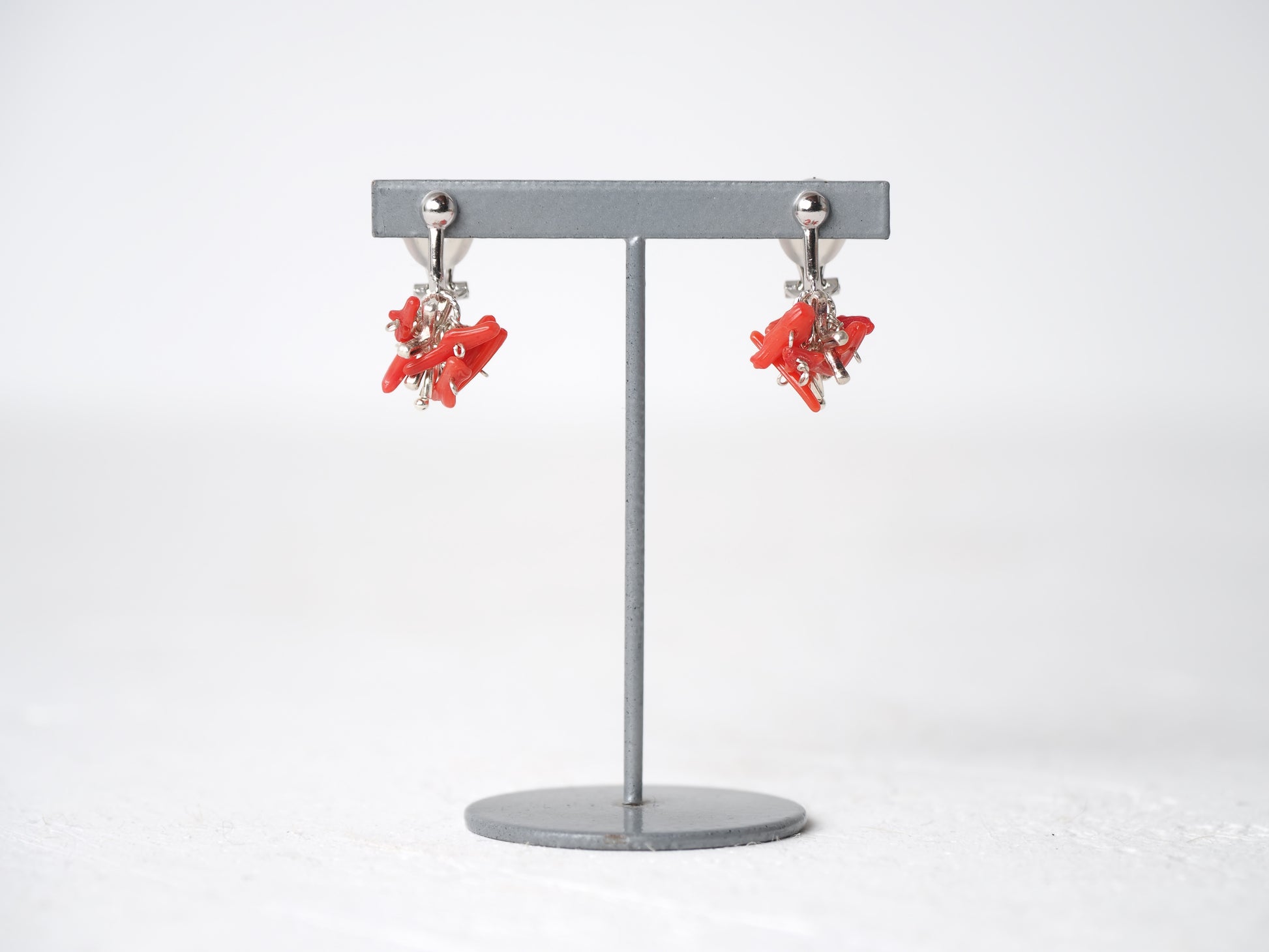ギュッと纏めた枝珊瑚にシルバーを差し込み、鮮やかなアクセントとなるイヤリングに仕立てました。