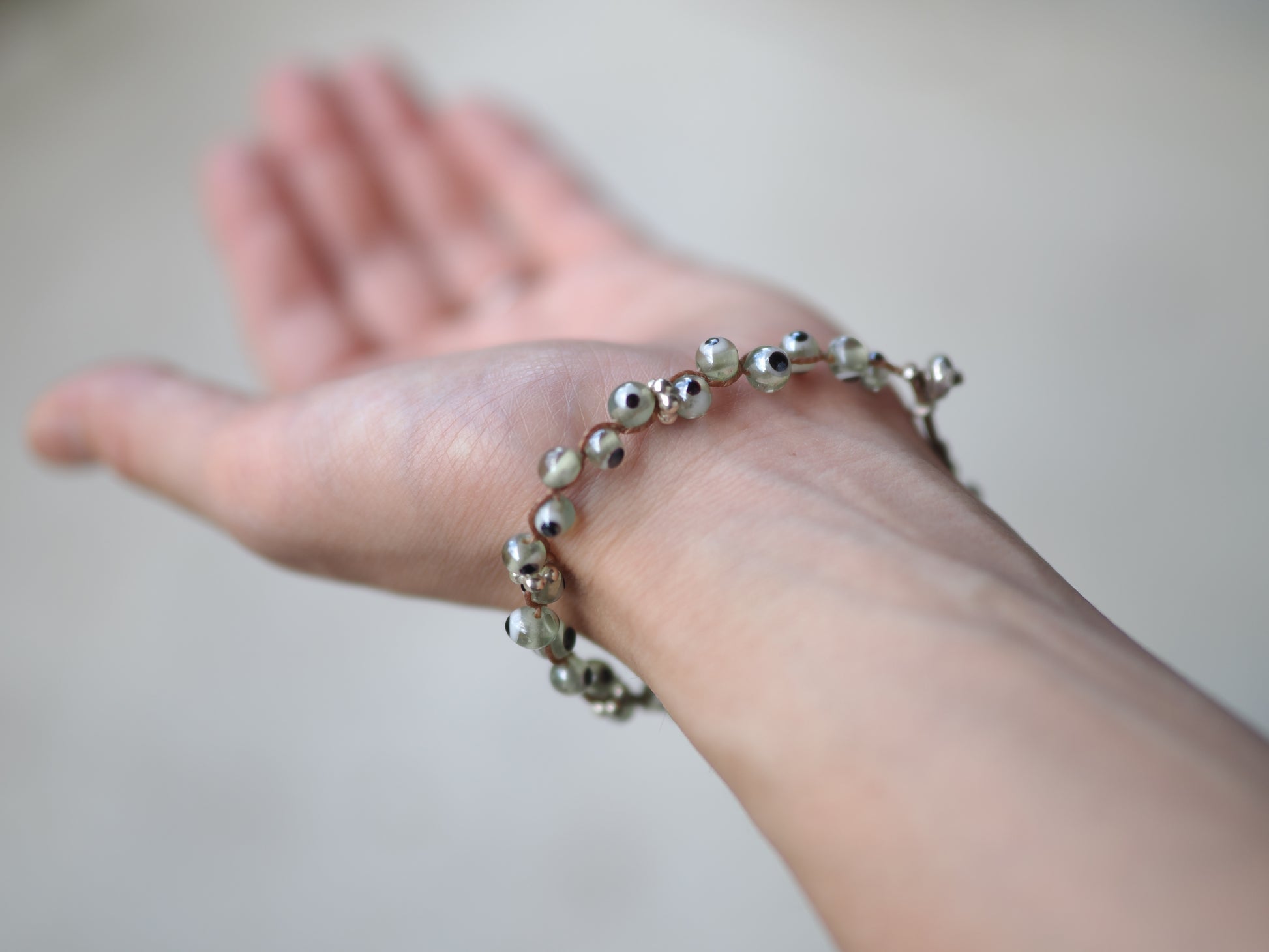 ライトなニュアンスと粒つぶのフォルムを活かし、ギュッと纏まった編み込みのブレスレットに仕立てました。