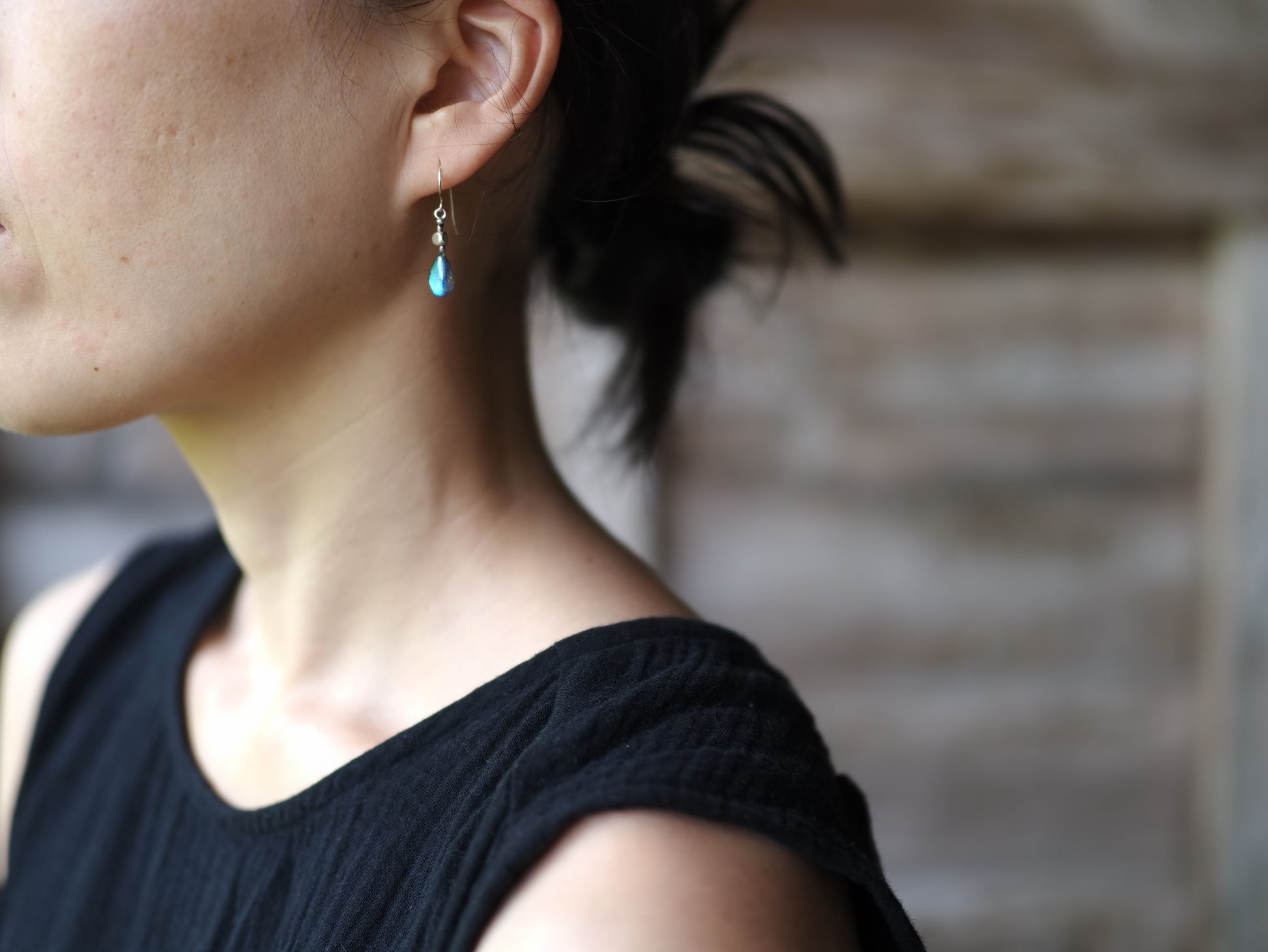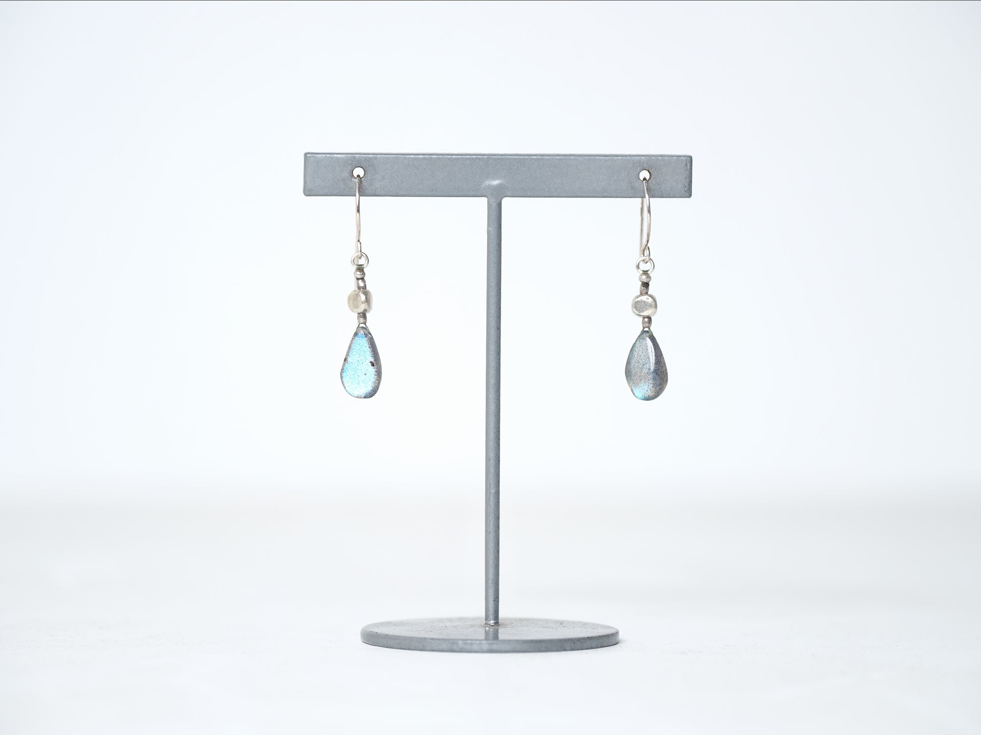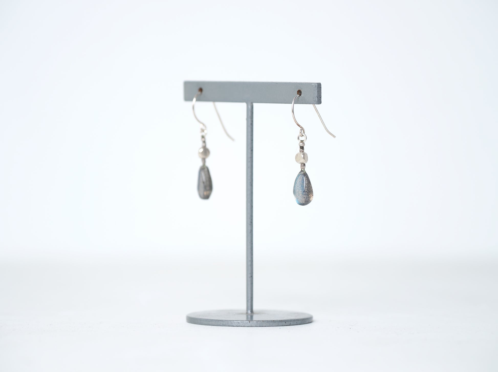 つるんとした雫型の粒をシルバービーズと共に組み合わせ、さり気ない存在感のショートピアスに仕立てました。