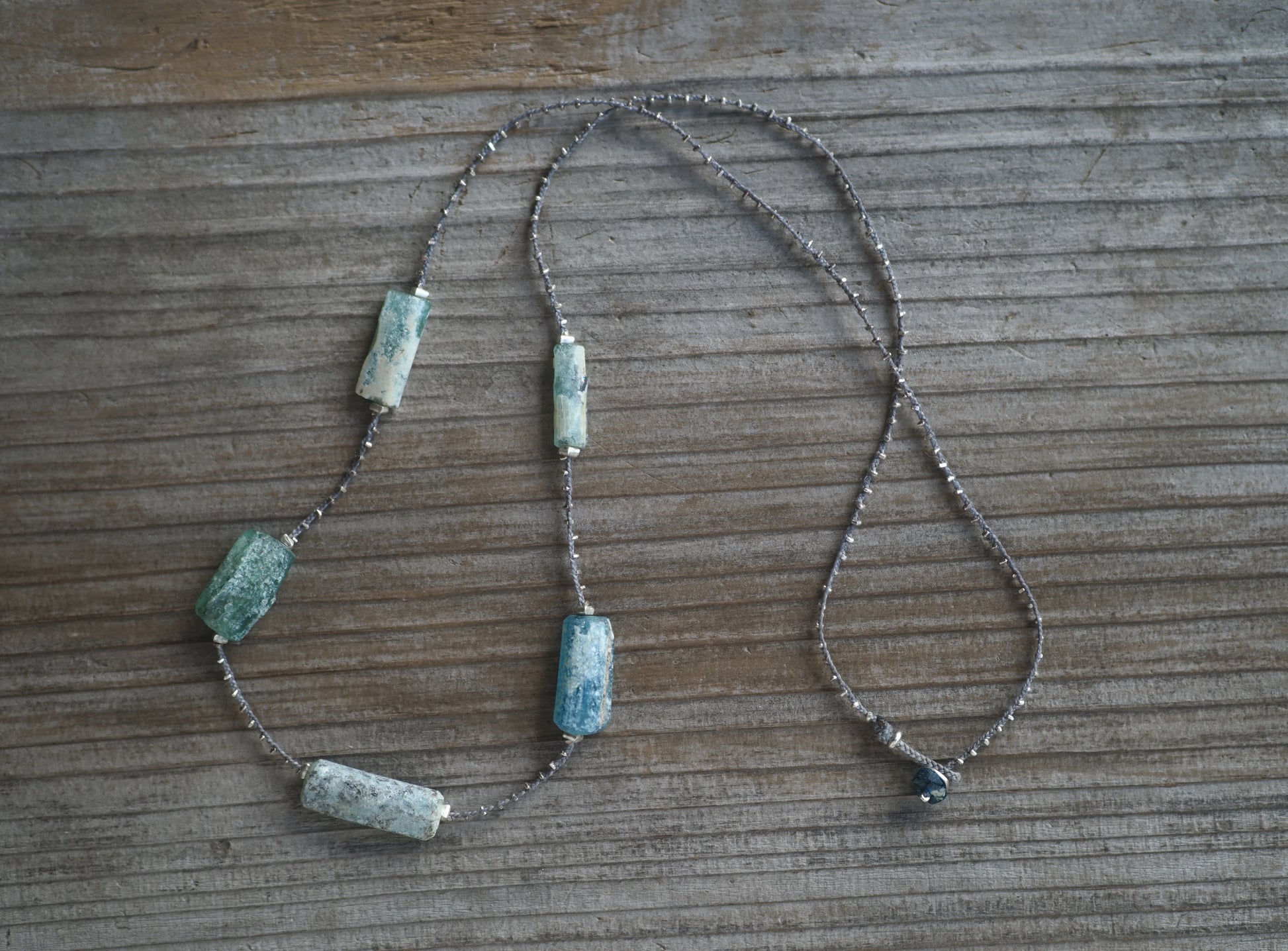 淡く軽やかな水色をベースに粒毎に異なる表情を楽しませてくれるローマングラス
