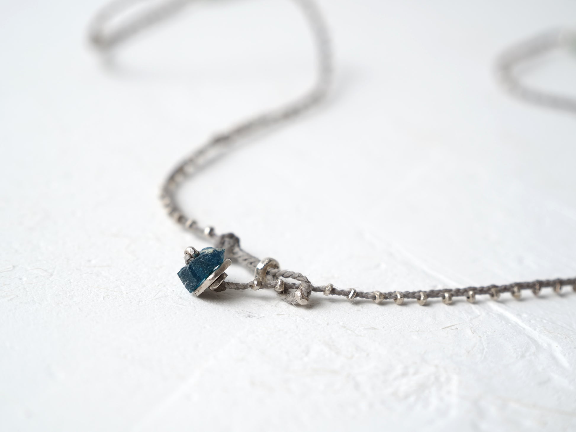 グレーの紐に細かなシルバーチップを編み込み、繊細かつ軽やかな印象のロングネックレスに仕立てました。