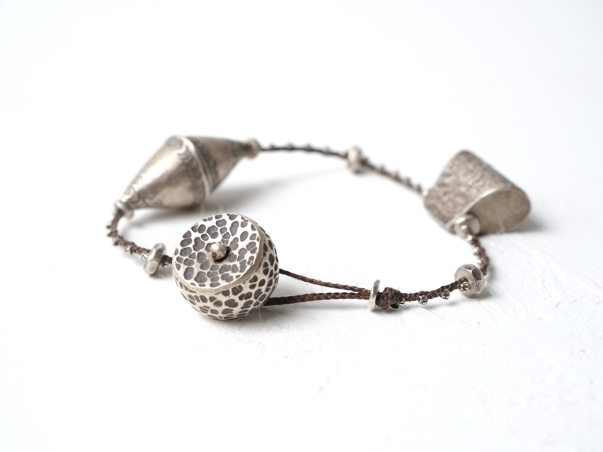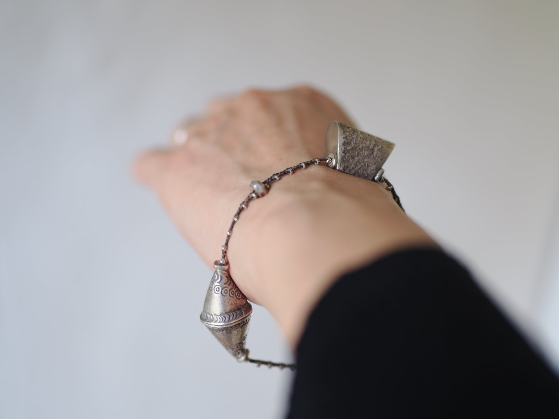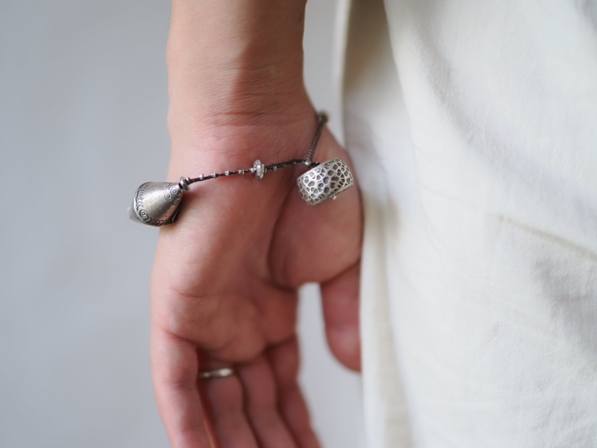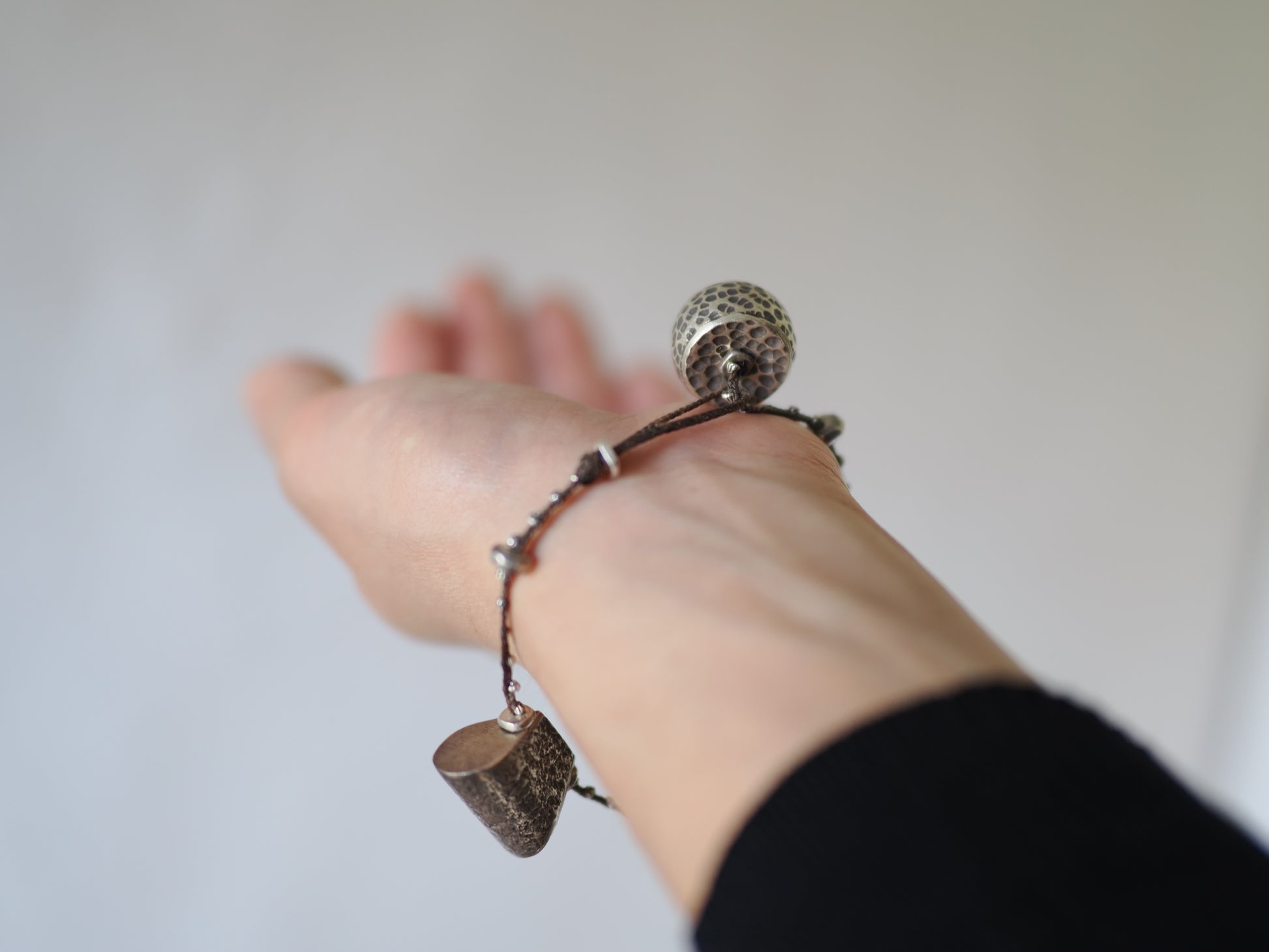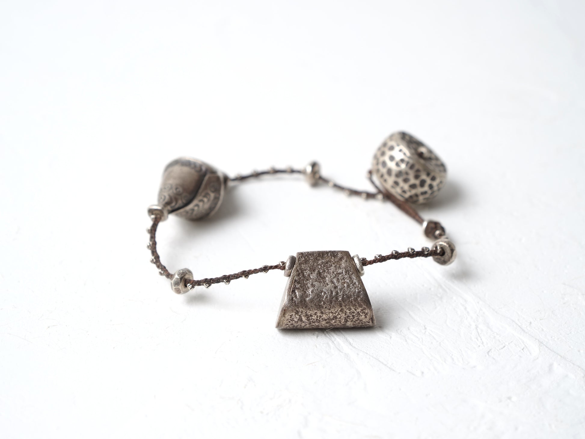 シルバービーズの編み込み紐で繋ぎ、シルエットの個性的なカジュアルブレスレットに仕立てました。