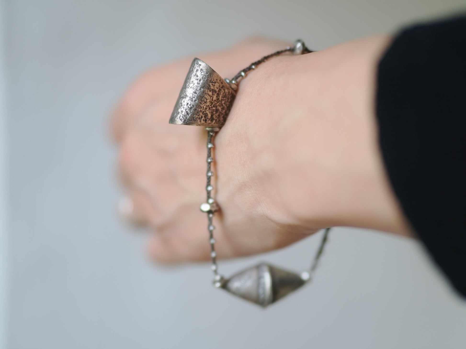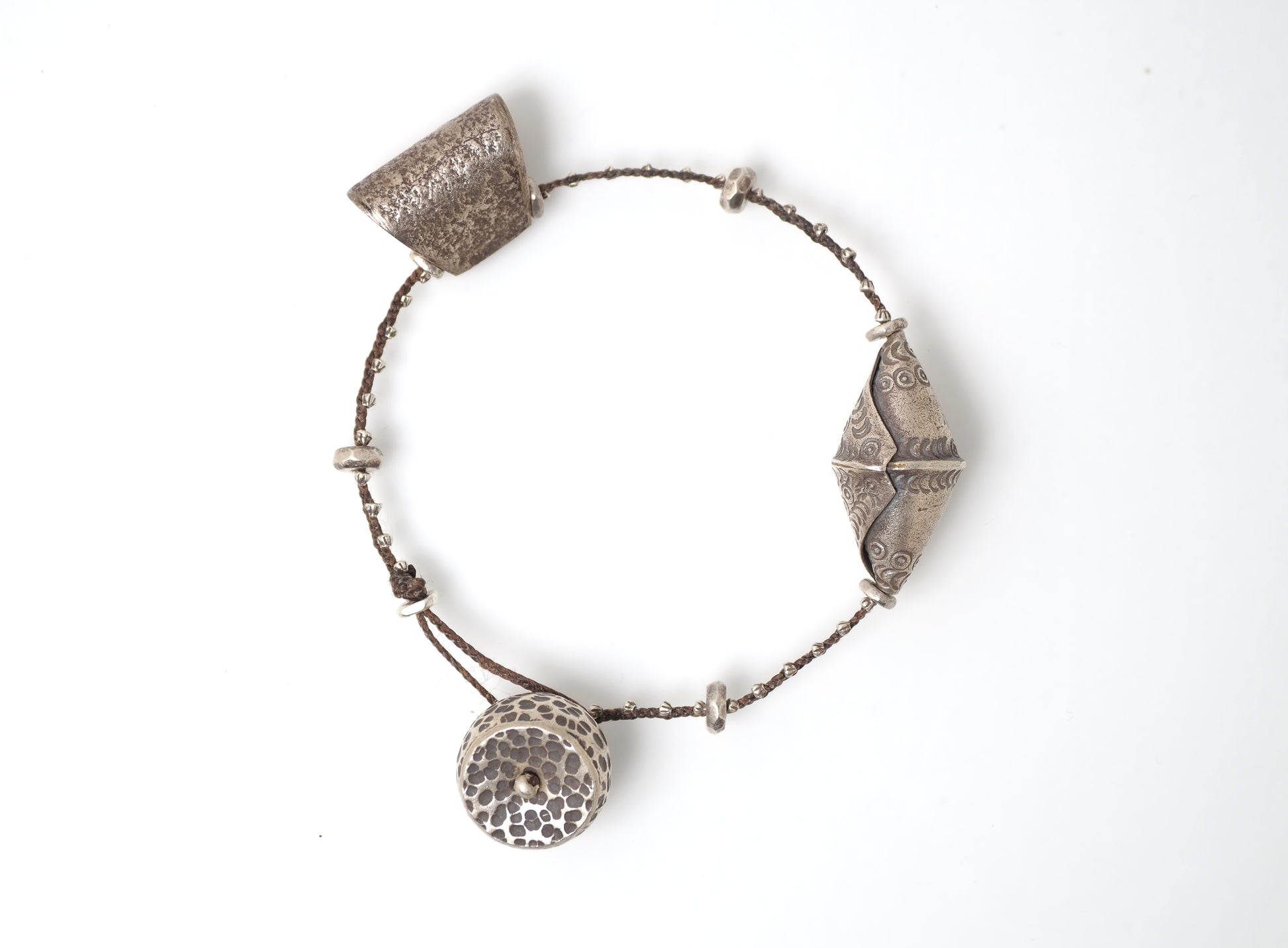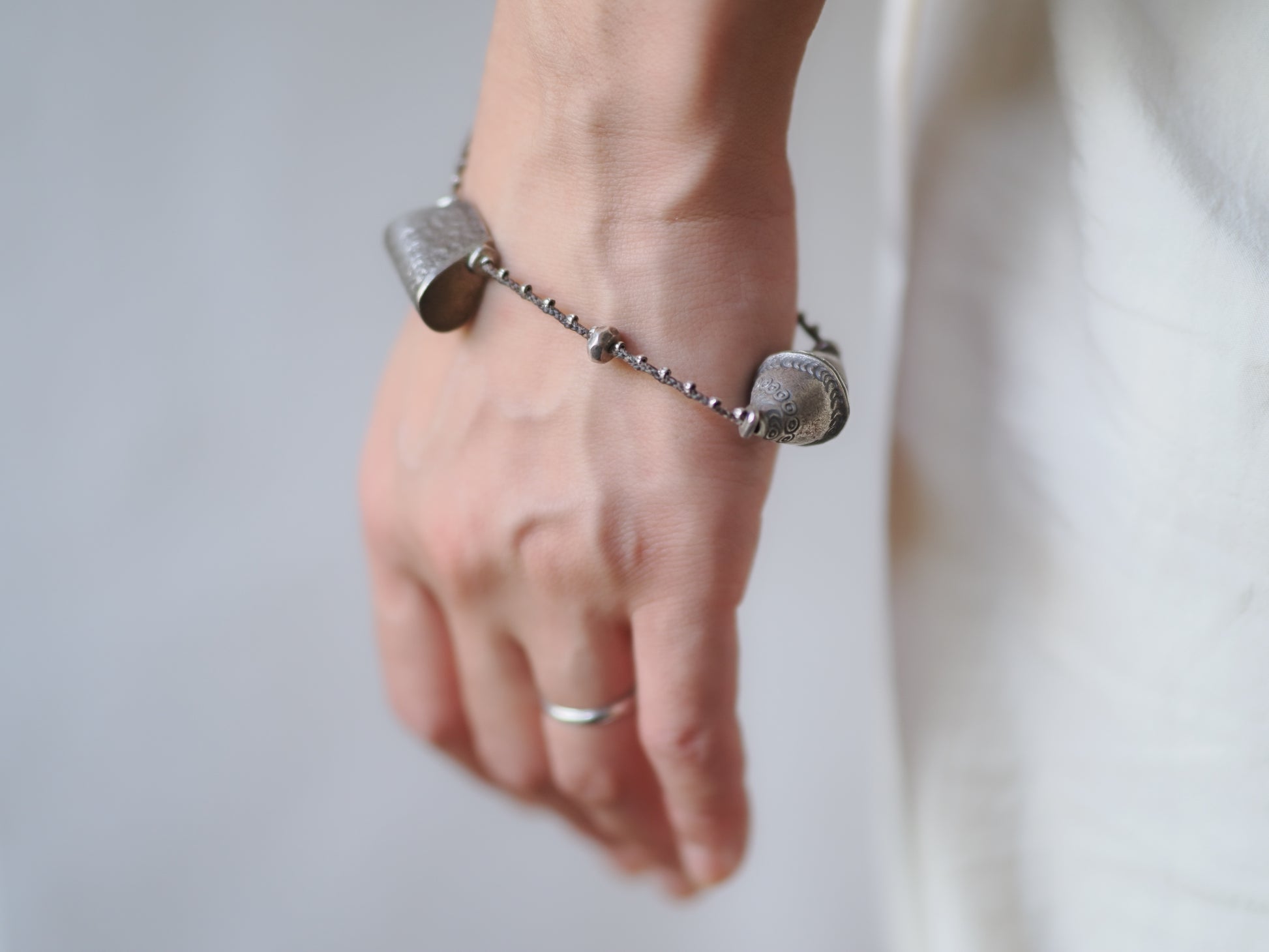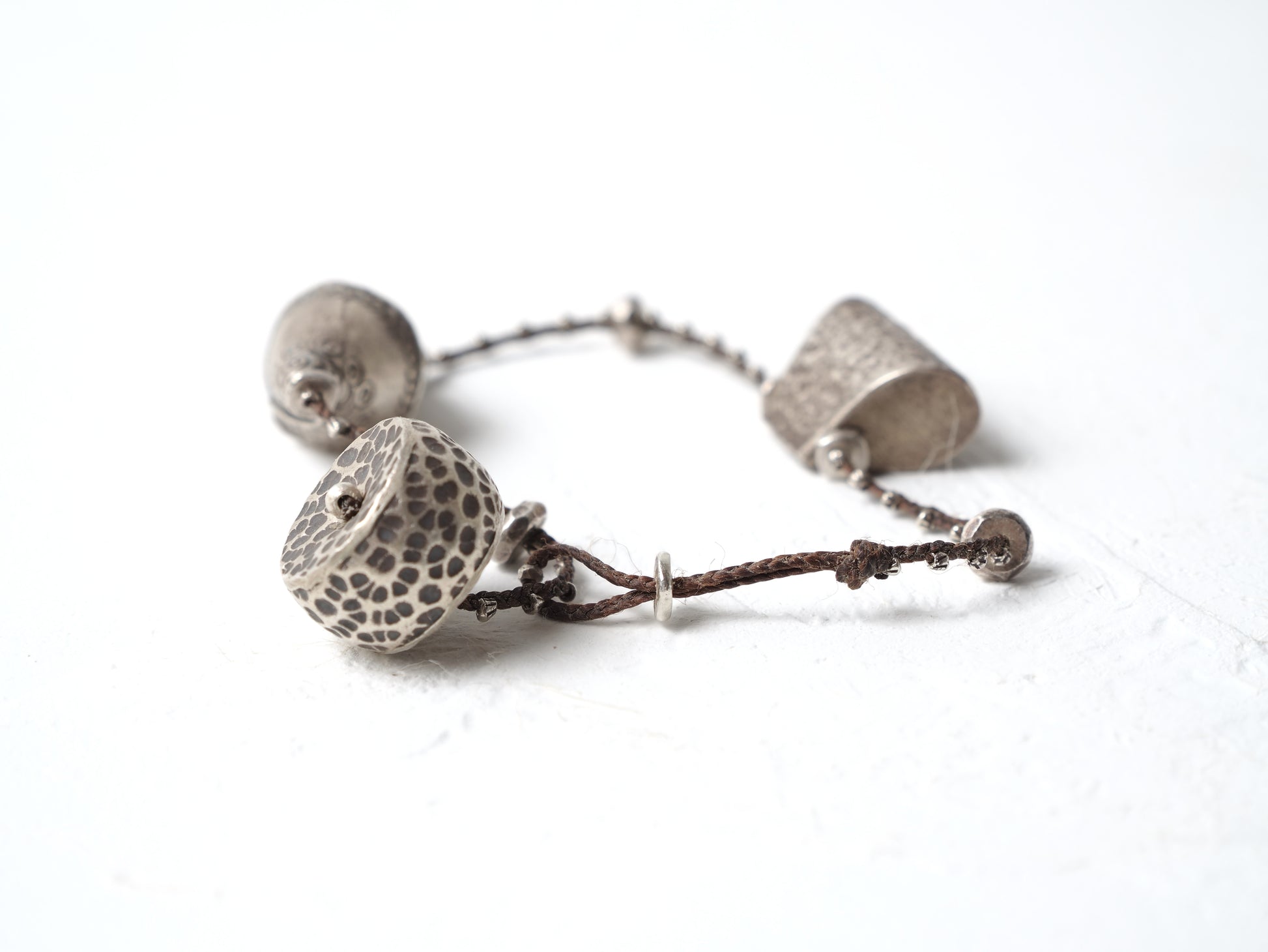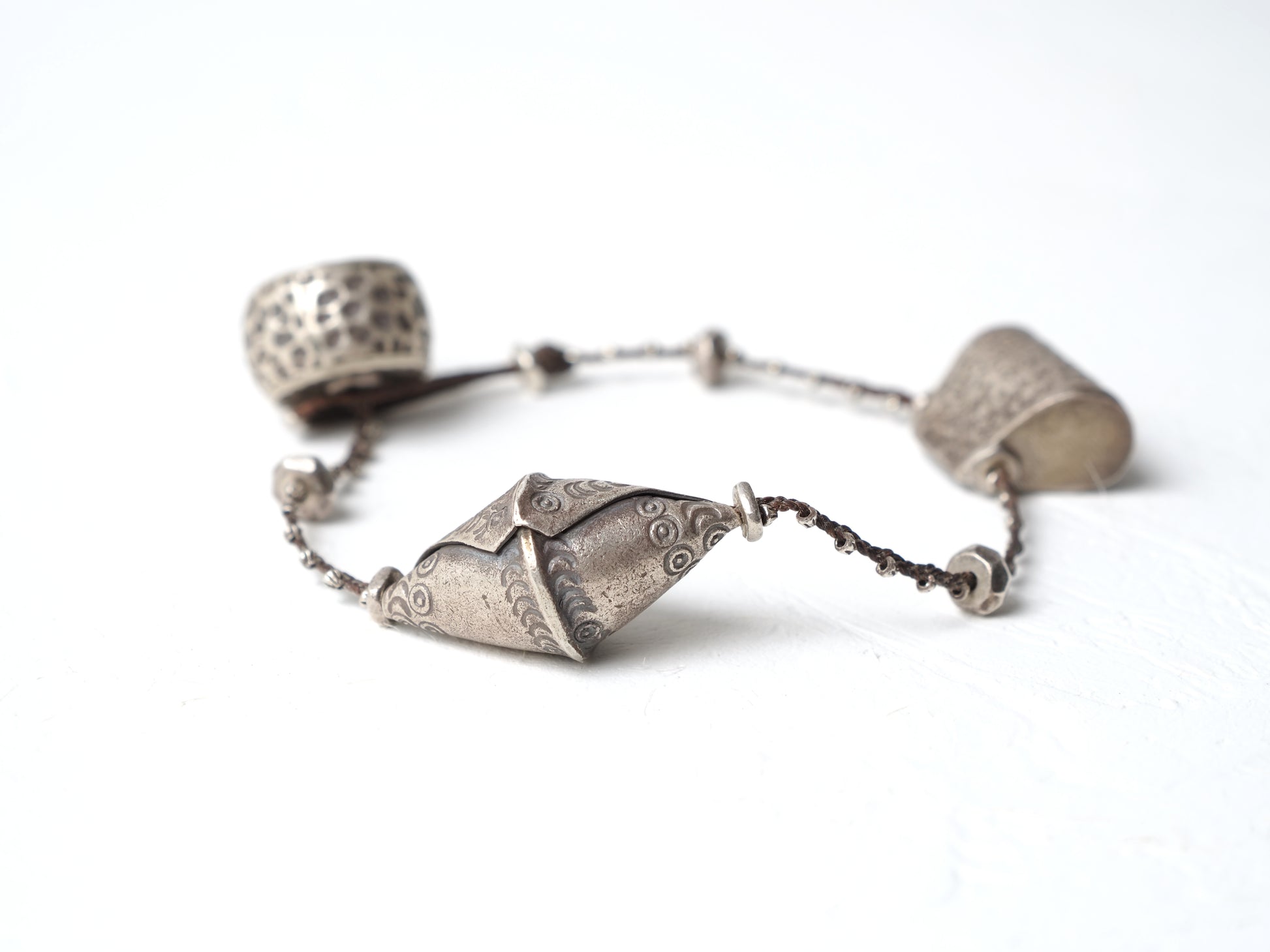 シルバービーズの編み込み紐で繋ぎ、シルエットの個性的なカジュアルブレスレットに仕立てました。