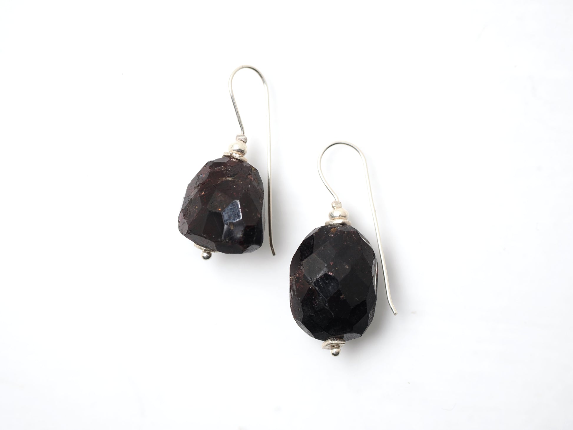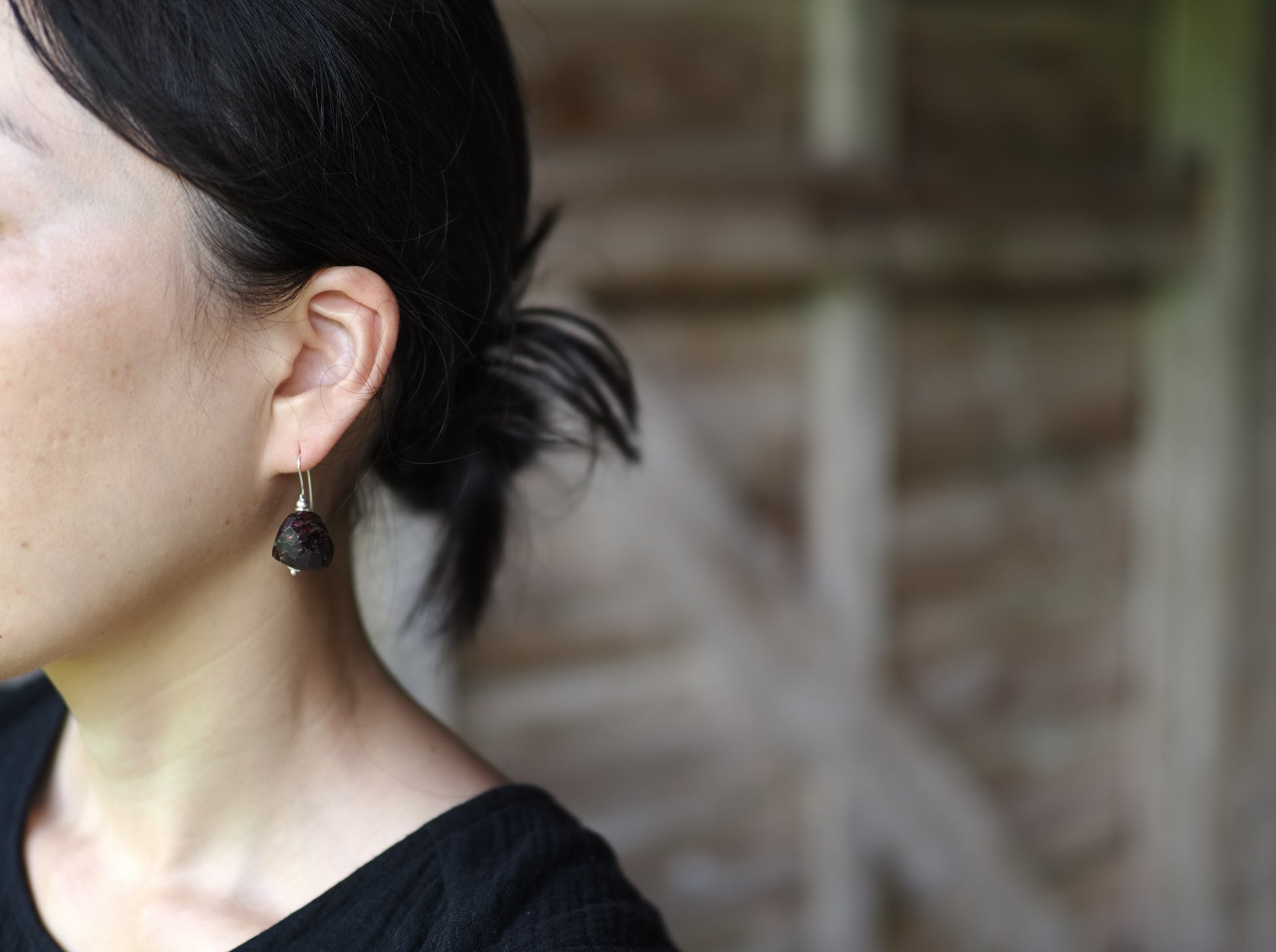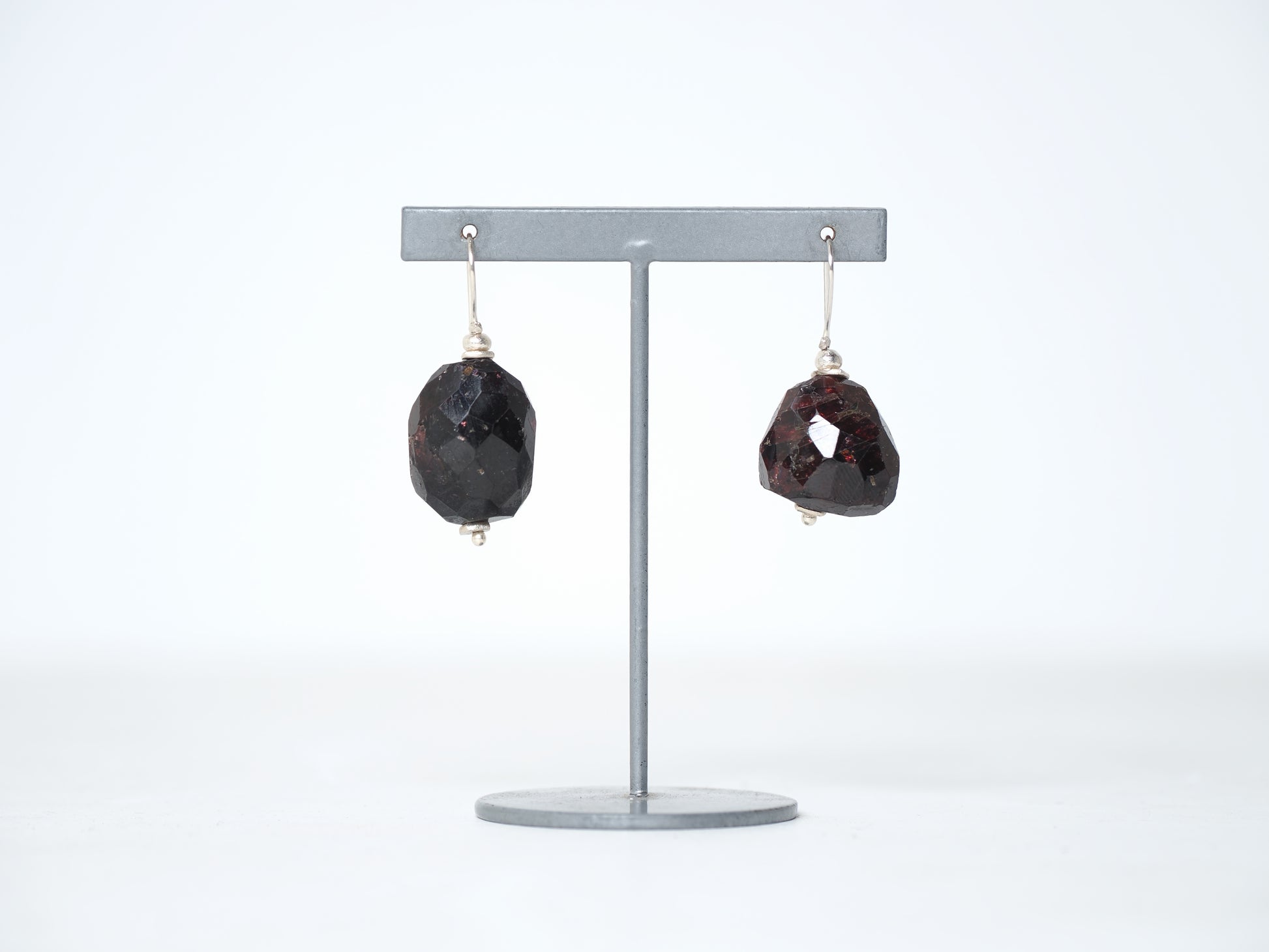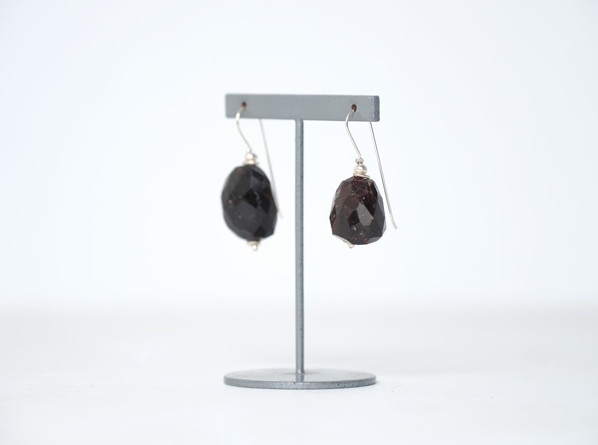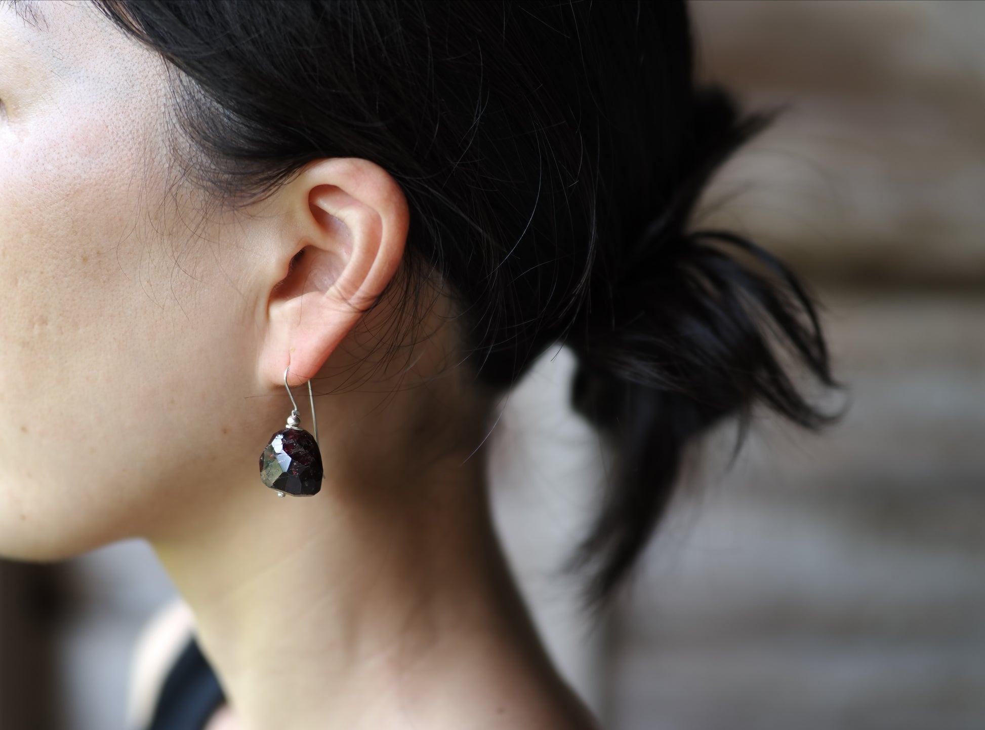 耳もとに近い場所でゆったりと揺れる大粒ガーネット、アクセントとして力強く装いを引き立てます。