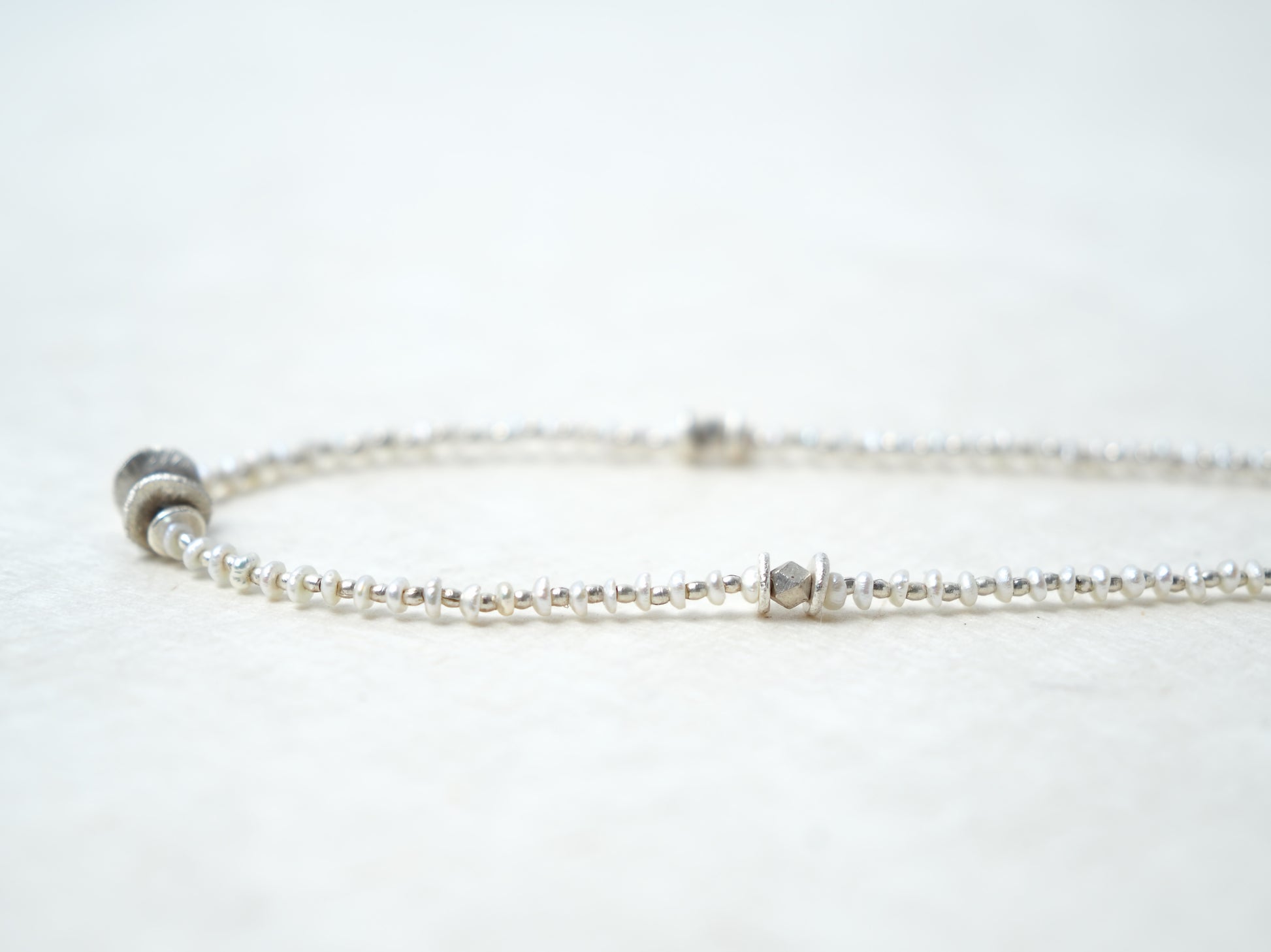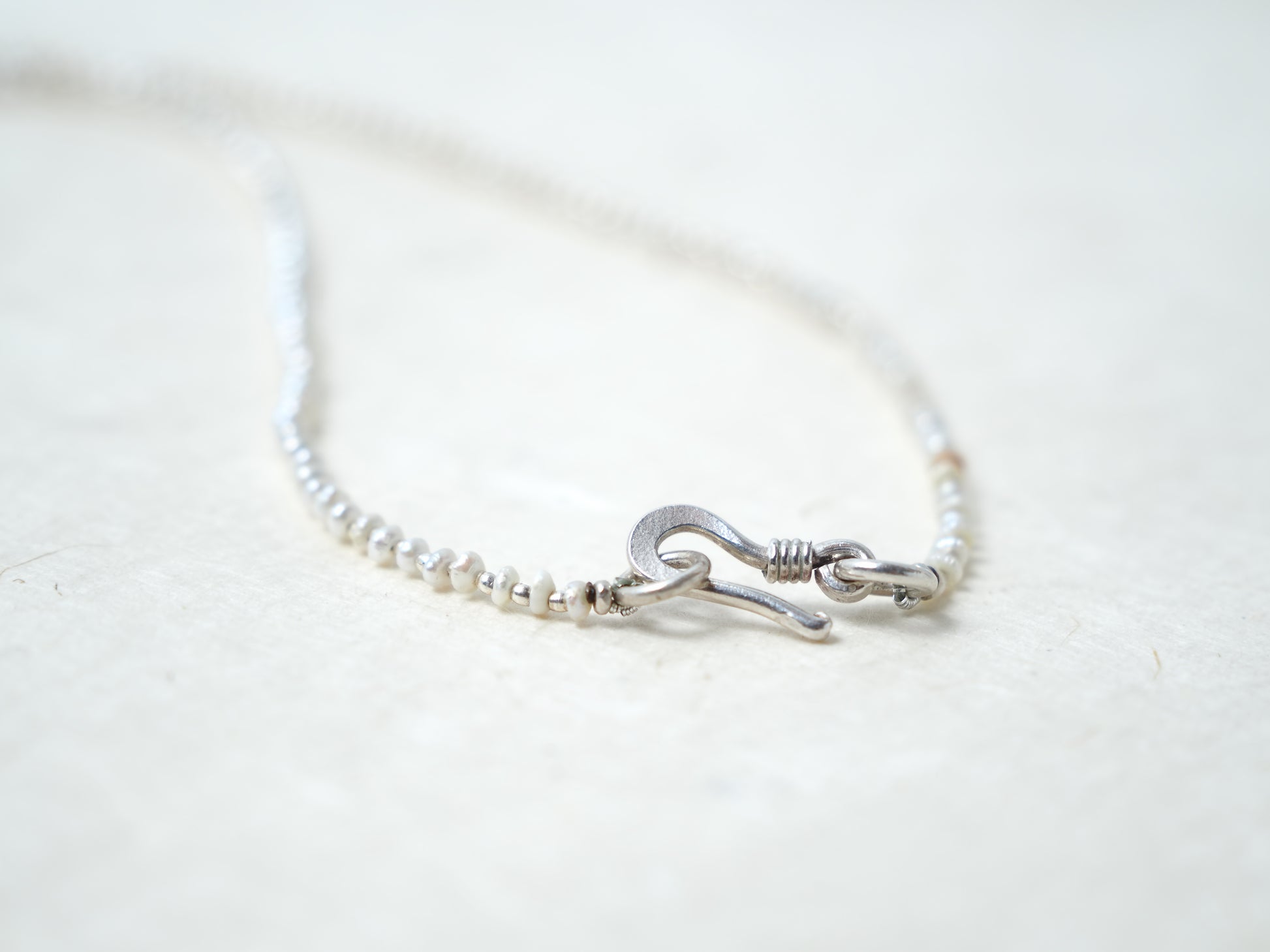 ネックラインには円盤のようにフラットなケシパールと極小シルバーを丁寧に連ねて、、