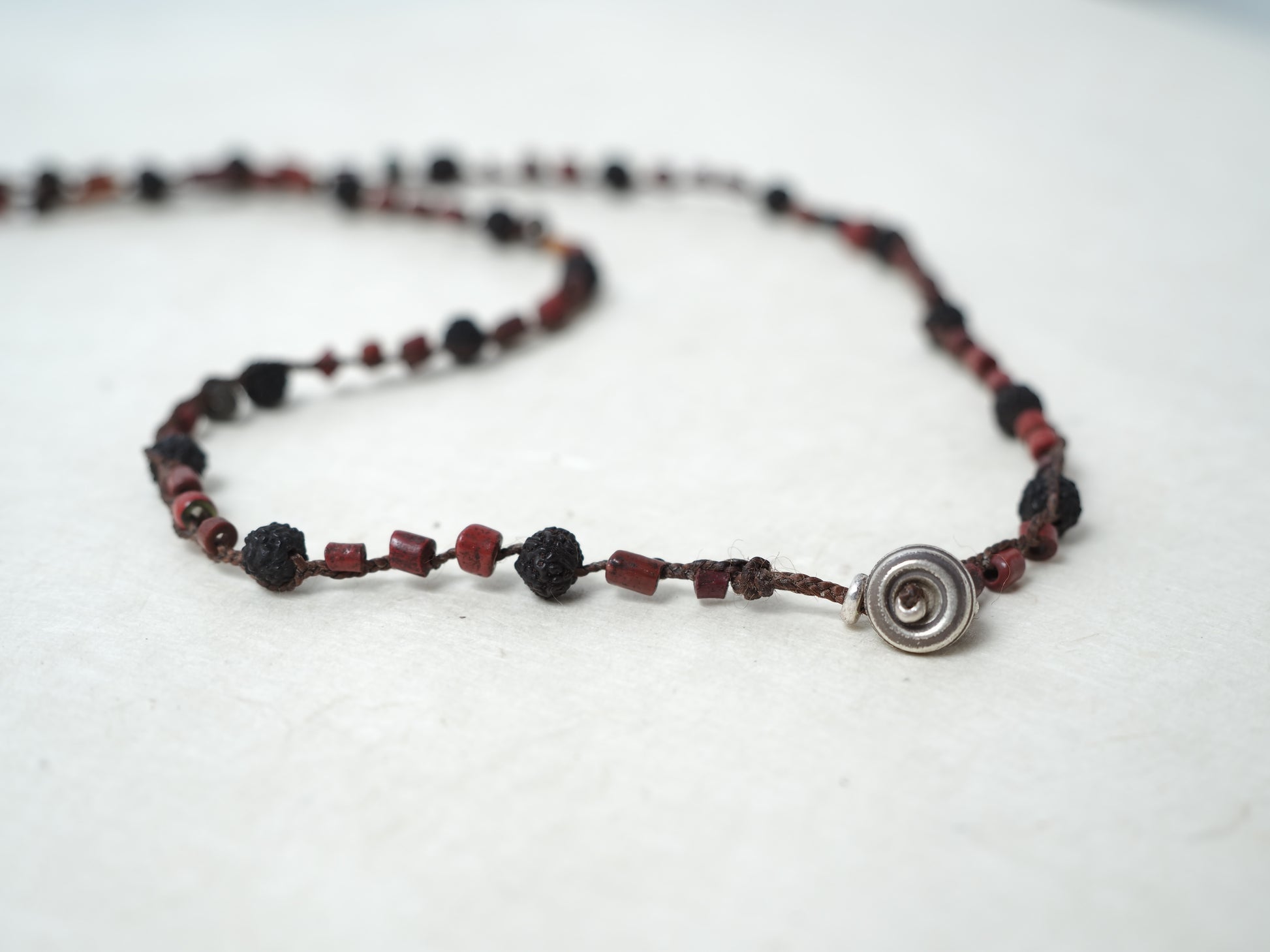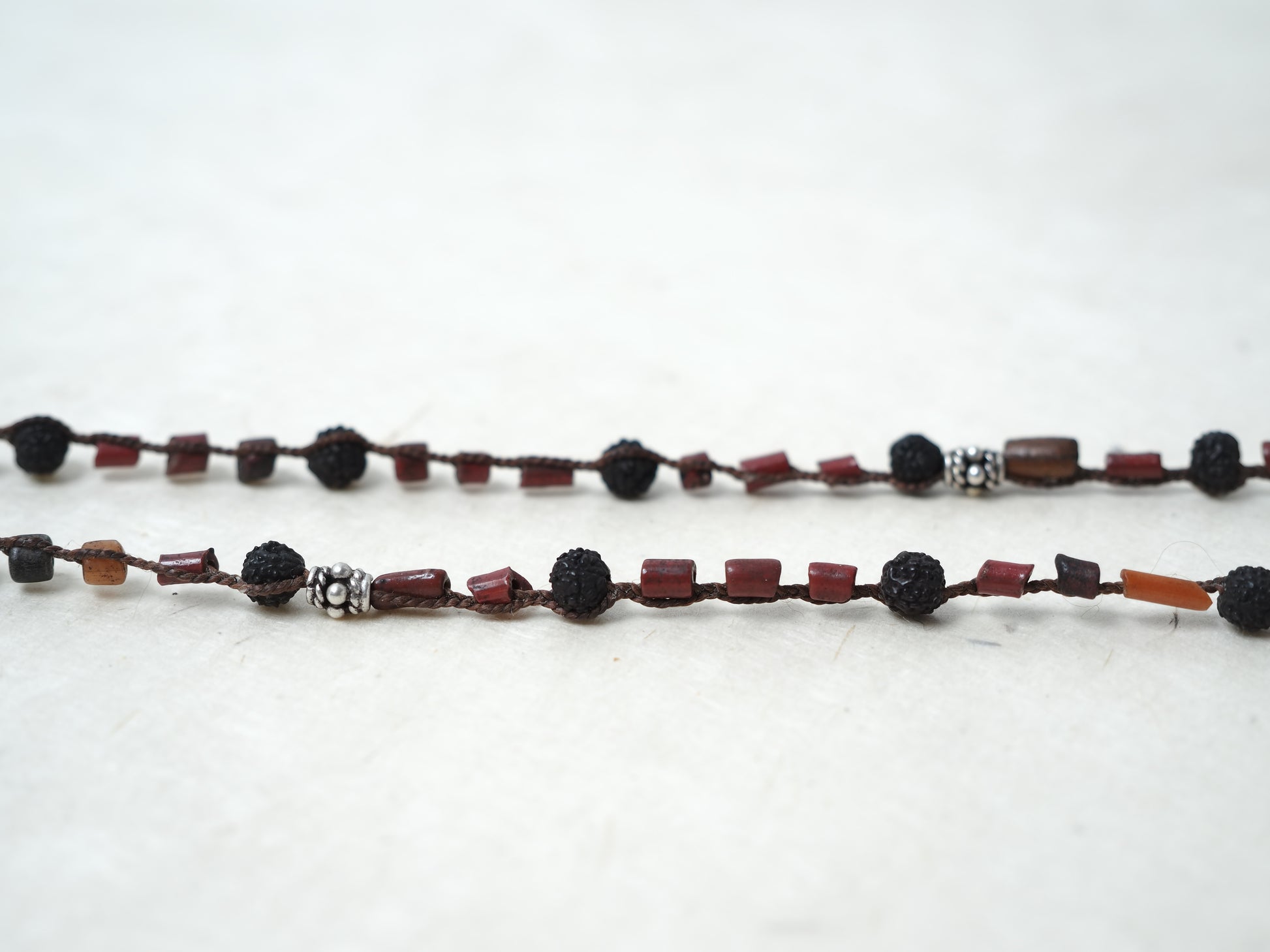 天然石で仕立てられたオリッサ州のオールド・トライバルビーズと黒色ルドラクシャを編み込み、大胆なシルエットのロングネックレスに仕立てました。