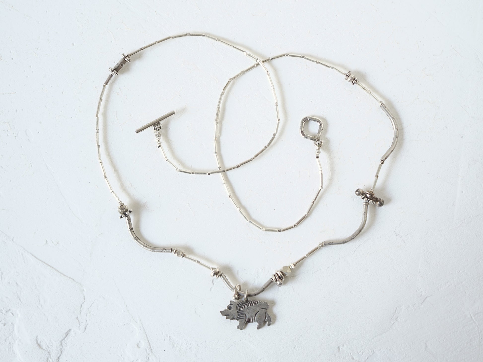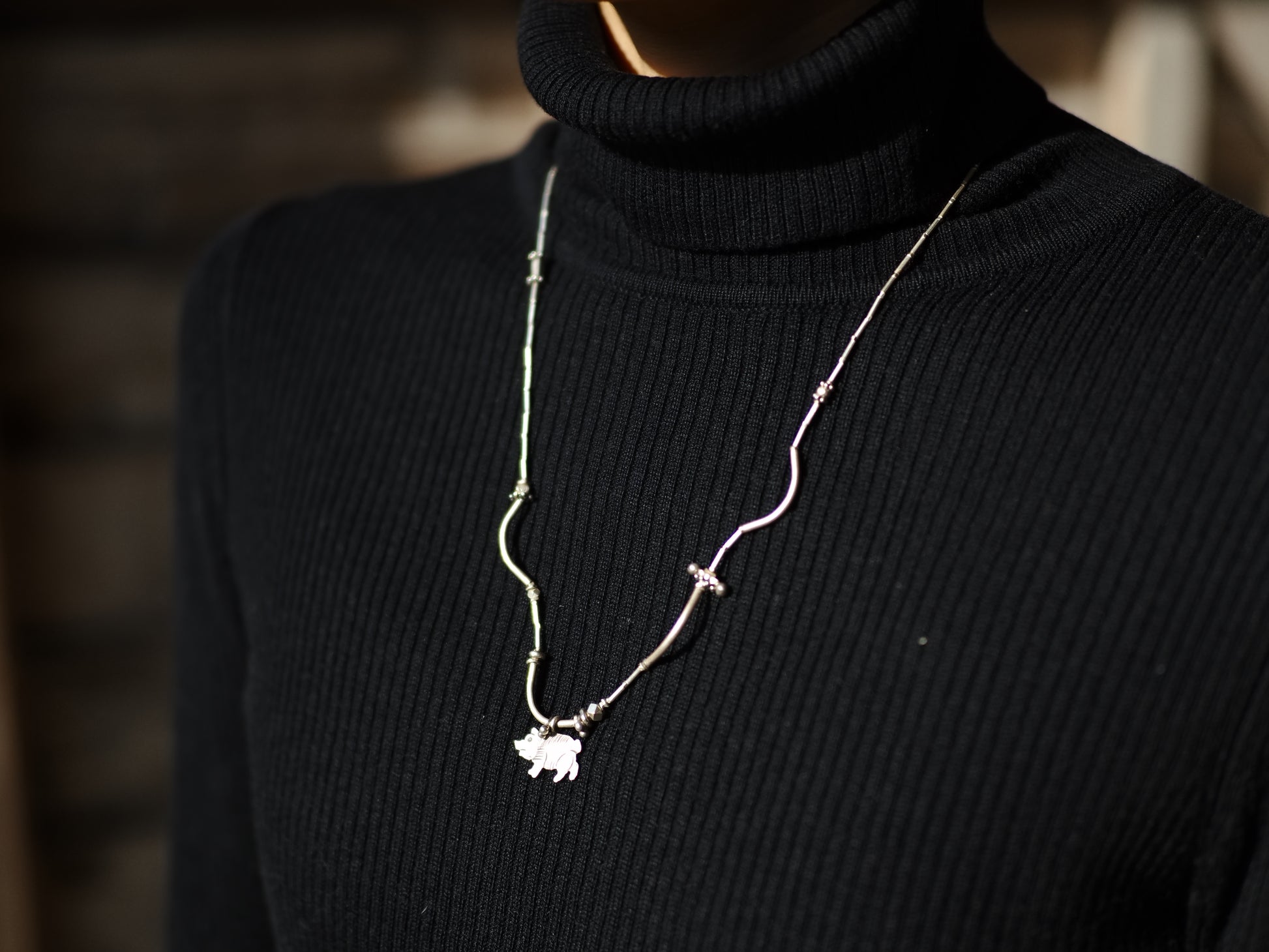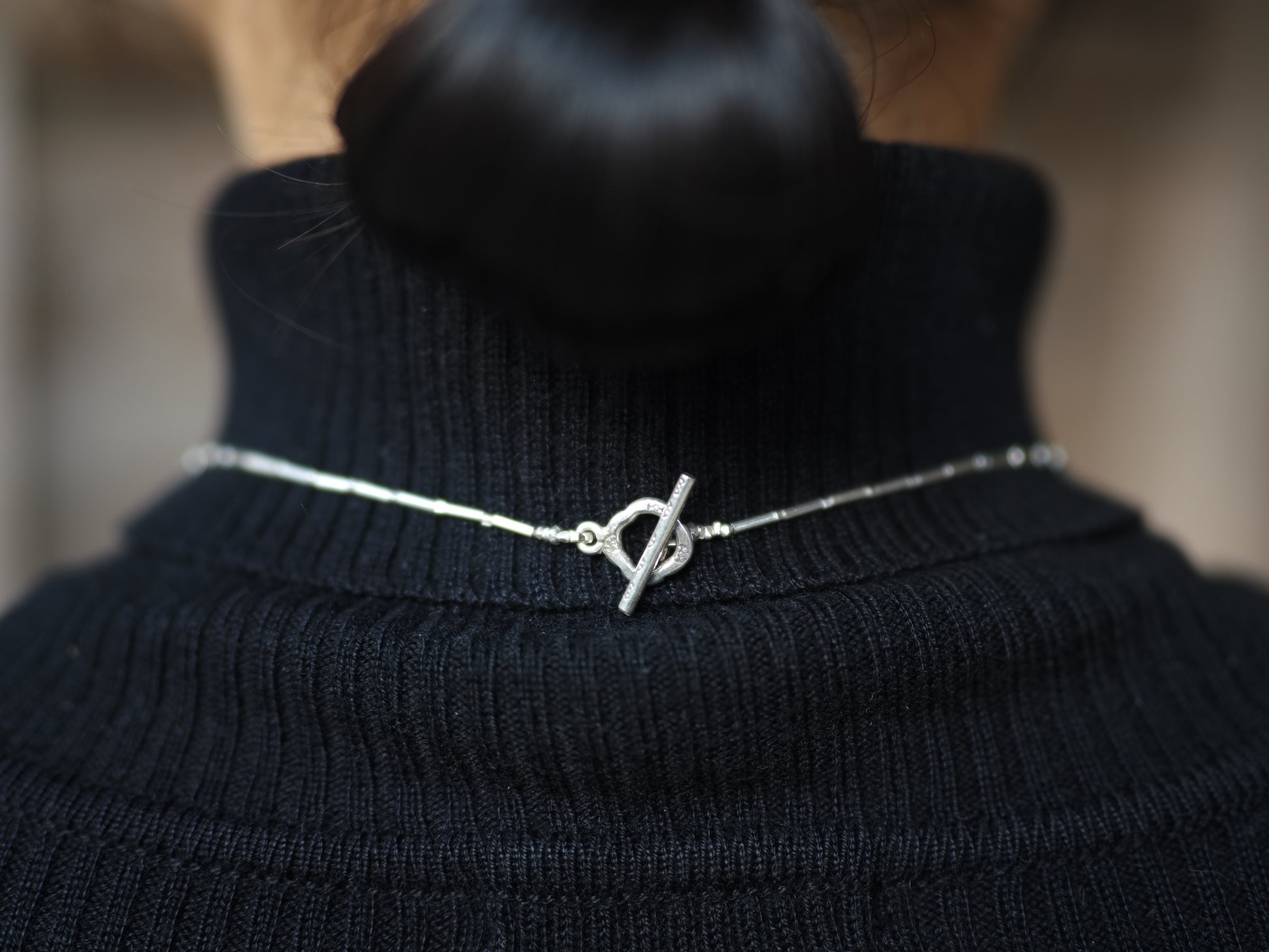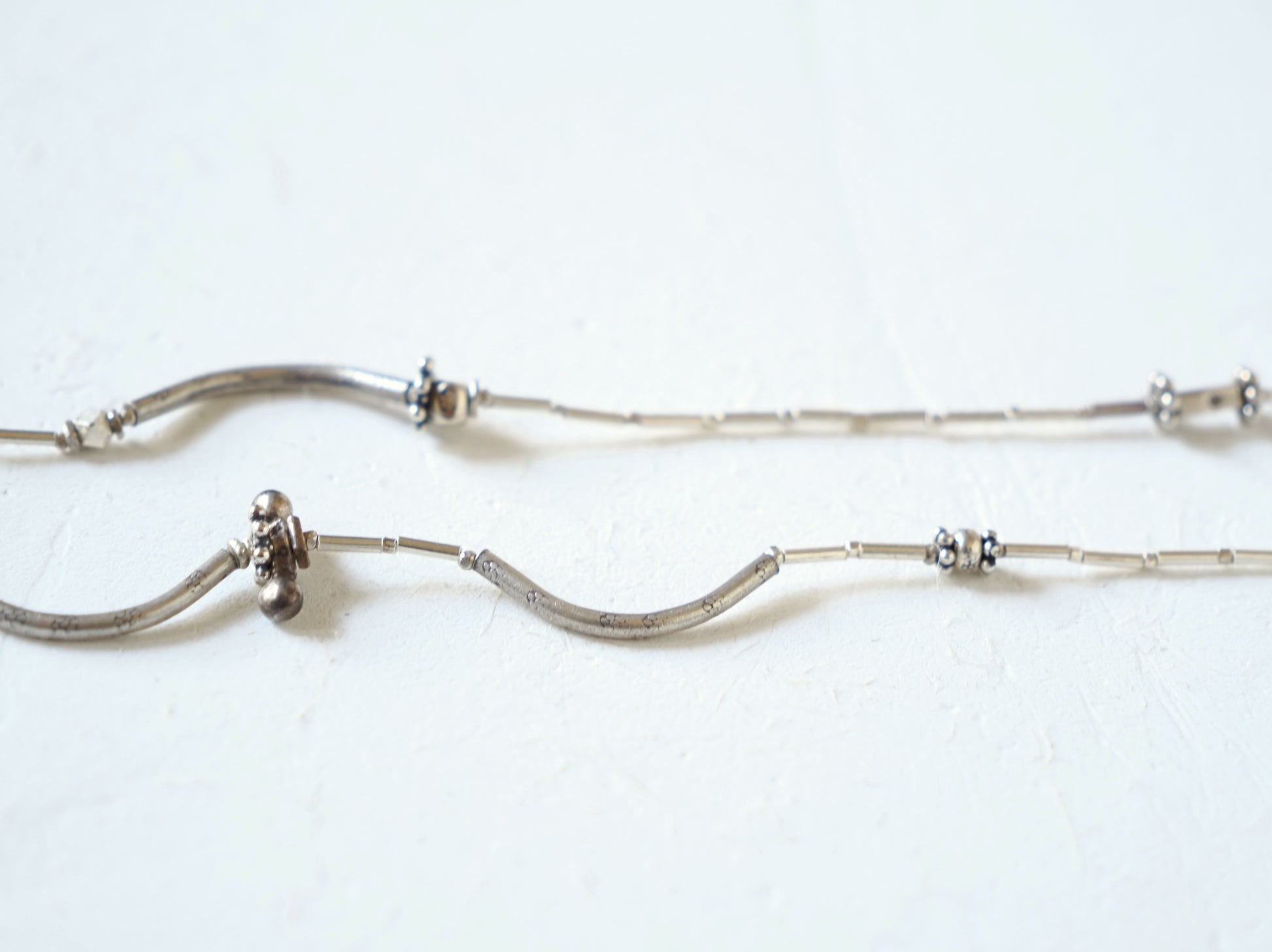 シルエットが眼を引く湾曲チューブや、その他数種類のシルバー素材をアシンメトリーに組み合わせ、繊細かつ特別感のあるセミロングネックレスに仕立てました。