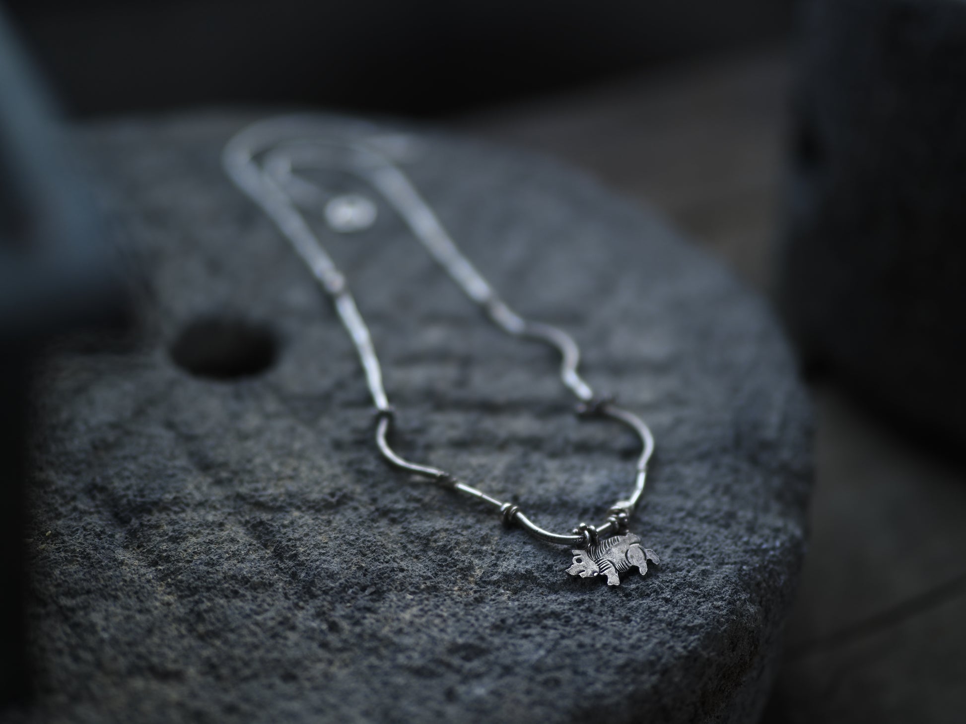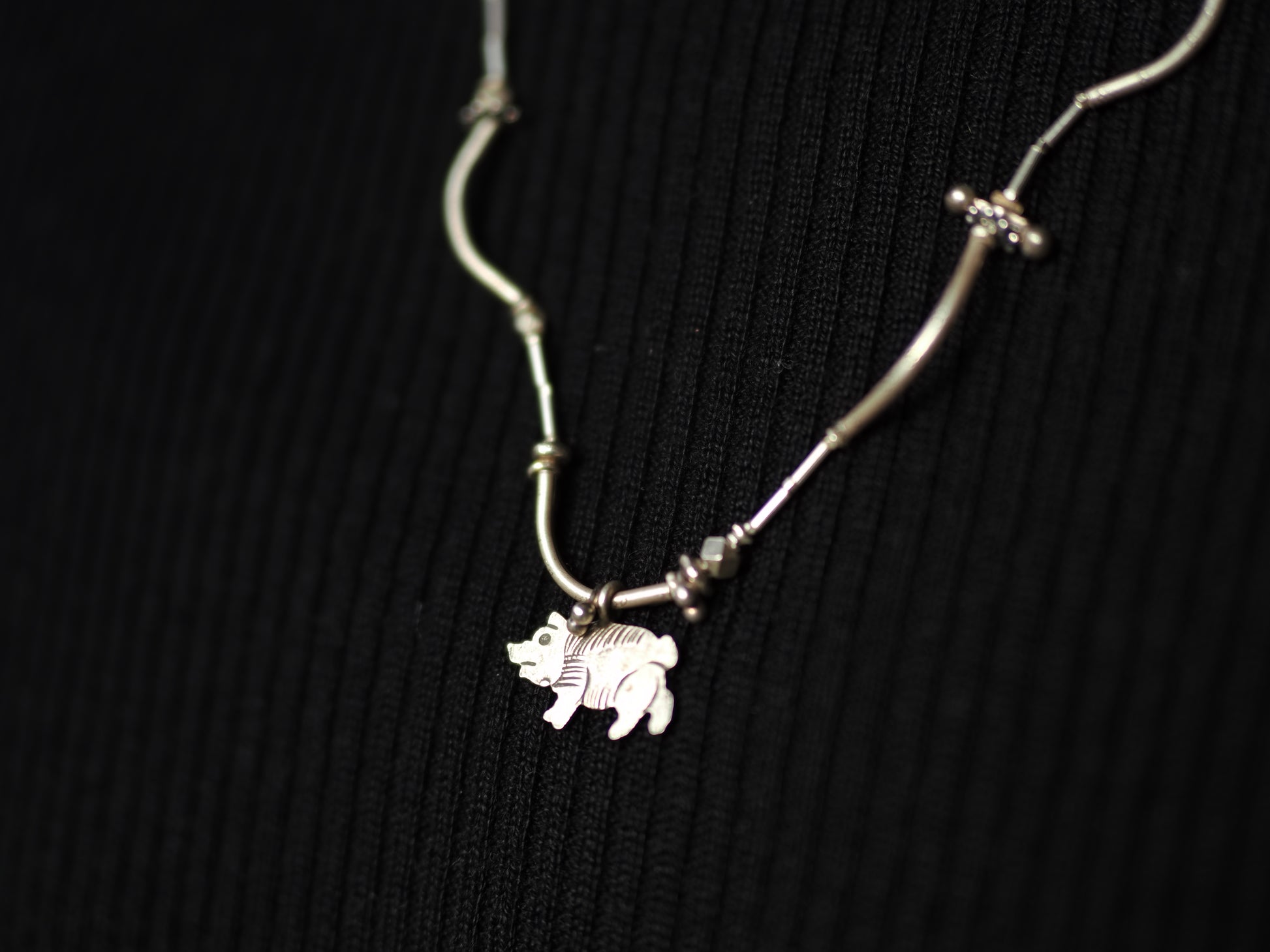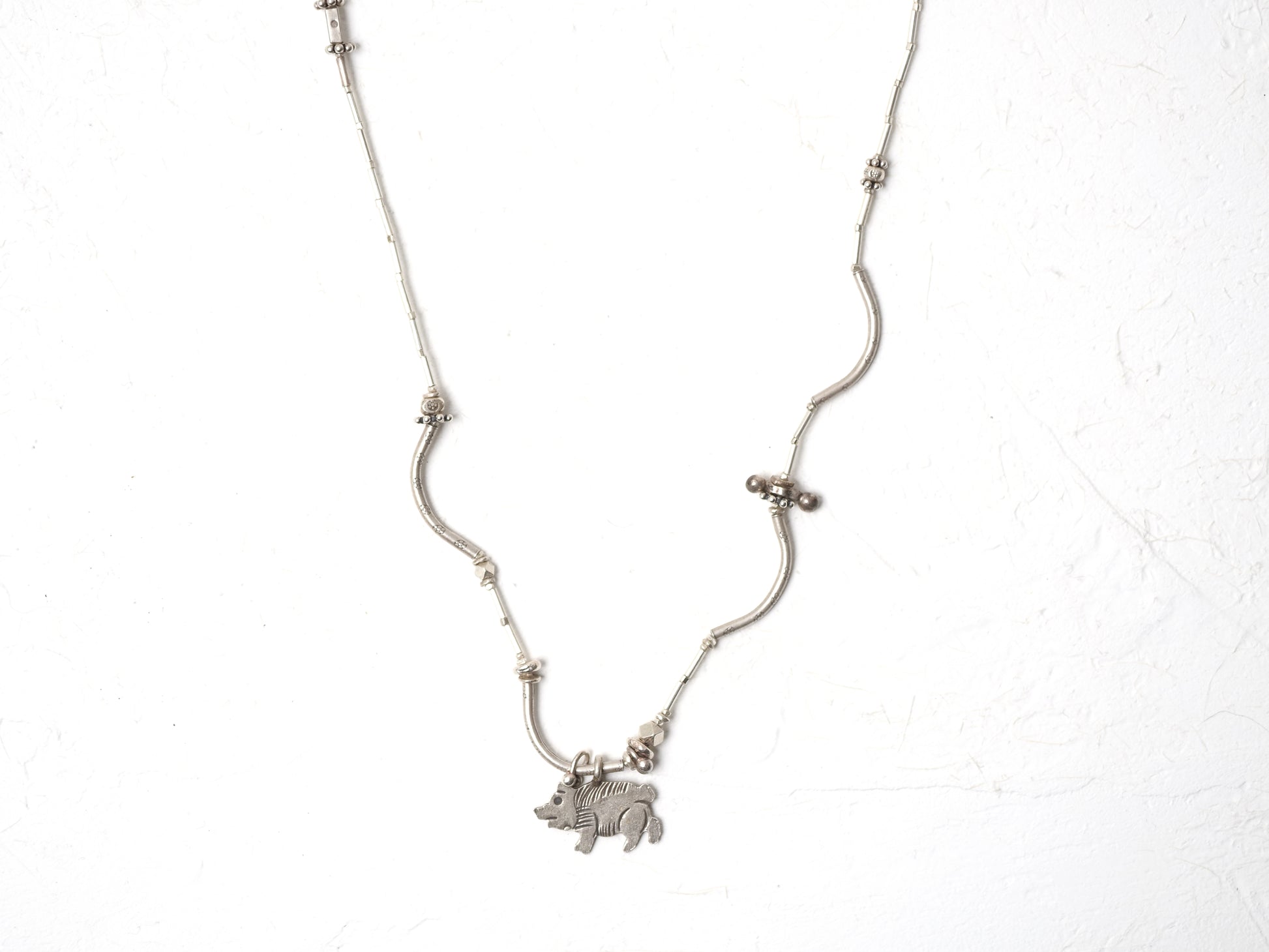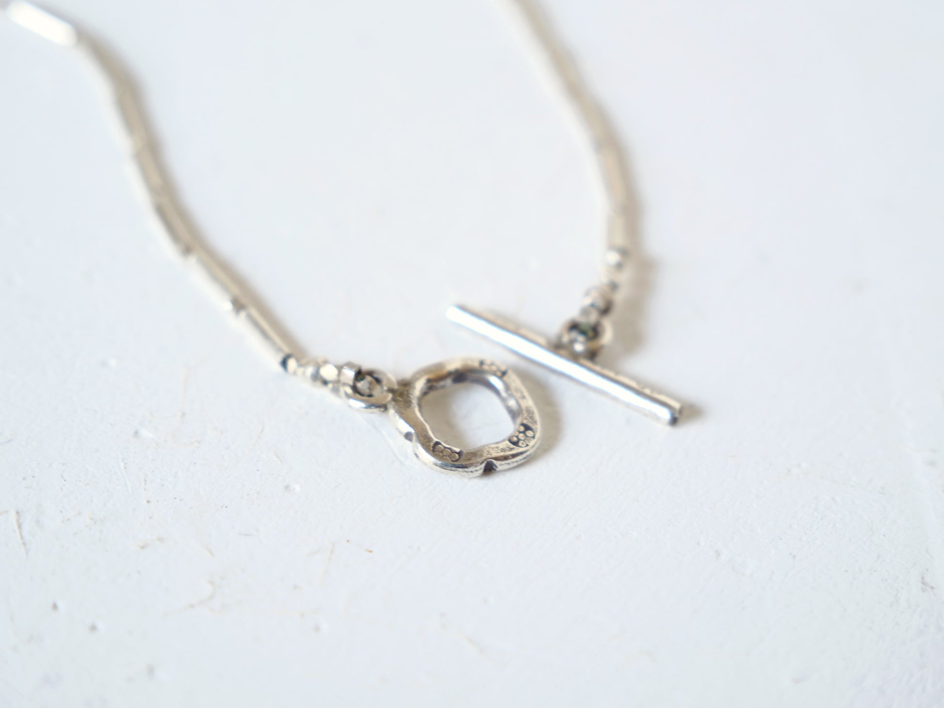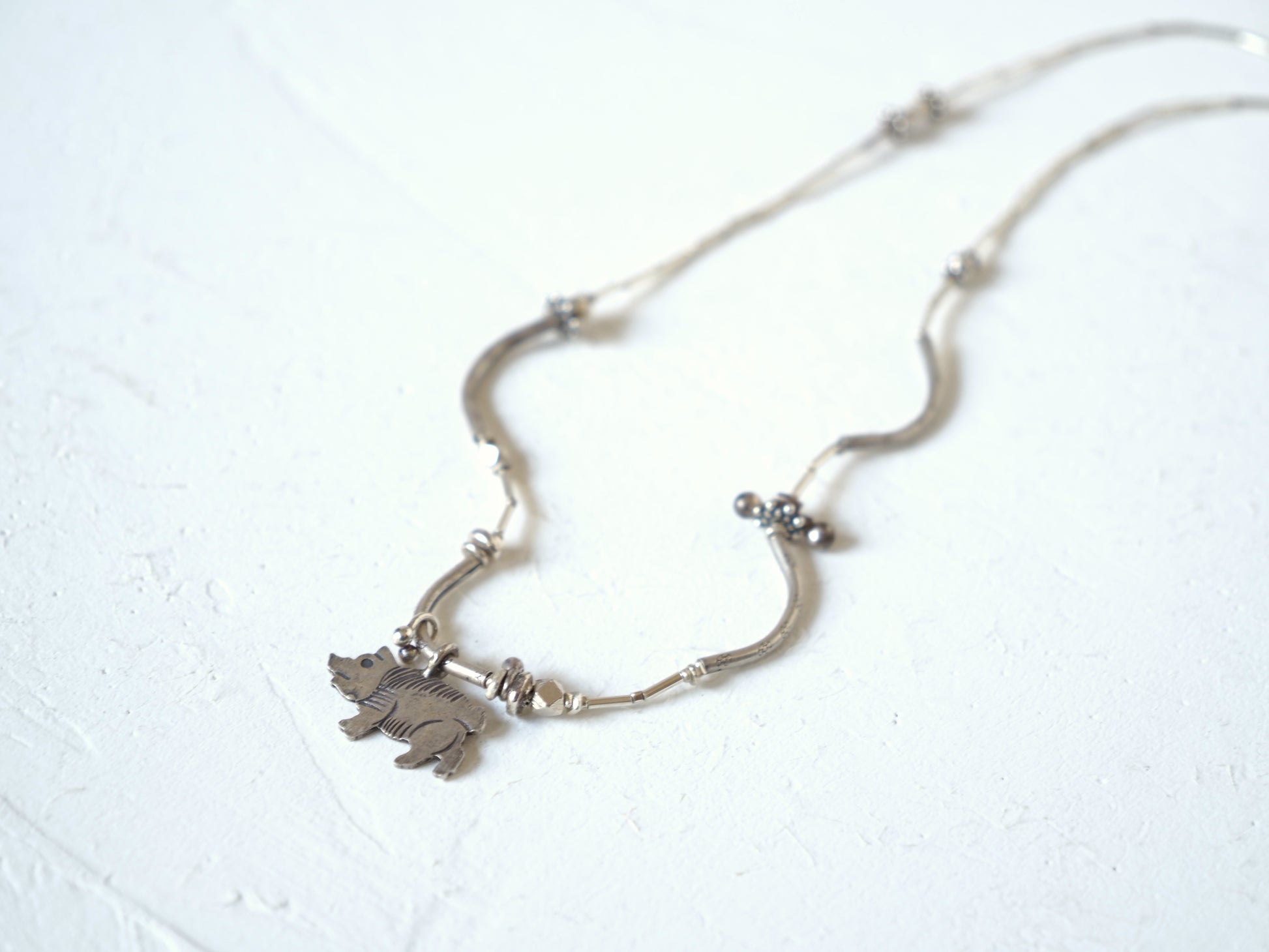 シルエットが眼を引く湾曲チューブや、その他数種類のシルバー素材をアシンメトリーに組み合わせ、繊細かつ特別感のあるセミロングネックレスに仕立てました。