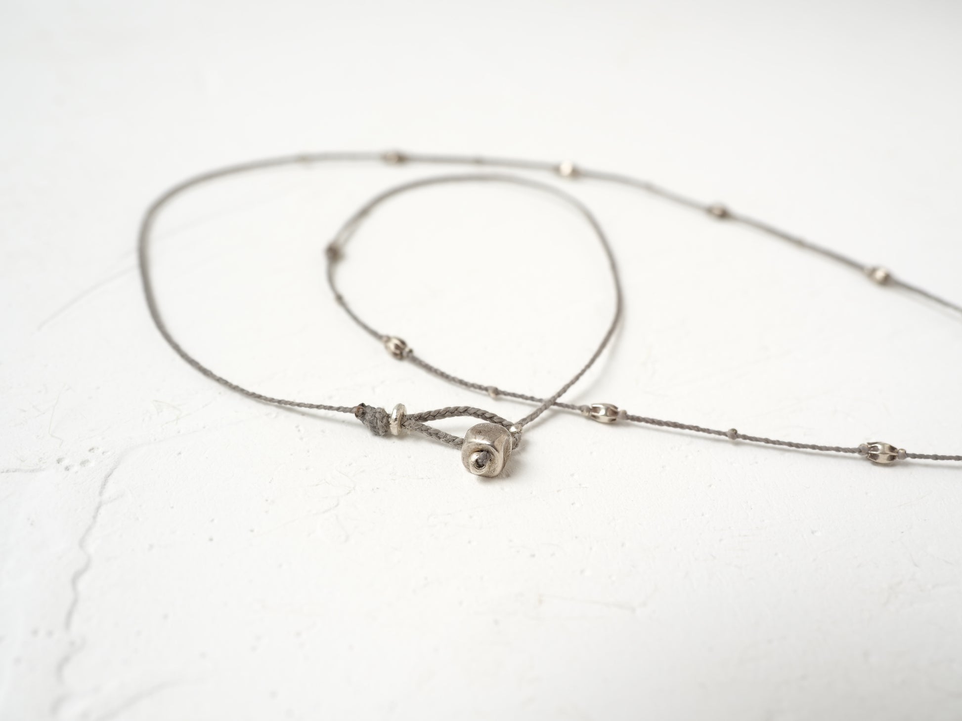 グレーの編み紐にシルバービーズで装飾を施し、セミロングのペンダントに仕立てました。