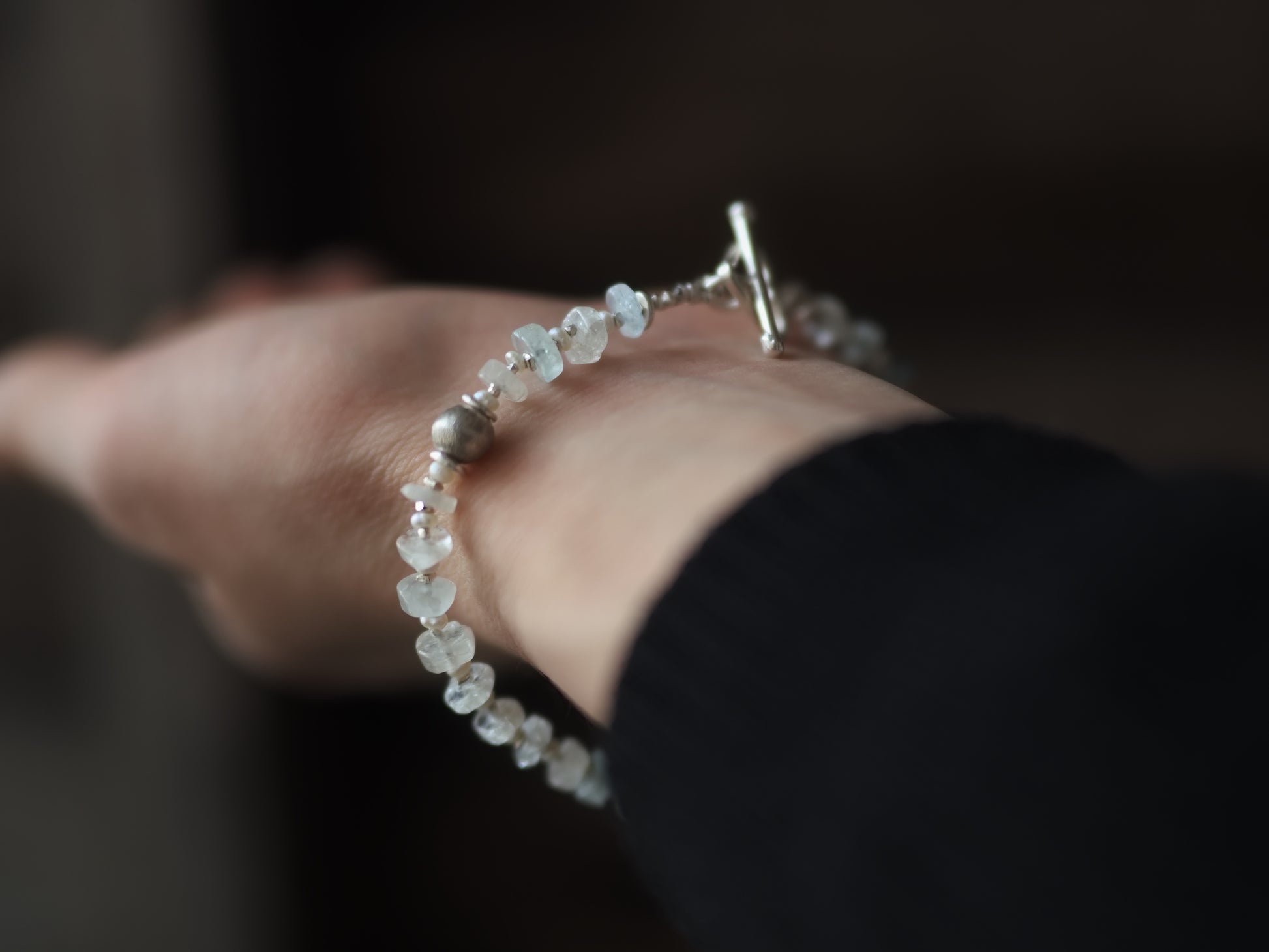 形の不揃いのムーンストーン・ロンデルと淡水ケシパール、極小シルバービーズを組み合わせ、優しい色味とシルエットが目をひく天然石ブレスレットに仕立てました。