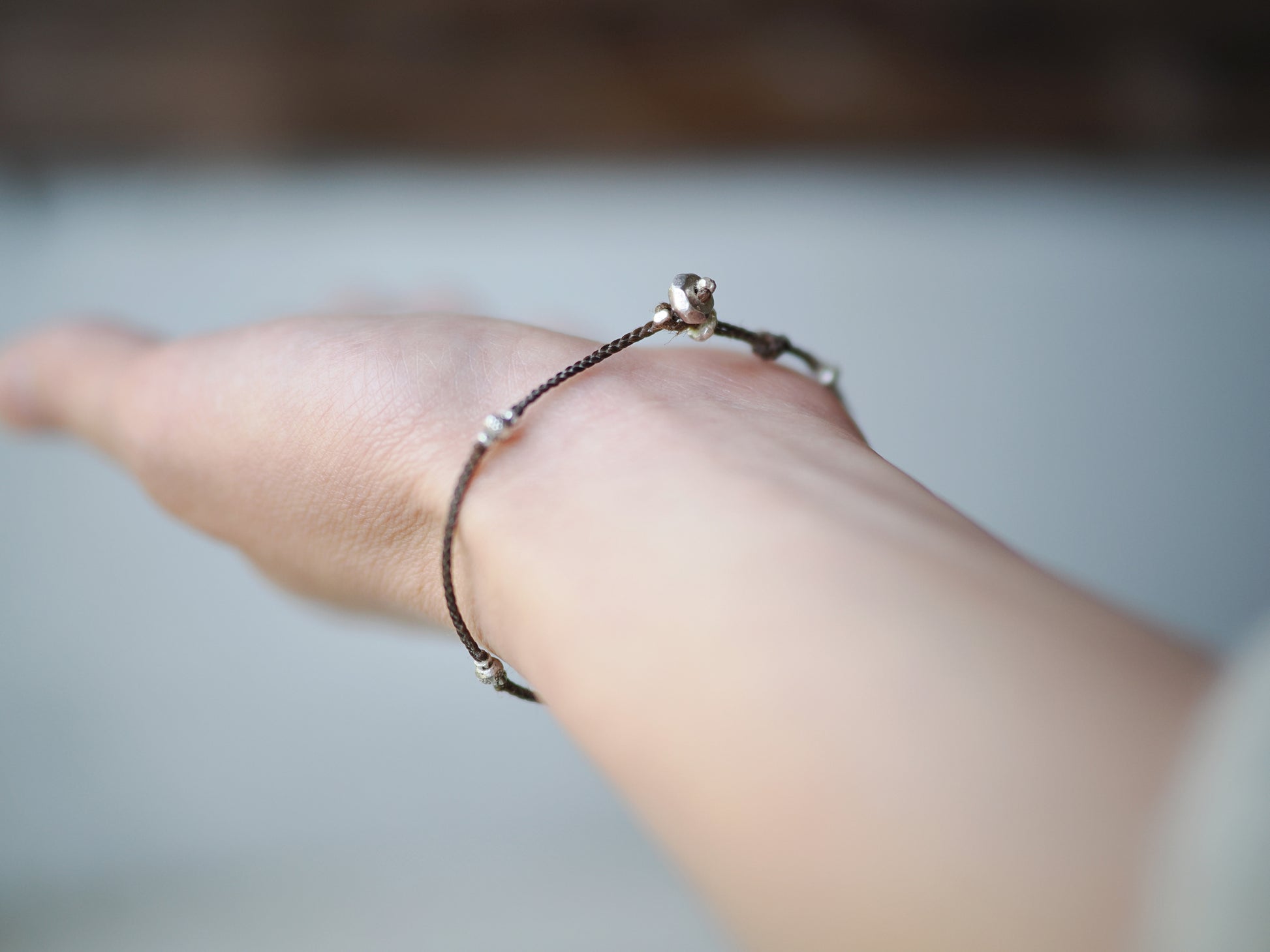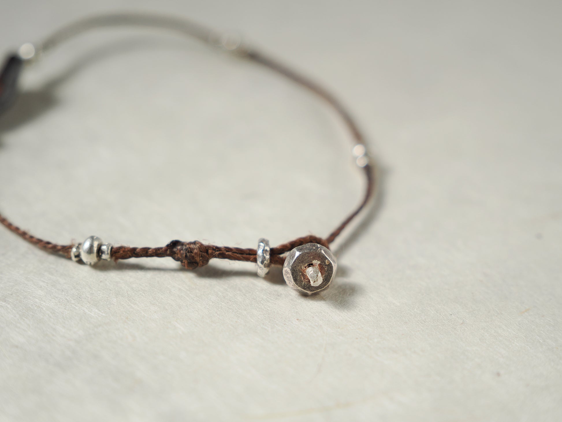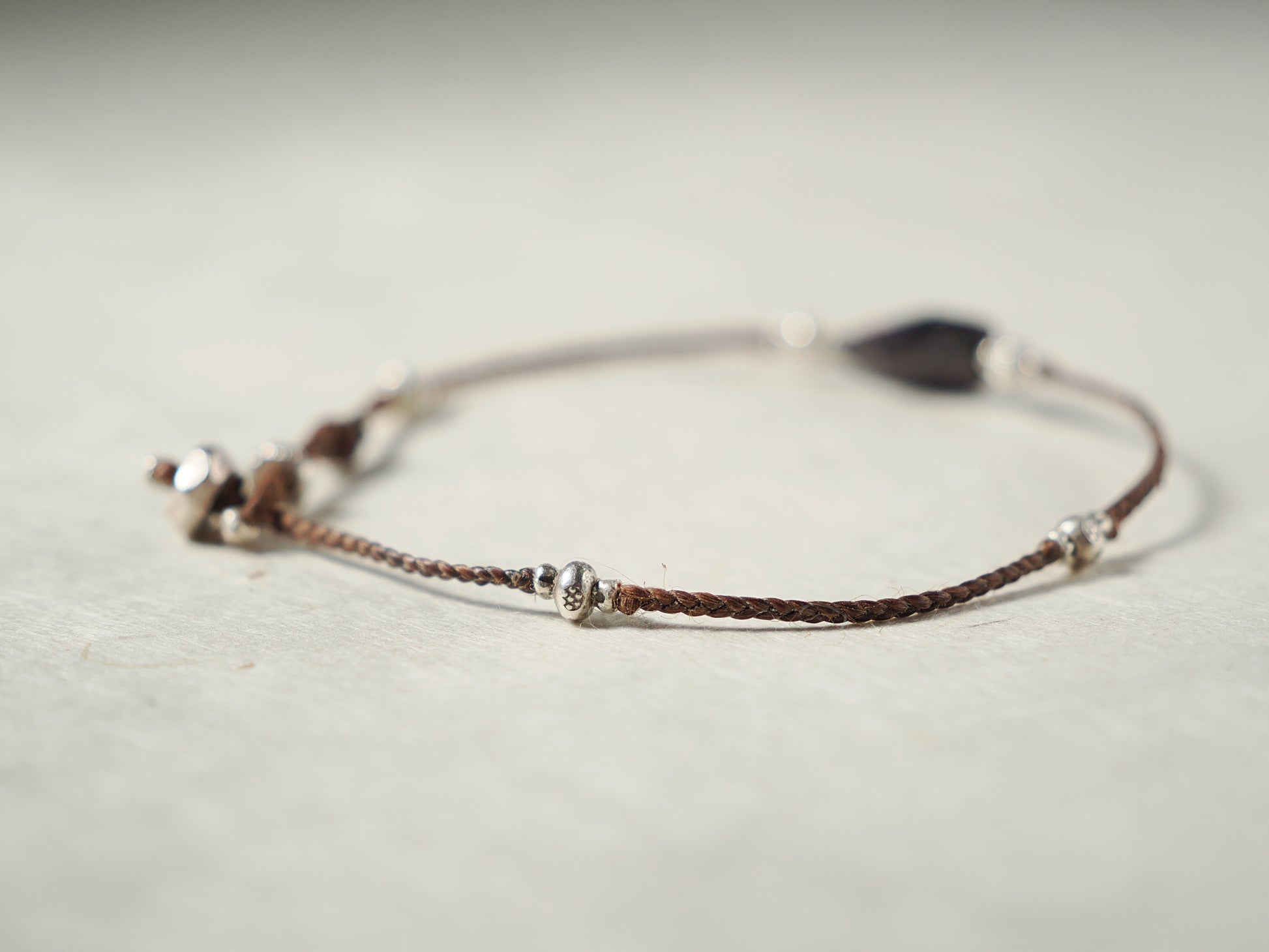 焦茶色の編み紐をベースにカレンシルバー・ビーズを散りばめ、カジュアルな印象のブレスレットに仕立てました。