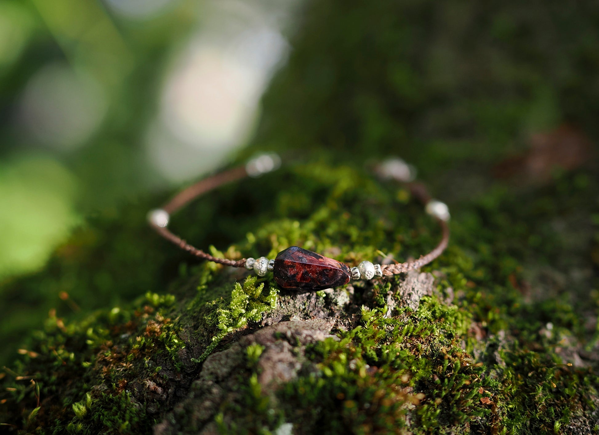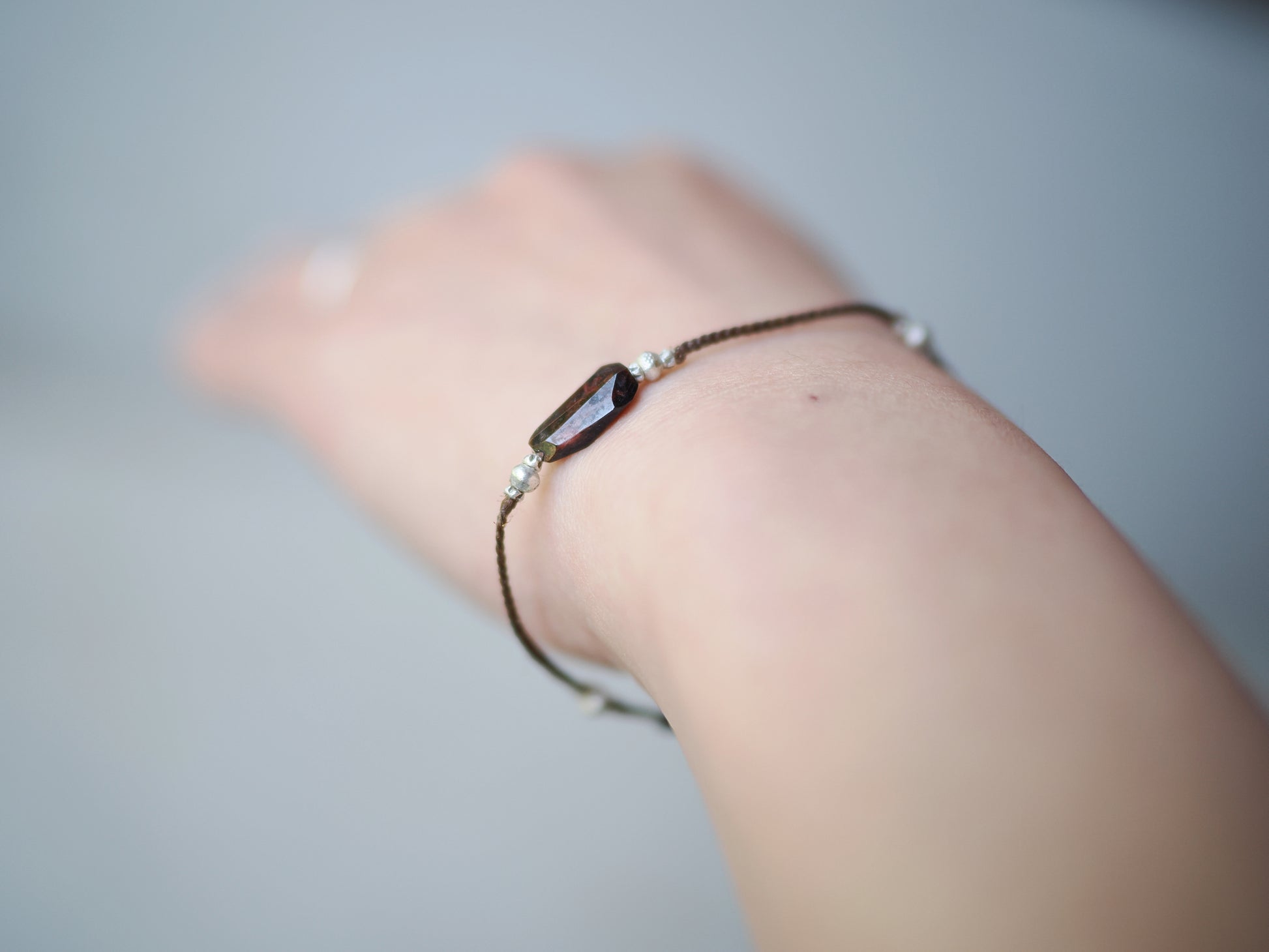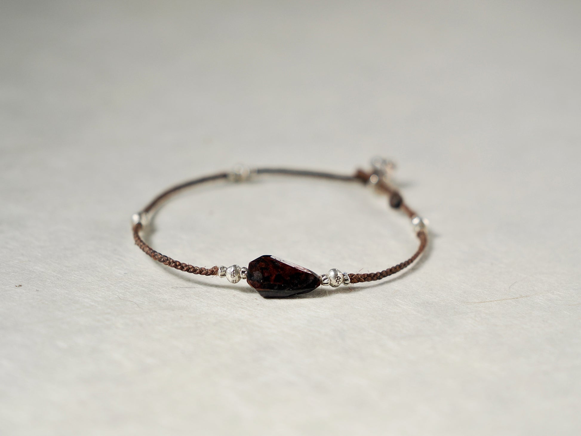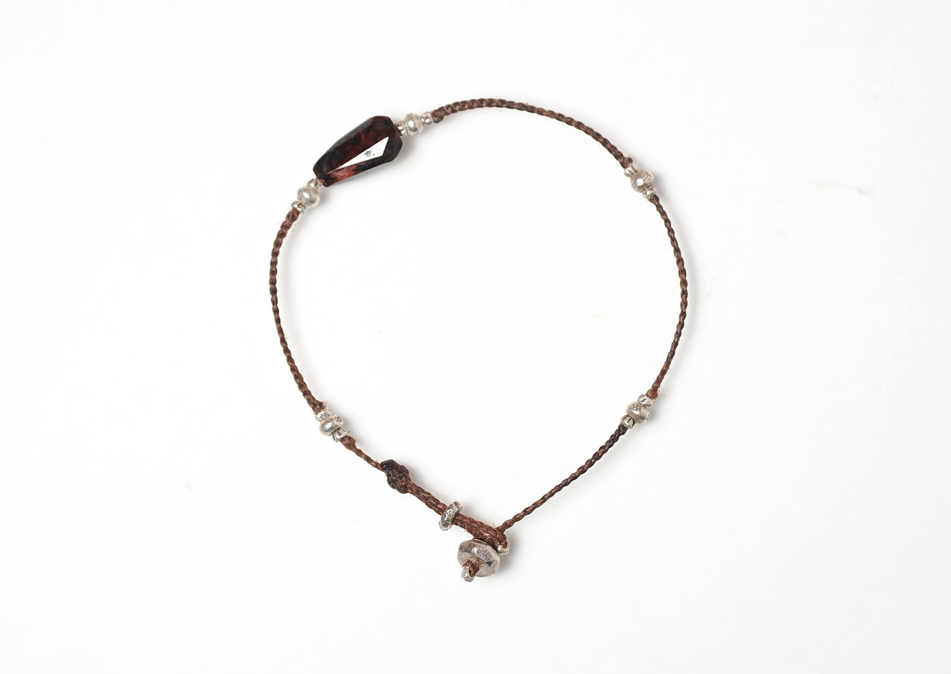 焦茶色の編み紐をベースにカレンシルバー・ビーズを散りばめ、カジュアルな印象のブレスレットに仕立てました。